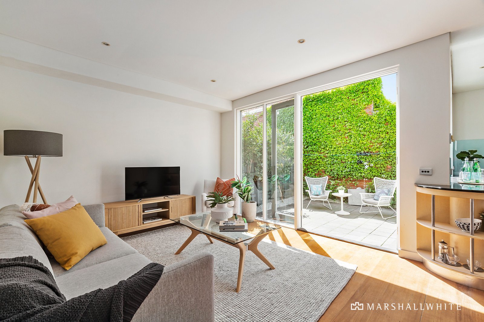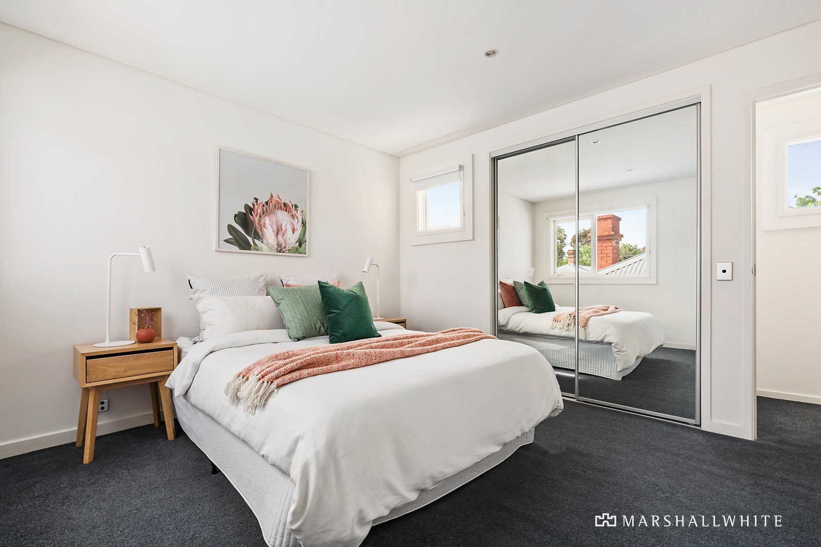 The entrance hall featuring high ceilings introduces two good-sized bedrooms and a central bathroom with adjacent laundry. The open plan living room with entertainers kitchen open through double doors to sunny North facing terrace and upstairs features a master bedroom with ensuite and robes.
