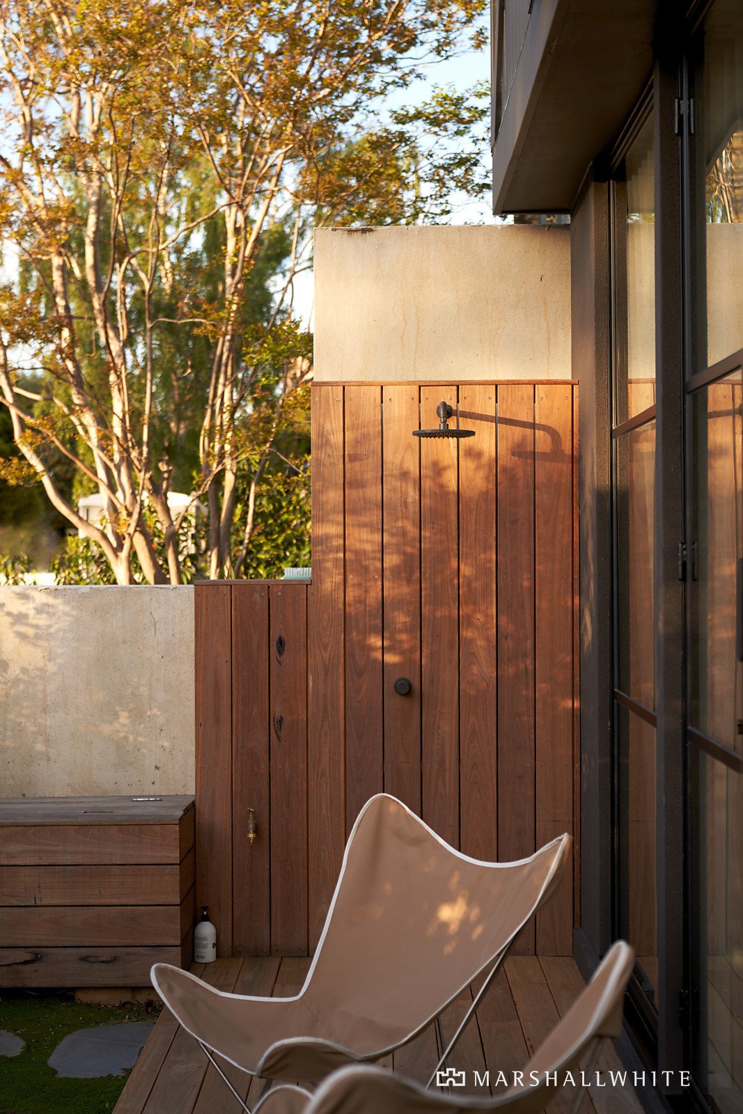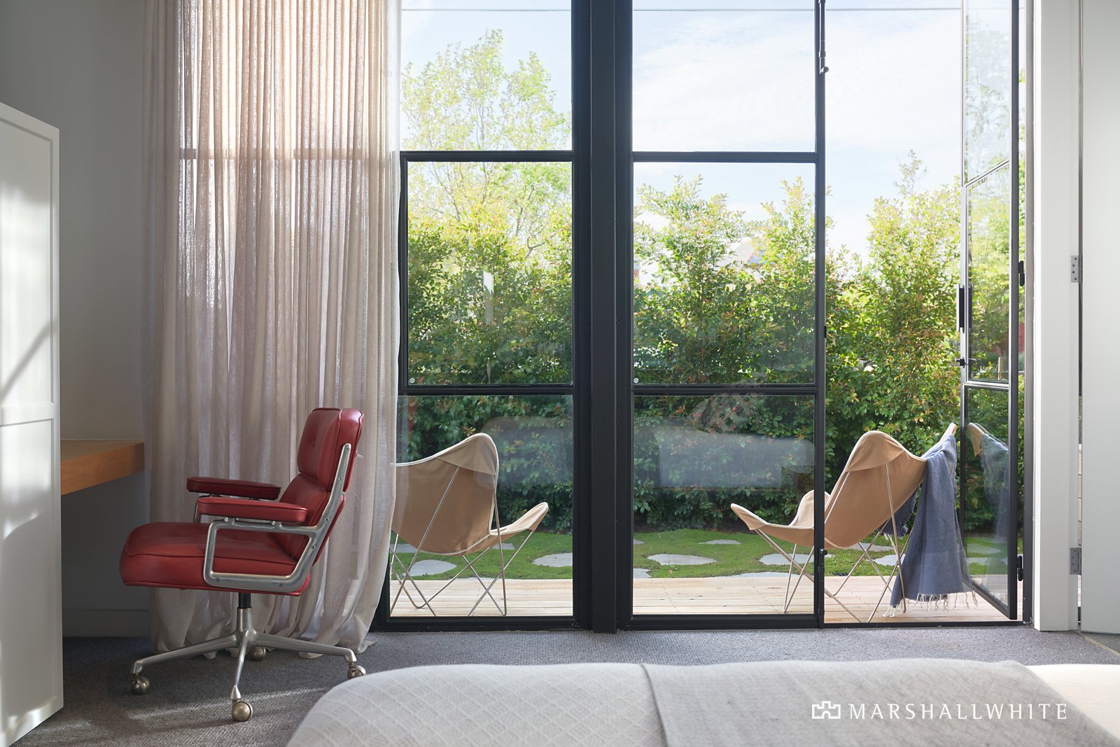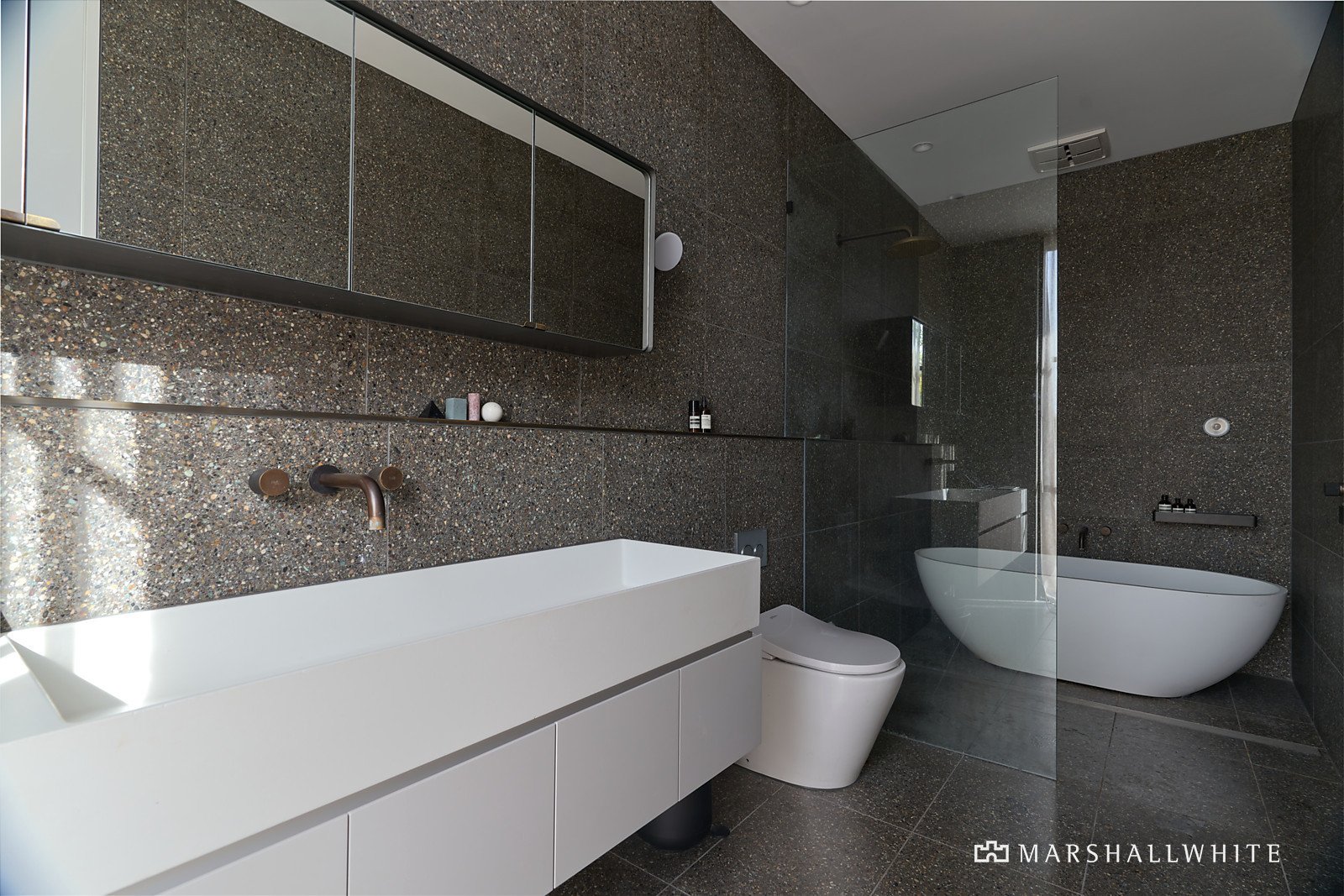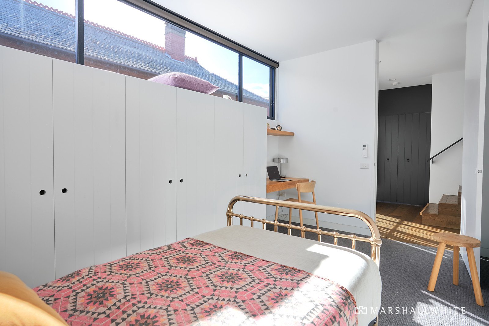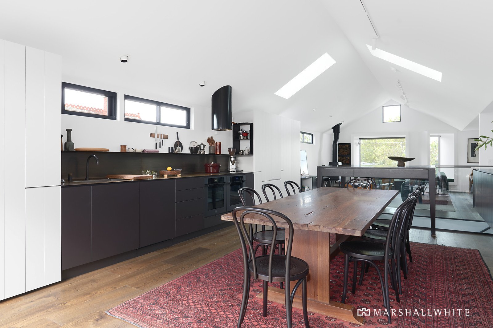 Behind a striking exterior profile, the interior dimensions showcase bespoke finishes throughout. Customised joinery using aged brass and black steel sets a benchmark in contemporary design while beautiful oak floors add an evocative warmth. The sensible reverse floor plan maximises natural light, leafy outlooks and a sense of privacy. On the ground level, two gorgeous bedrooms with built in robes and an ultra stylish bathroom complement the stunning main bedroom with desk, built in robe and a lavish en suite complete with hand crafted concrete basin, terrazzo tiles and a stone bath. The main bedroom also opens through black steel framed doors to a tranquil landscaped garden with an outdoor shower. Vaulted ceilings upstairs accentuate the sense of space and light in the spectacular open plan living and dining room featuring evocative broad window seats, a library area with fitted desk, a SkanTherm wood fire and large built-in breakfast table. The state of the art kitchen boasts aged brass benches, Asko appliances and integrated fridge/freezer. Bi-fold doors connect the indoors to a fabulous northwest deck with built in seating, ideal for al fresco dining.