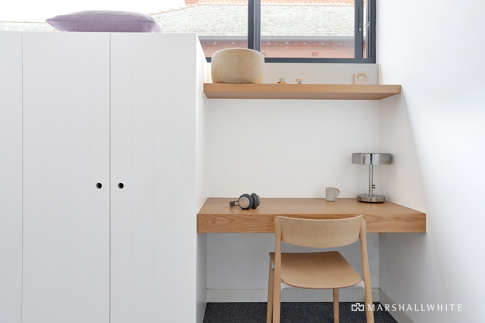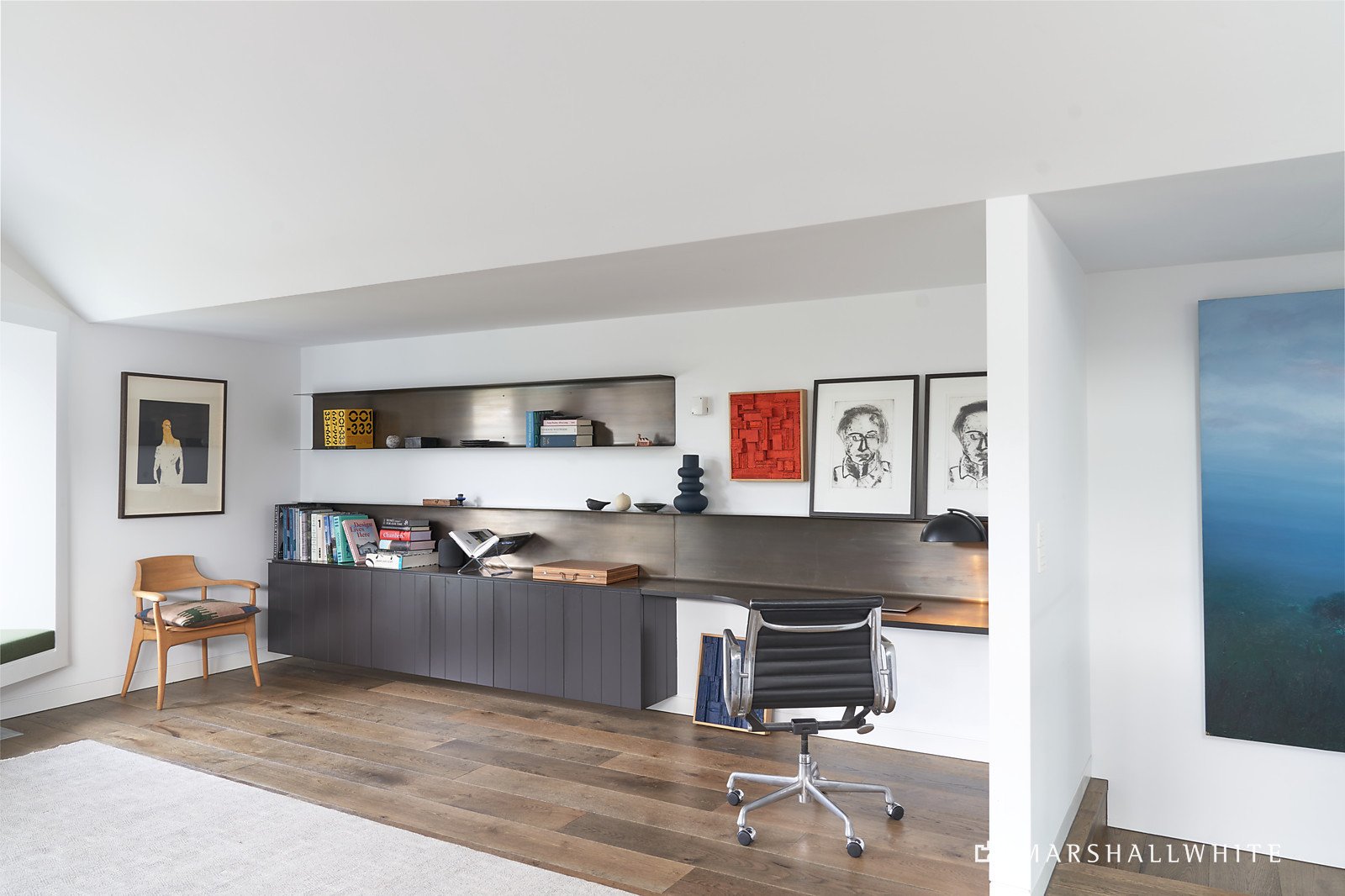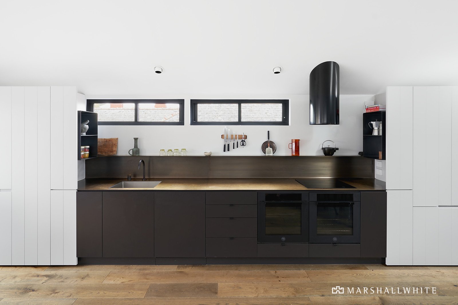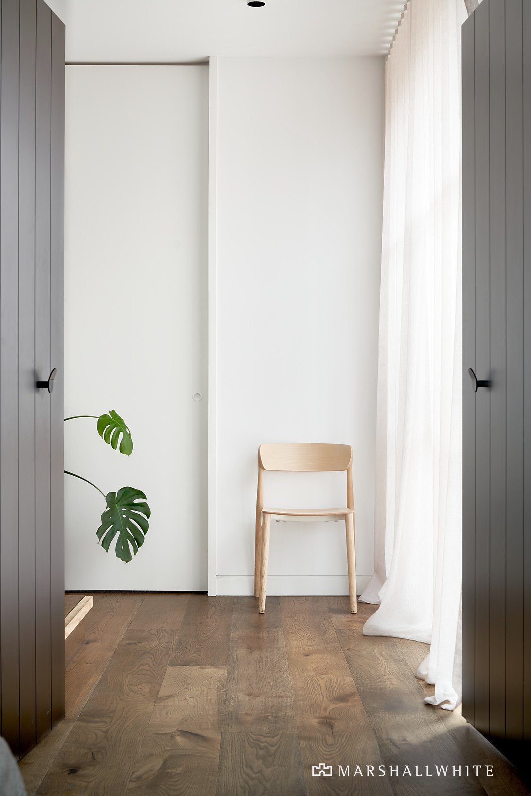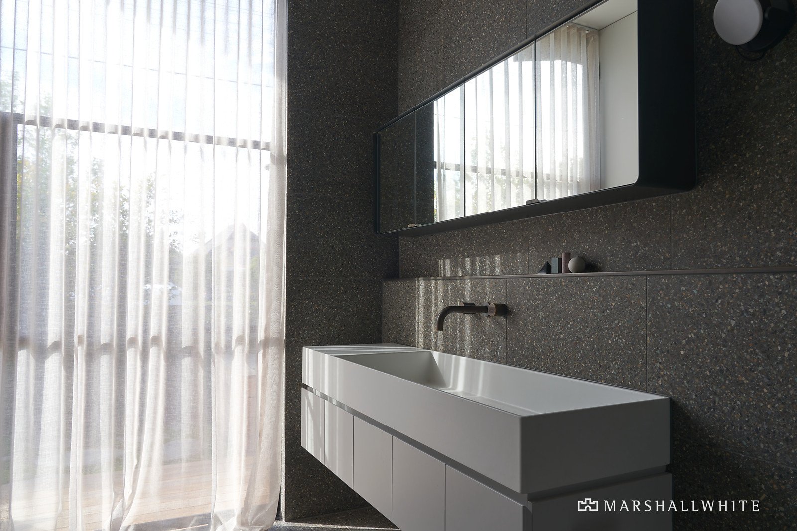 Behind a striking exterior profile, the interior dimensions showcase bespoke finishes throughout. Customised joinery using aged brass and black steel sets a benchmark in contemporary design while beautiful oak floors add an evocative warmth. The sensible reverse floor plan maximises natural light, leafy outlooks and a sense of privacy. On the ground level, two gorgeous bedrooms with built in robes and an ultra stylish bathroom complement the stunning main bedroom with desk, built in robe and a lavish en suite complete with hand crafted concrete basin, terrazzo tiles and a stone bath. The main bedroom also opens through black steel framed doors to a tranquil landscaped garden with an outdoor shower. Vaulted ceilings upstairs accentuate the sense of space and light in the spectacular open plan living and dining room featuring evocative broad window seats, a library area with fitted desk, a SkanTherm wood fire and large built-in breakfast table. The state of the art kitchen boasts aged brass benches, Asko appliances and integrated fridge/freezer. Bi-fold doors connect the indoors to a fabulous northwest deck with built in seating, ideal for al fresco dining.