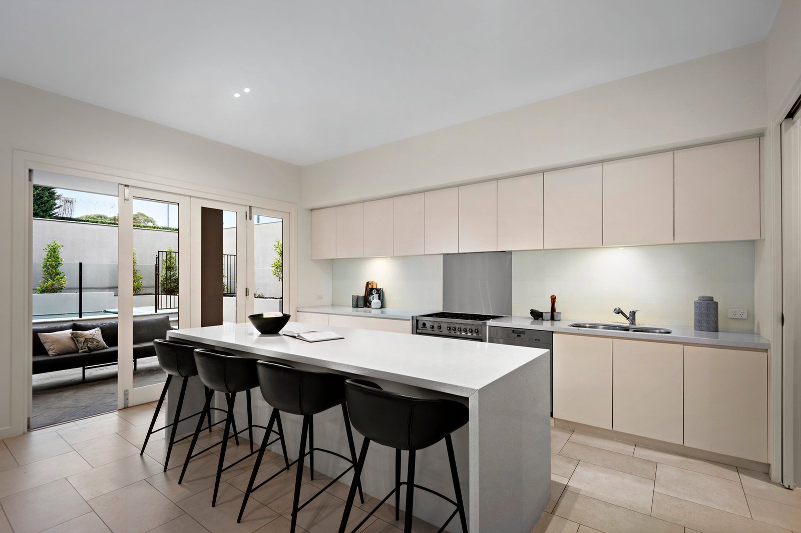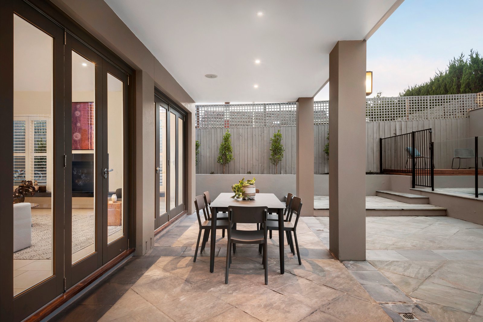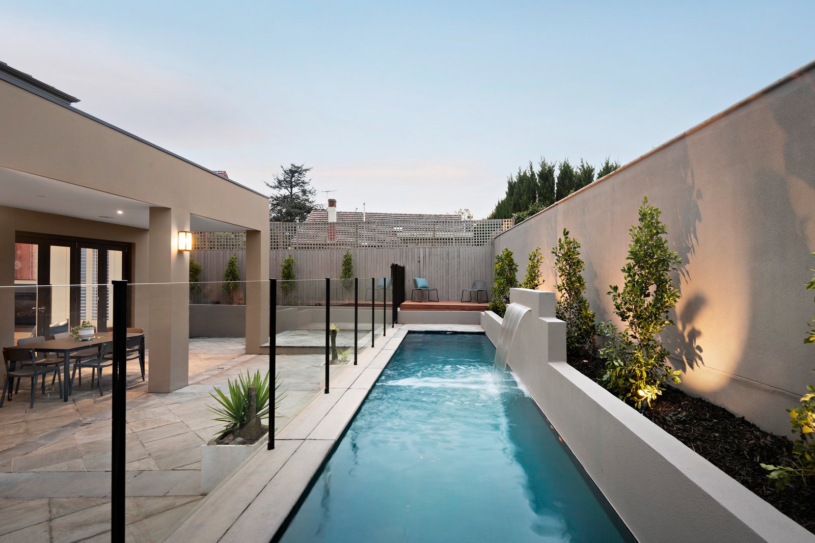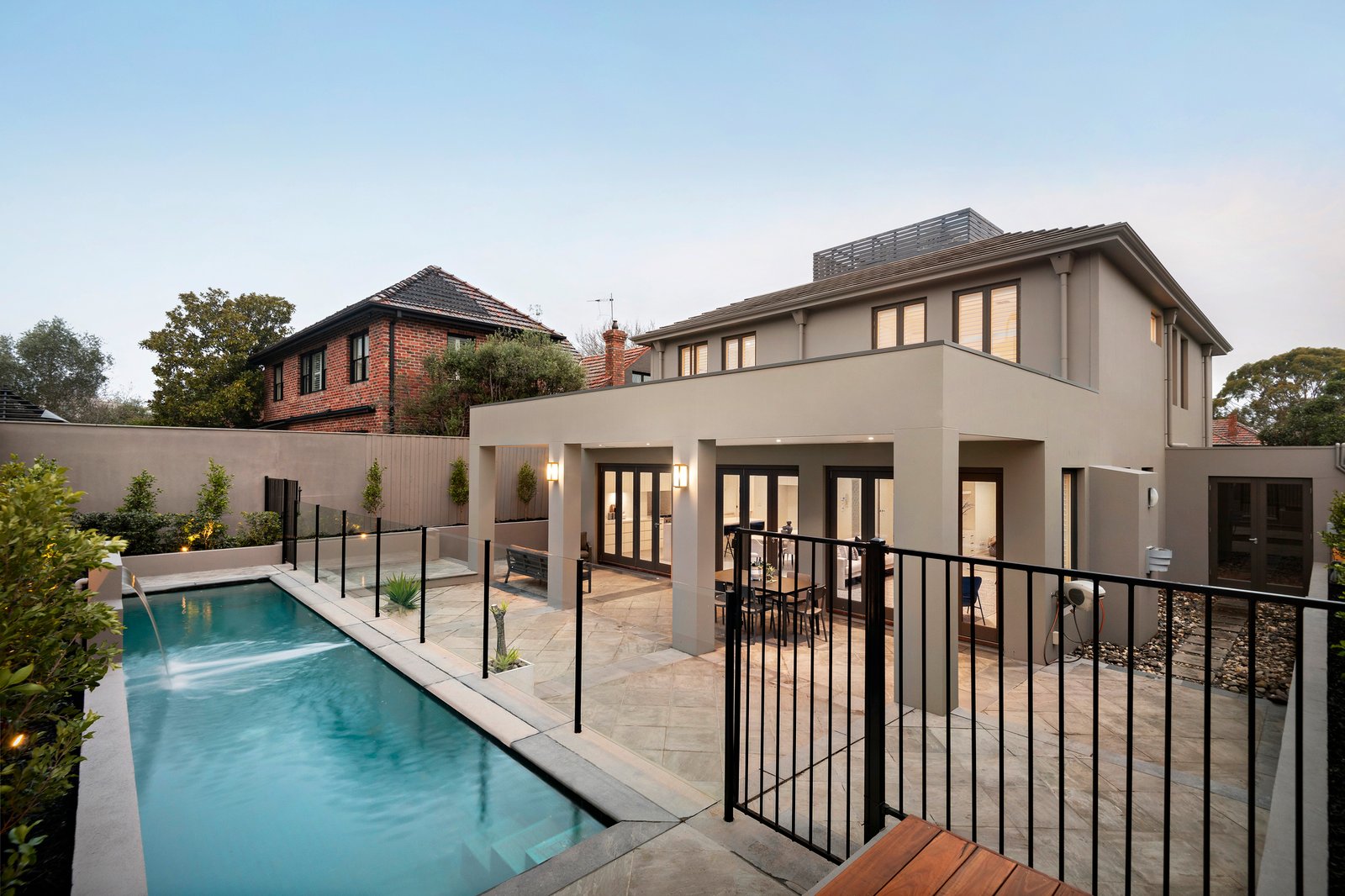 The ground floor comprises an open formal living and dining area, situated opposite a spacious guest bedroom or home office. The open-plan family living zone seamlessly transitions through three sets of French doors to the north-facing garden, elegant paved undercover alfresco area and a sparkling heated lap pool. The kitchen comes equipped with high-end Miele appliances, a dishwasher and a walk-in pantry, while stone benchtops, an expansive island with breakfast bar and ample storage space confirm practicality. A superbly sound-proofed media room, a generous laundry, and an opulent bathroom complete the ground floor.