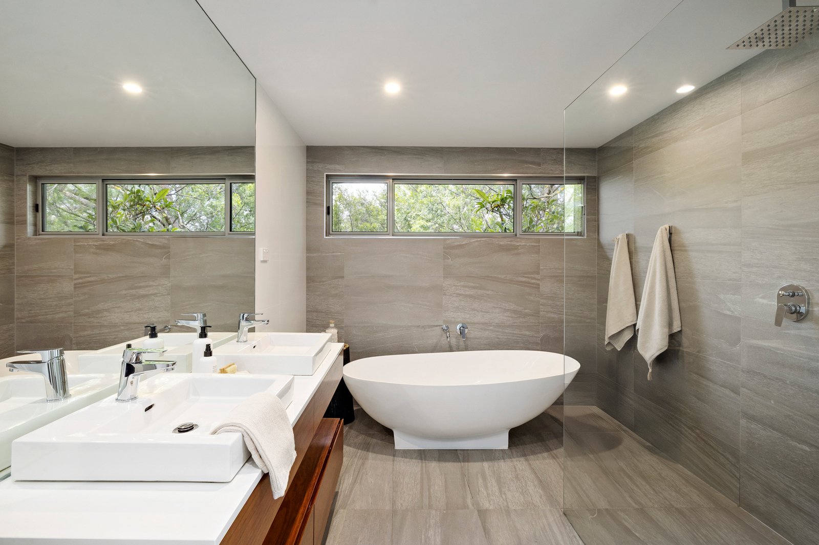 Privately set behind a high fence with dual auto-gated driveways, the unique design of the two-storey/split level dual-winged home optimises the impressive views from all the upper-level rooms. High raked ceilings, ceiling fans and hardwood timber floors endorse the coastal inspired ambience, further enhanced with newly laid loop pile wool carpets in the bedrooms, including the spacious main bedroom suite, with private balcony, walk-in robe, and floor-to-ceiling tiled ensuite with a freestanding ‘egg’ bath, walk-in shower, and twin stone/timber vanity. The sleek stone gourmet kitchen is well-equipped with a Smeg freestanding gas/electric cooker and an Asko dishwasher, while full height glass sliding doors edge the main open plan living area, connecting to the expansive alfresco entertaining terrace, with undercover area, built-in servery/bar, and stairs down to the fully tiled inground solar/gas heated mineral swimming pool and spa. There is a second living room downstairs that connects to the rear garden and pool, a built-in under-stair study nook, a laundry, and the third bathroom, which is handy for poolside entertaining.