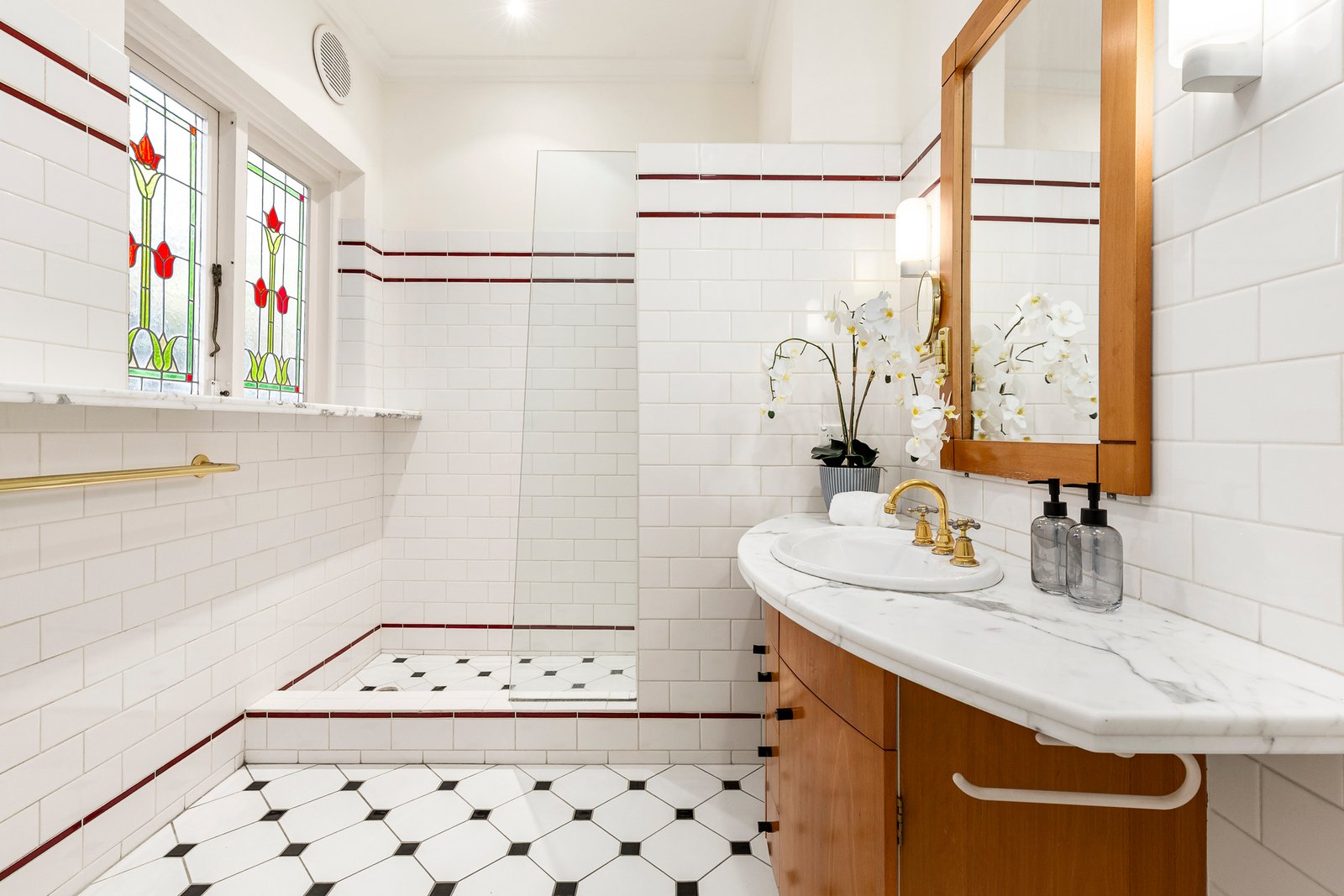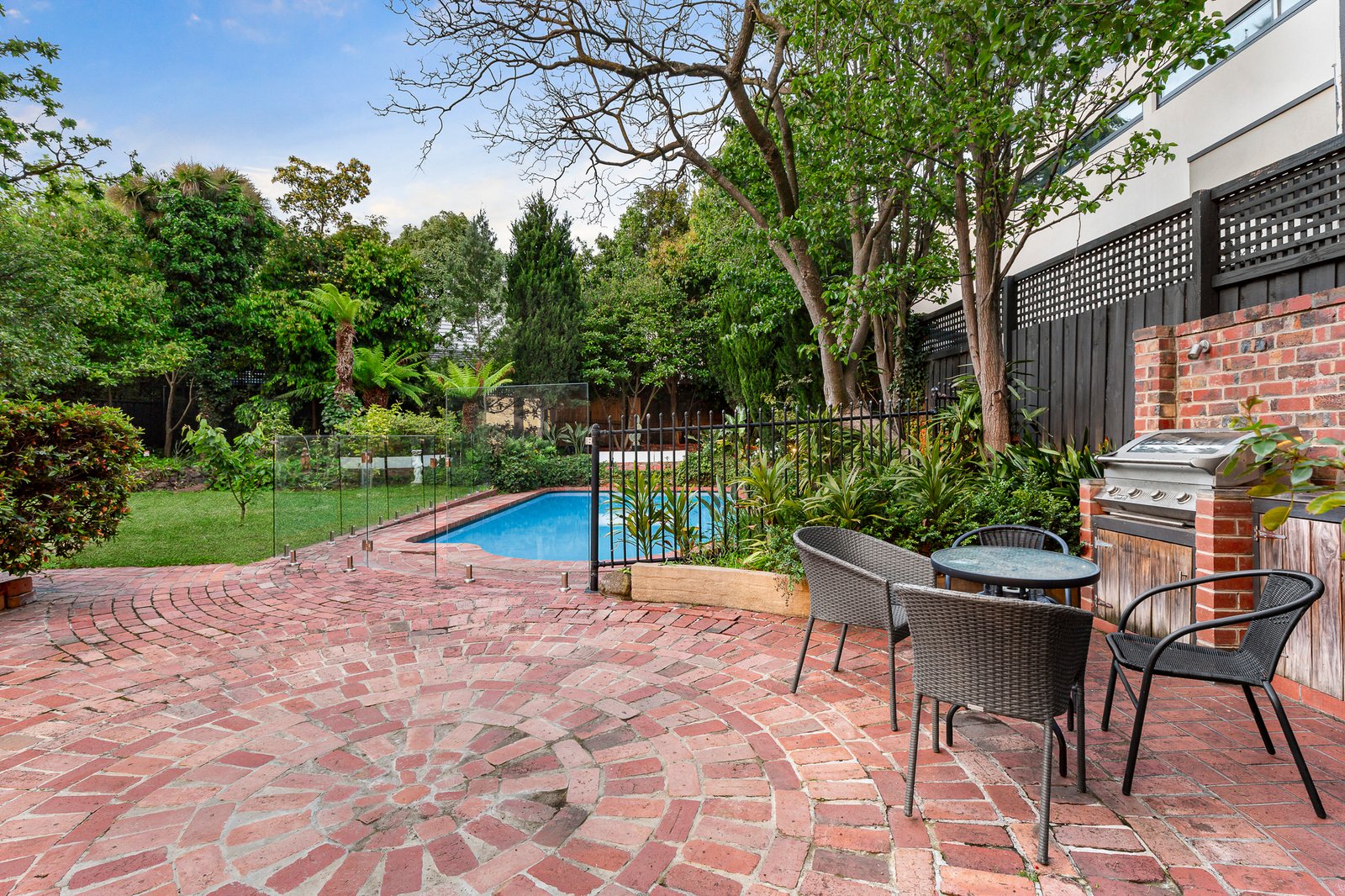 Set on a 1052*-square-metre allotment, the landmark clinker brick double-storey home’s façade is architecturally resplendent with its natural slate high pitched roof, diamond-pane leadlight windows, and Castlemaine stone chimney. Inside, the splendour continues with soaring ornate ceilings, original open fireplaces, parquetry flooring and a curved timber staircase. Centrally positioned, between three expansive living/entertaining areas, which can be individually closed-off or opened out for flow, is a newly installed gourmet kitchen, gleaming with stone benchtops and splashback, a high-end Fotile gas cook top, a Bosch convection oven and Asko dishwasher. French doors open out to the undercover deck and brick paved alfresco zone, built-in barbeque, and solar-heated self-cleaning swimming pool, surrounded by established gardens, featuring towering tree ferns and lush verdant borders. Despite the home’s age, the adaptive layout is perfect for contemporary family liveability, and features two sets of stairs offering flow and functionality. The elegant main bedroom, with built-in robes, and ensuite with marble-topped vanity, is on the ground floor, while upstairs are another four unique bedrooms, including a delightful front-facing attic room, and a large rear room with views over the treetops and pool. The main bathroom, a powder room, a study/retreat, and walk-in linen room are also on this level. There is also an additional shower/powder room with rear deck access, making it ideal for poolside entertaining, and a remote-operated garage with workshop space, and nostalgic stable doors at the rear. Additional features include a large laundry with internal access, a walk-in wet bar, central heating and cooling, security system, built in speakers, plenty of custom storage cabinetry, under stair storage and rain water tanks.