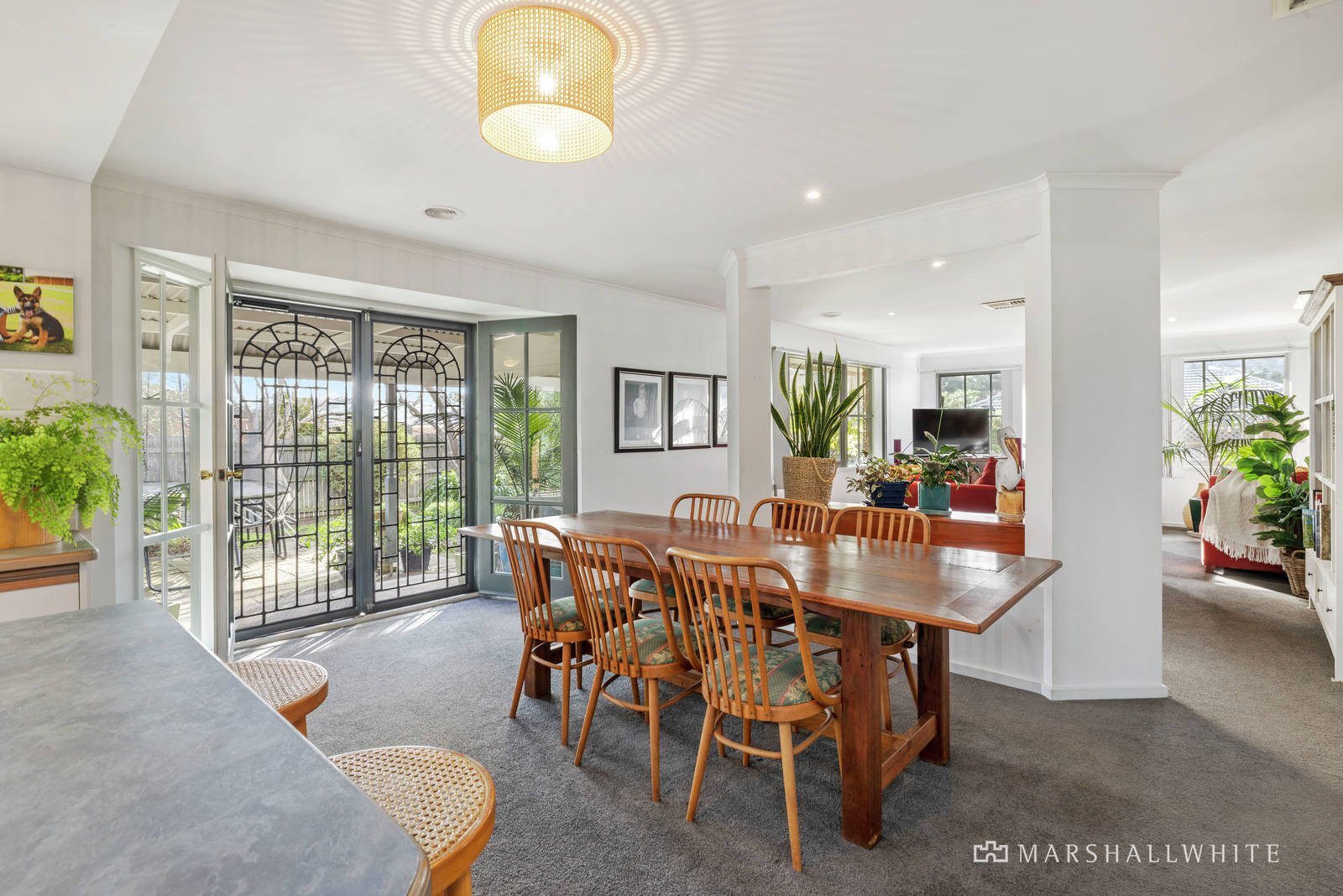 Through to the family hub; the tidy kitchen offers ample cabinetry, large pantry, wall oven, five burner gas cooktop, dishwasher and breakfast bar. The dining and family living space follow with French doors opening to the secure rear yard, ideal for kids and pets. A wide bullnose verandah provides a lovely undercover area for outdoor dining and entertaining. Established trees border the wrap around garden creating a very settled, tranquil feel.