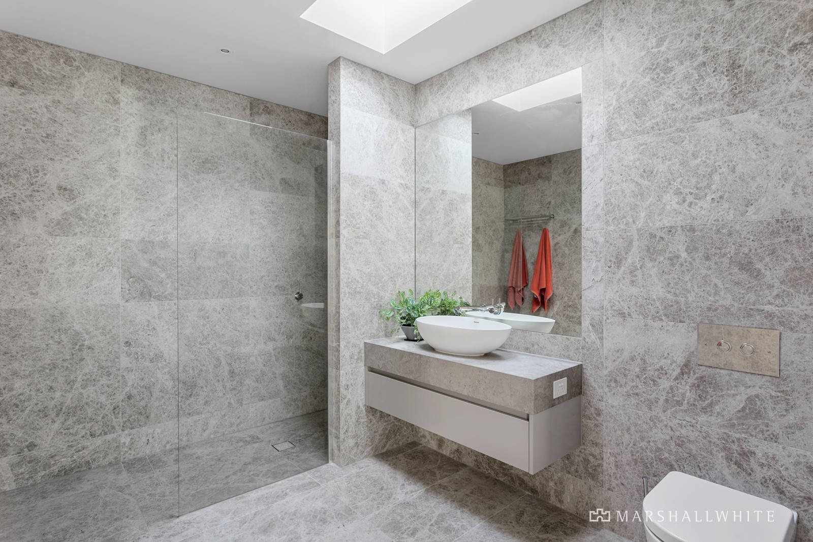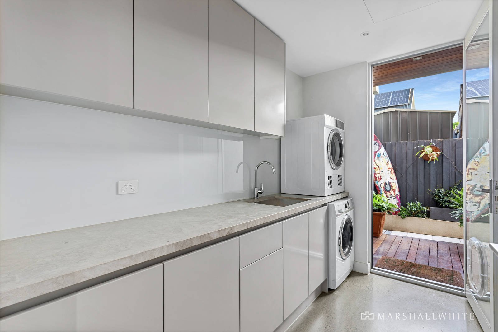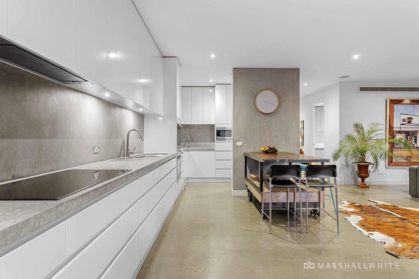 Glass sliding doors open out to the undercover alfresco terrace edged with auto-irrigated vertical gardens, and access to the gas-heated plunge pool and spa. The designer kitchen is equipped with Asko appliances including an induction cooktop, double ovens, and dishwasher, and flows to a butler's pantry with sink. A luxe marble laundry with external access and the interior access door to the double remote-operated garage complete this level.