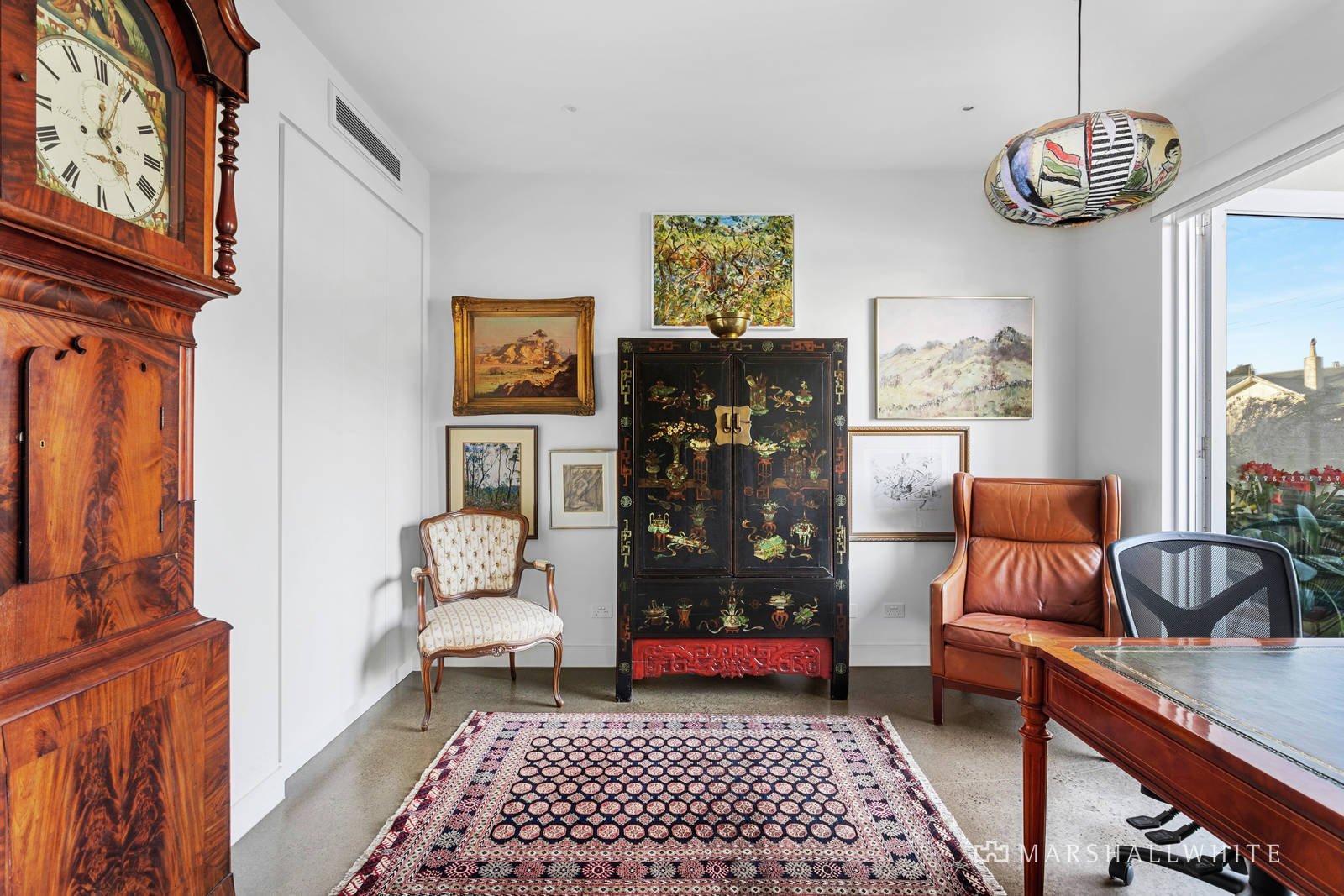Set over two luxurious levels, the spacious floorplan is designed for effortless family living and elegant entertaining, with the ground floor comprising a study (or fourth/guest bedroom), luxe powder room and an open plan living/dining/culinary zone. Surrounded by a wall of marble, a gas log fireplace adds a cosy ambience to this gallery-like space, while the art-inspired aesthetics are enhanced with imported Suzani handwoven drum pendant light shades that define the dining space, matched by a hand-painted David Bromley shade in the study.