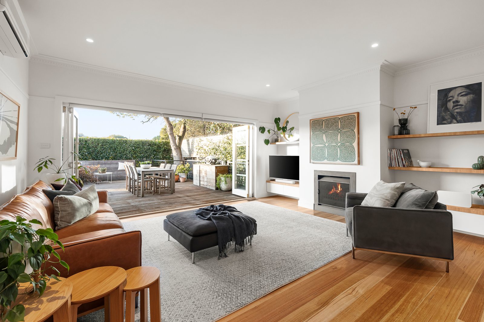 Zoned for effortless family living and entertaining, the floorplan comprises three fitted-robe bedrooms and a family bathroom in the front section, a central open plan kitchen/dining/living space with a gas log fire heater and bi-fold door connectivity to the fabulous northerly facing deck, plus an architecturally renovated split-level rear wing. Here, steps up lead to the spacious and light-filled master suite with delightful outlooks to a Forest Pansy tree, a walk-in robe, and a luxe ensuite with double walk-in shower, while steps down lead to a retreat/second living room (or additional bedroom), which has been newly carpeted in chunky wool loop pile, and has an external access door to a private bluestone-paved patio.