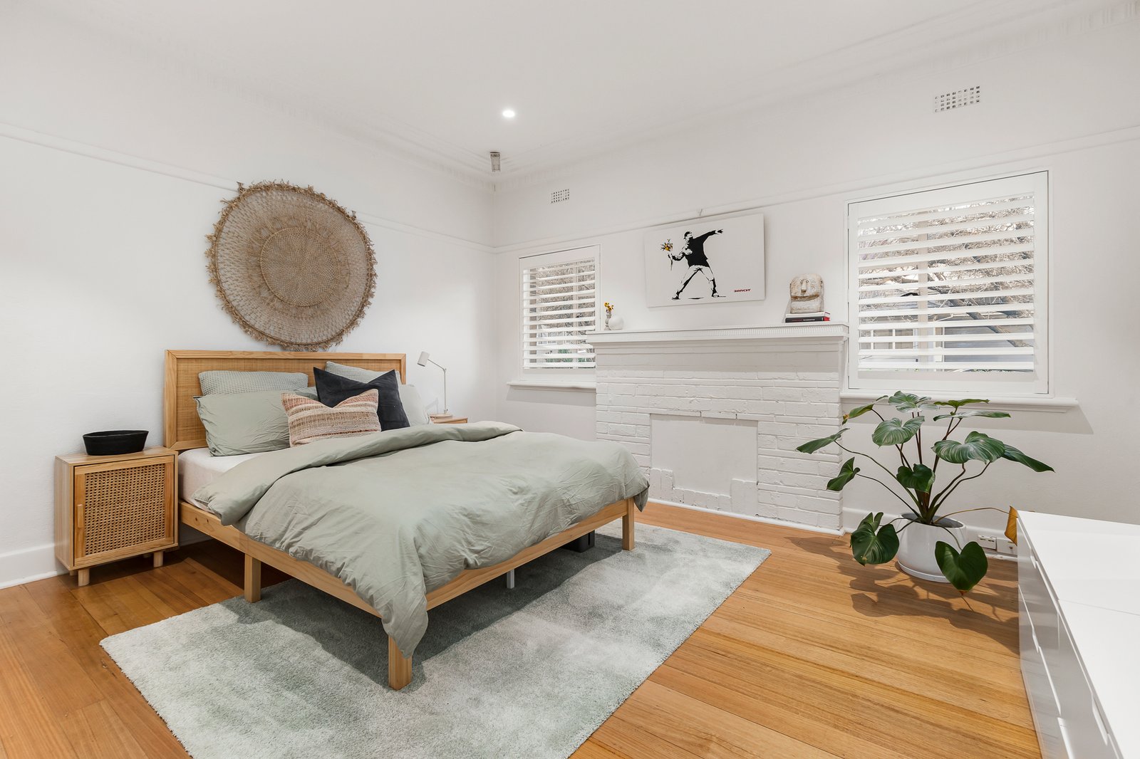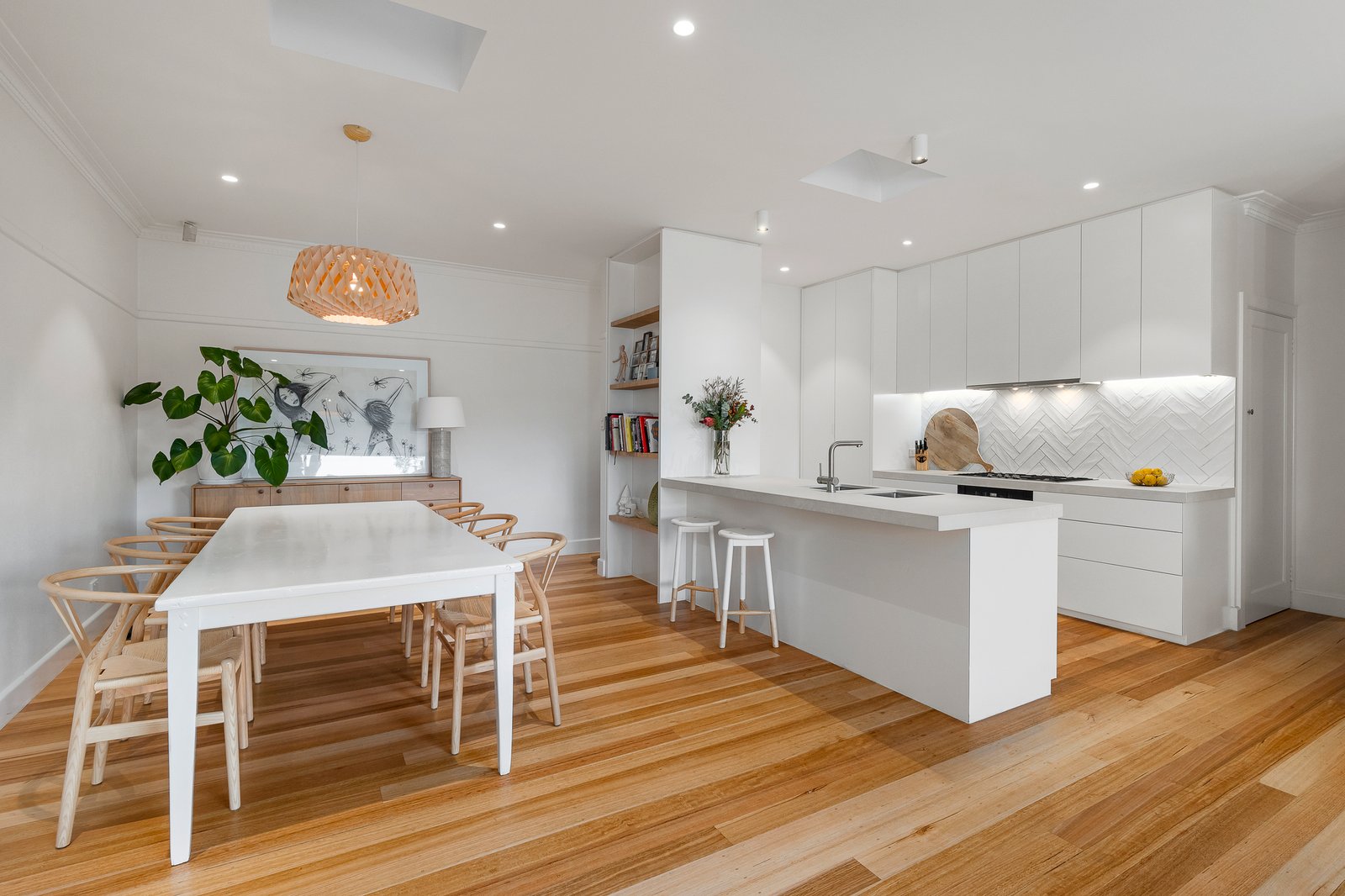 Retaining all the style hallmarks of its era, including original Tasmanian Oak flooring and high ceilings with decorative cornices, the home has been contemporarily enhanced with designer lighting, two gleaming floor-to-ceiling tiled bathrooms complemented by underfloor heating, and a gourmet stone/Miele kitchen with an integrated fridge/freezer.