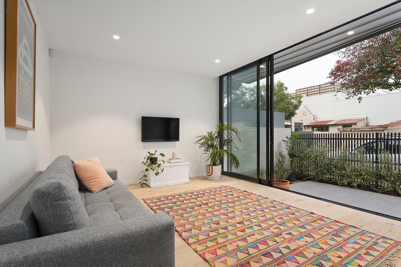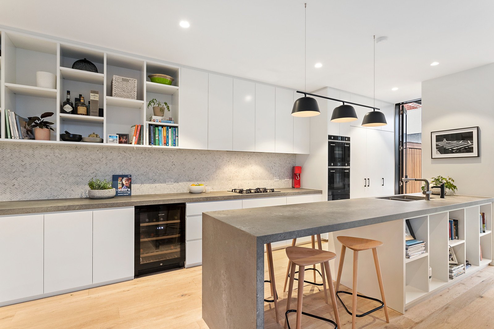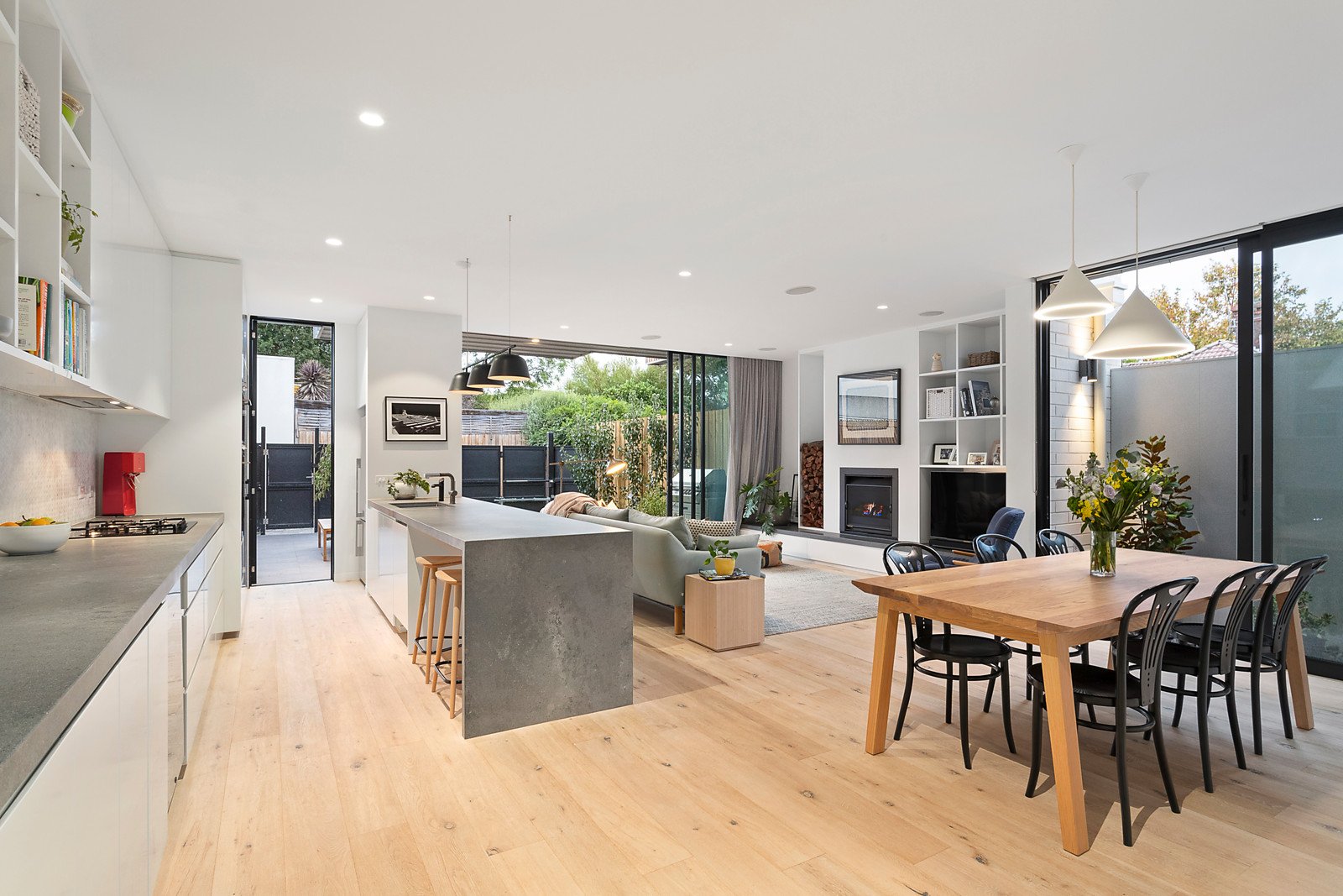 A soaring double height ceiling, white brick feature wall and limed oak floors creates an impactful first impression in the entrance hall which continues through to a sitting room or 4th bedroom overlooking the landscaped forecourt. Bathed in natural light, the expansive open plan living and dining room features a Jetmaster open fire and a state of the art kitchen appointed with Smeg appliances and long stone benches that include a clever home office nook. A sensational extension of the living spaces, the private northwest garden includes a paved entertaining terrace and off street parking via auto gates and a rear lane. Enjoying city views from its west-facing balcony, the beautiful main bedroom features a designer en-suite and built in robes while two additional double bedrooms with built in robes and balcony are accompanied by a stunning bathroom with freestanding bath.