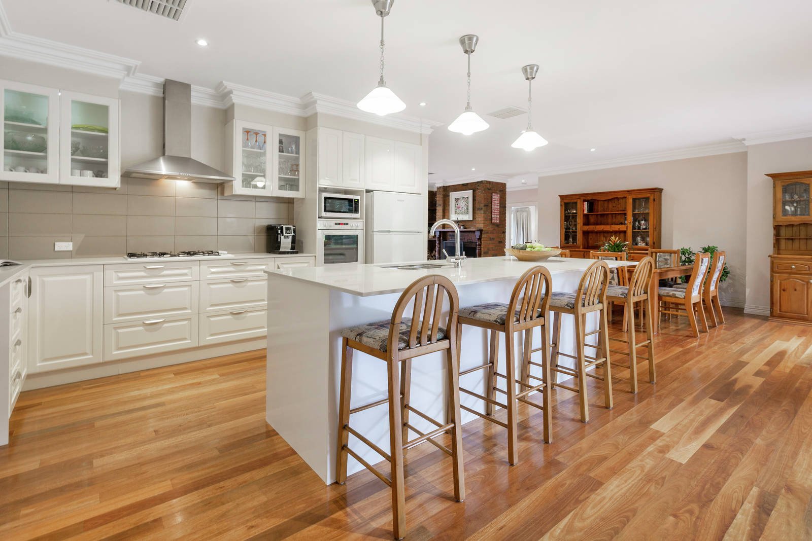 A homestead-inspired frontage opens to unveil a sprawling family domain, with free-flowing living (OFP), dining and entertaining spaces, wrapped around a centralised stone-topped kitchen, complete with butler's pantry, ample storage, and generous island bench. Lush foliage with soft bursts of spring colour spill effortlessly inside through a balanced combination of windows and sliding doors, ensuring privacy from the street, while providing an accompanying texture to the soft, warm colour palette. Immediately evident, the home's intelligent floorplan effortlessly lends itself to large-scale summer entertaining, while intimate vignettes showcase its alluring winter appeal.