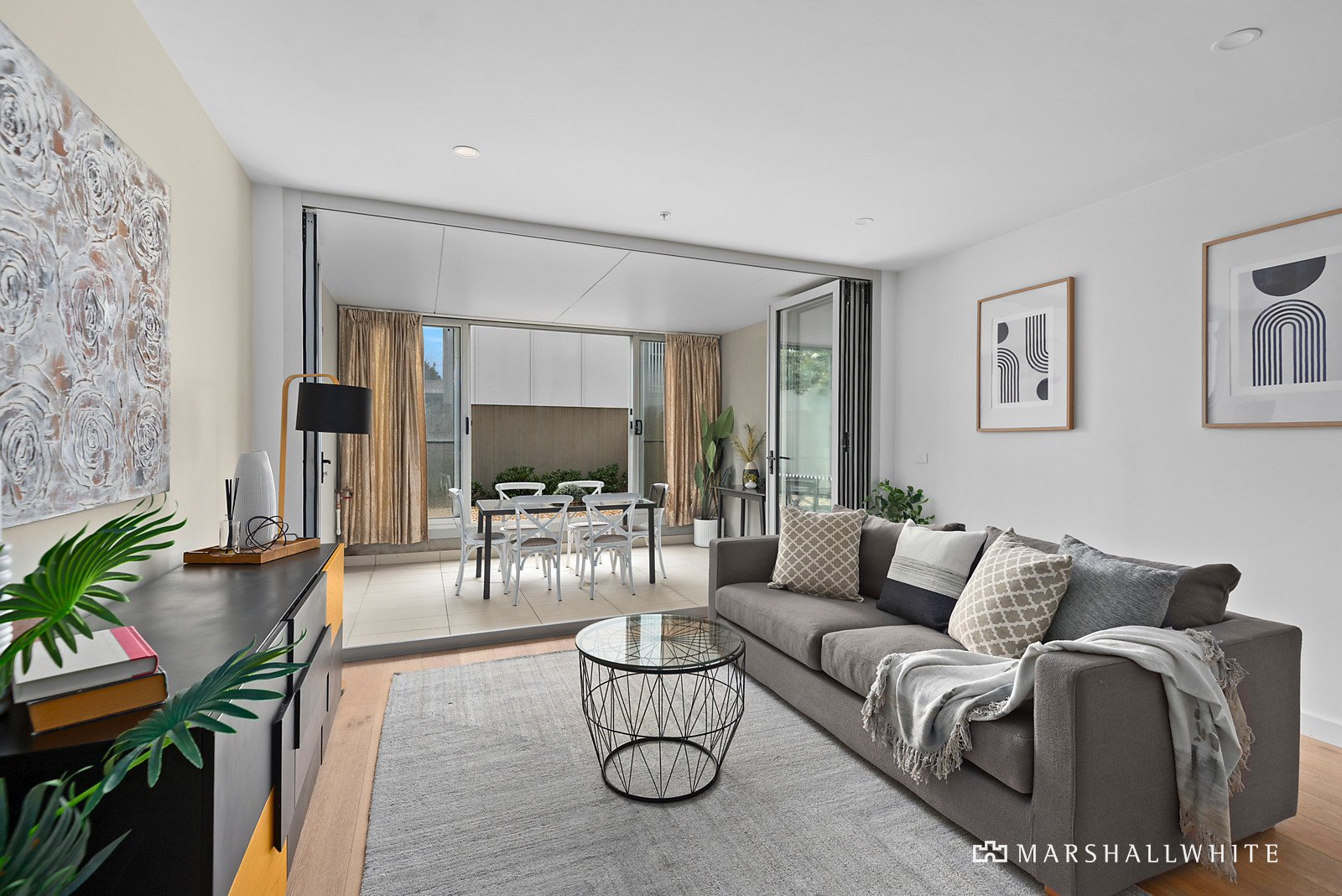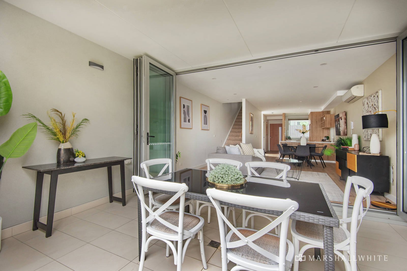 Generous and free-wheeling open-plan living is underpinned by a gourmet kitchen of stone surfaces, Bosch appliances and timber-toned cabinetry as it flows through concertina doors to an additional dining room that evokes an alfresco feel.