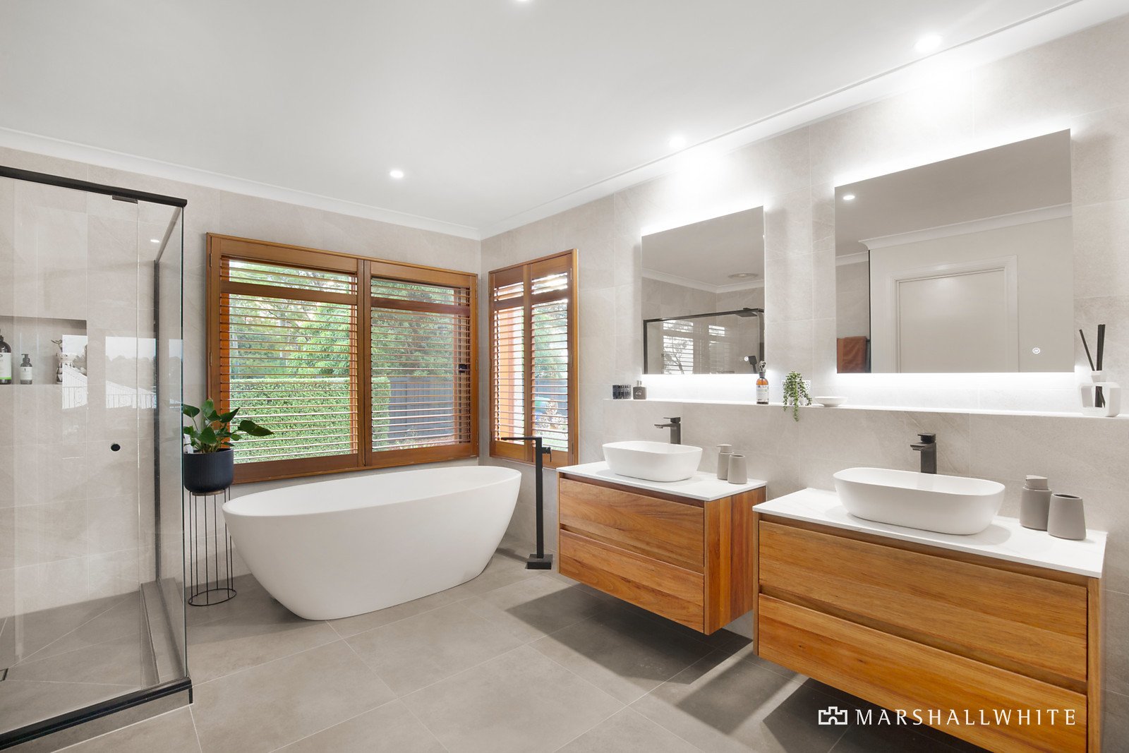 Upstairs, four spacious bedrooms each offer walk-in wardrobes and ensuites. The main bedroom is a standout, with its deep north-easterly balcony and updated ensuite with free-standing tub.