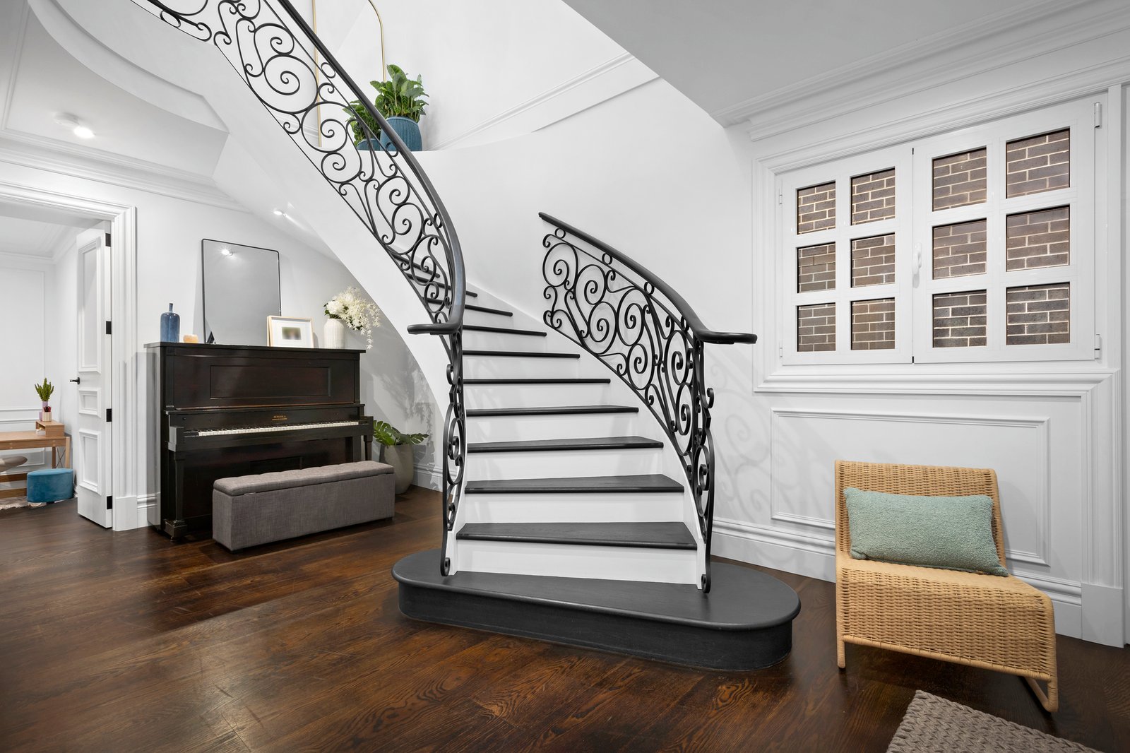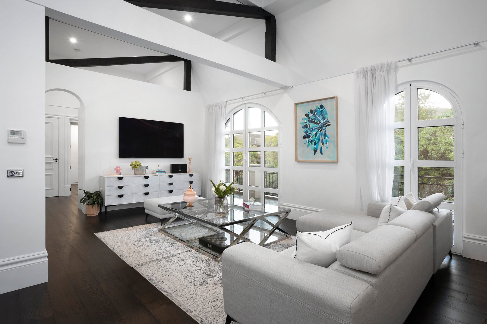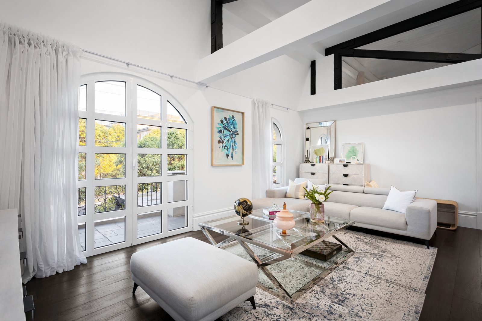 Privately set behind a high wall and secure auto gates with video intercom entry, enter a chateau vineyard-inspired courtyard garden with an alfresco seating zone and barbecue area, all lushly cocooned in verdant greenery. A grand front entry door introduces the breathtaking interiors with 3.3 metre ceilings, floored in American Oak and fitted with European style ‘tilt and turn’ double-glazed windows, ensuring absolute silence when closed. A quadrangular crystal chandelier is suspended above the dining space that adjoins the Calacatta marble kitchen equipped with an integrated F&P fridge/freezer, a Vintec wine fridge, Smeg steamer and convection ovens, Smeg gas cooktop and two integrated Asko dishwashers. There are two delightful bedrooms downstairs, with wainscoted wall panelling, a bathroom with shower and powder room. The grand Parisian-inspired curved solid American Oak staircase with wrought iron balustrade leads to the stunning upper level, where the ceilings are 4.8 metres high and feature exposed Cypress pine trusses. With Juliette balconies, arched windows, linen sheers and engineered timber floors, the indulgent upper-level rooms include two bedrooms, and two living spaces, one of them a fully soundproofed music room/retreat, which could also serve as a fifth bedroom. The main bedroom is complemented by a stunning marble ensuite and walk-in robe/dressing room, and there is a separate luxe powder room.