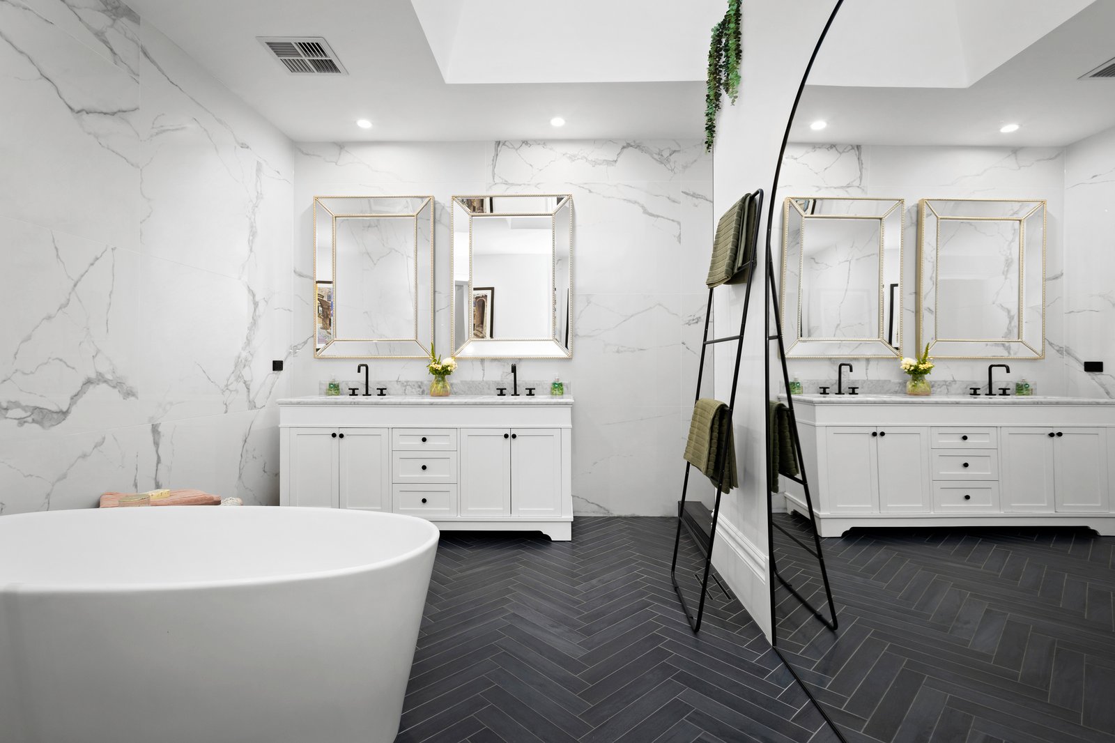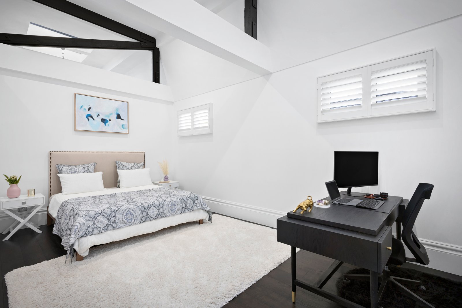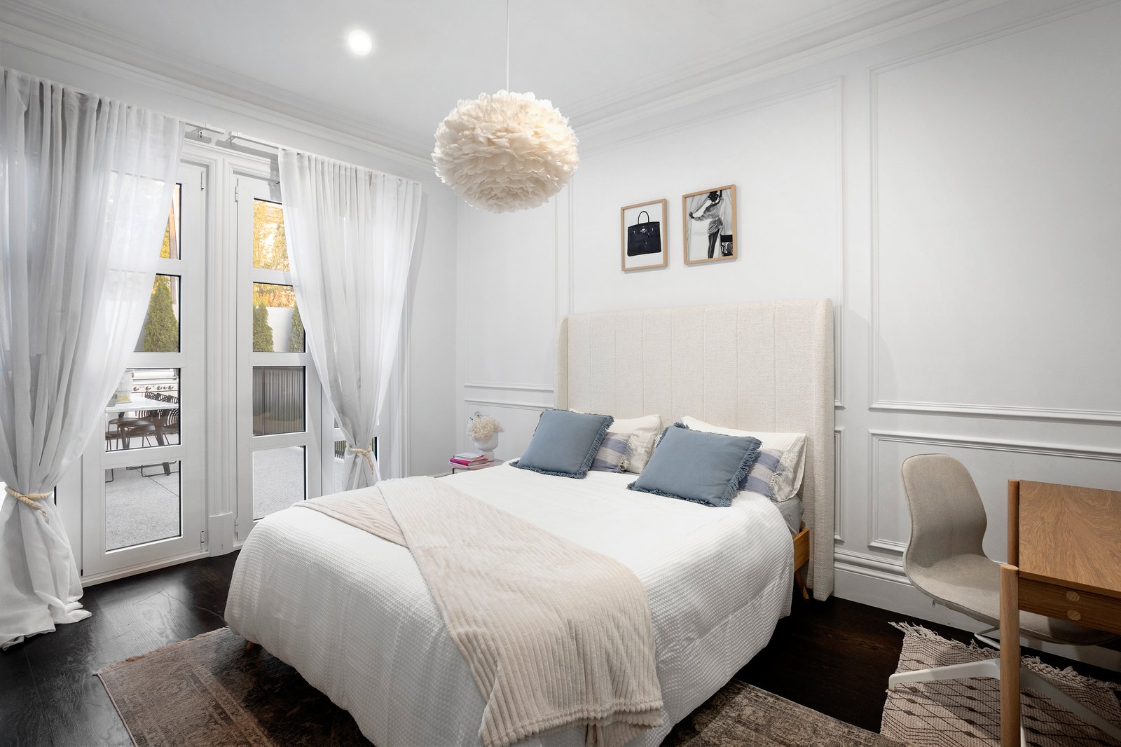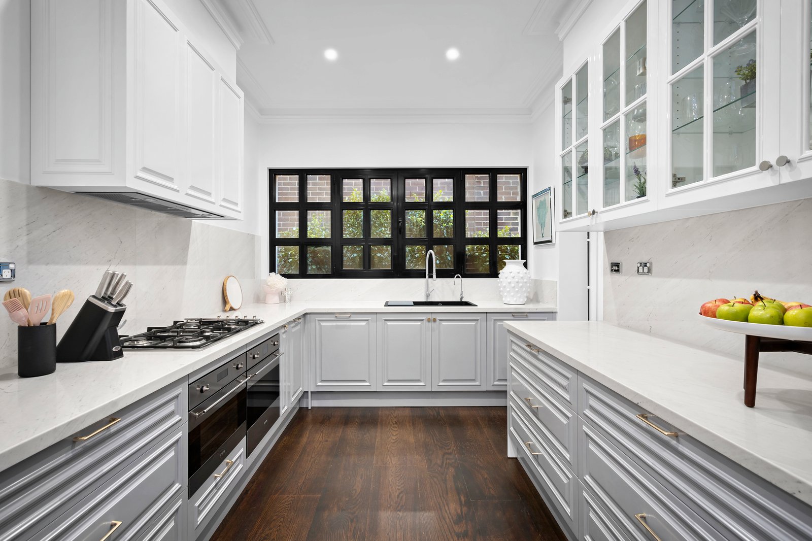 Privately set behind a high wall and secure auto gates with video intercom entry, enter a chateau vineyard-inspired courtyard garden with an alfresco seating zone and barbecue area, all lushly cocooned in verdant greenery. A grand front entry door introduces the breathtaking interiors with 3.3 metre ceilings, floored in American Oak and fitted with European style ‘tilt and turn’ double-glazed windows, ensuring absolute silence when closed. A quadrangular crystal chandelier is suspended above the dining space that adjoins the Calacatta marble kitchen equipped with an integrated F&P fridge/freezer, a Vintec wine fridge, Smeg steamer and convection ovens, Smeg gas cooktop and two integrated Asko dishwashers. There are two delightful bedrooms downstairs, with wainscoted wall panelling, a bathroom with shower and powder room. The grand Parisian-inspired curved solid American Oak staircase with wrought iron balustrade leads to the stunning upper level, where the ceilings are 4.8 metres high and feature exposed Cypress pine trusses. With Juliette balconies, arched windows, linen sheers and engineered timber floors, the indulgent upper-level rooms include two bedrooms, and two living spaces, one of them a fully soundproofed music room/retreat, which could also serve as a fifth bedroom. The main bedroom is complemented by a stunning marble ensuite and walk-in robe/dressing room, and there is a separate luxe powder room.