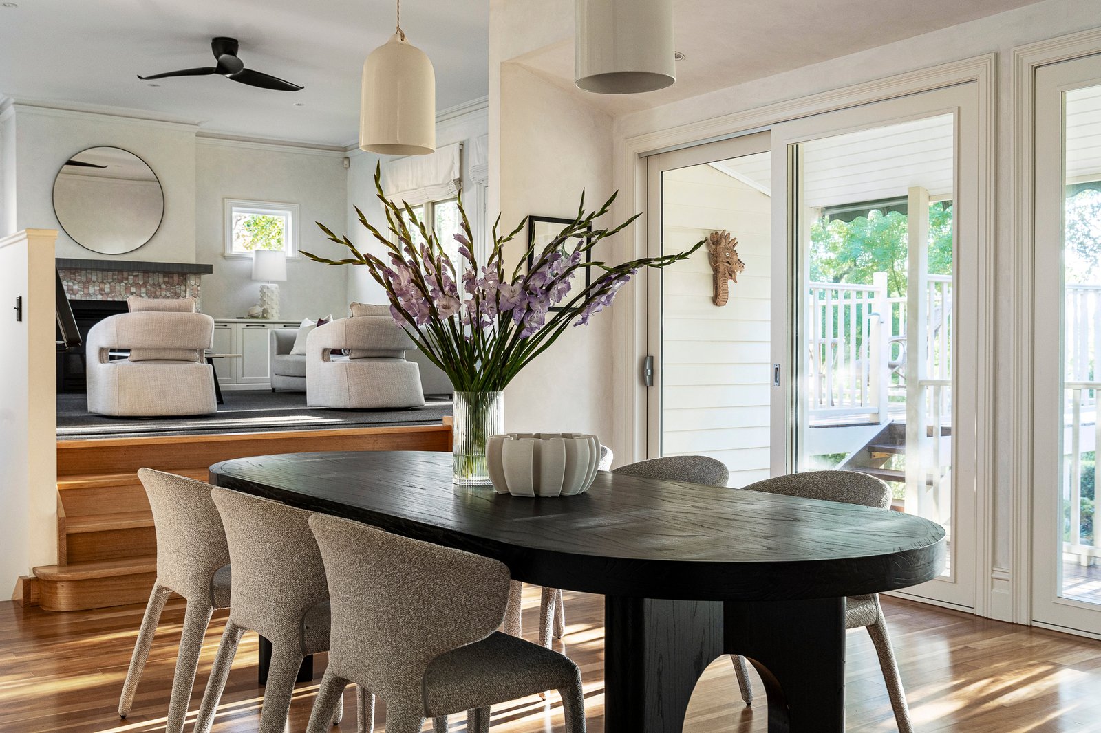 Upon entry the fully renovated interior features a wide arched hallway with polished hardwood floors flanked by a study or home office, front sitting room, two bedrooms including a main with a WIR and ensuite and a stylish family bathroom. An expansive family domain incorporates an entertainer’s kitchen equipped with stone benchtops and prestige Siemens and Bosch appliances. The lower level includes two further bedrooms with built-in robes, a fully tiled bathroom, family retreat and laundry. Living areas open to a split-level deck and a slate paved area overlooking an expansive lush garden providing wonderful options for entertaining family or friends.