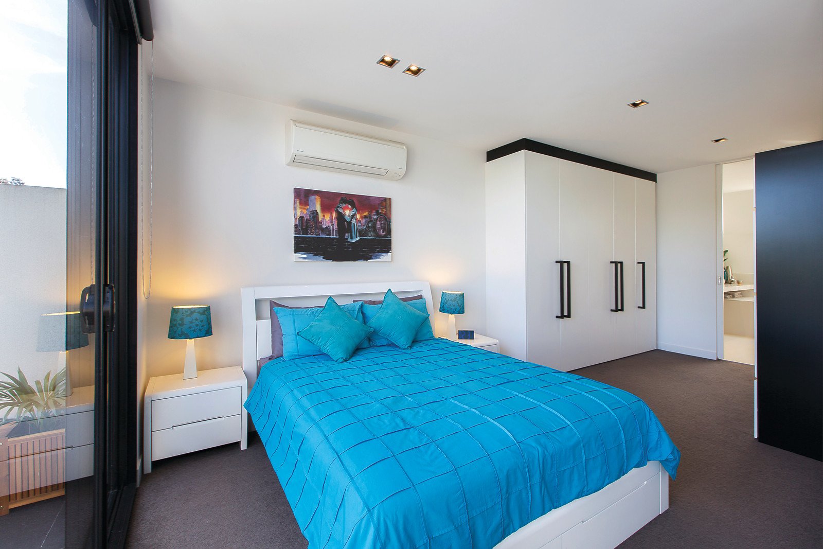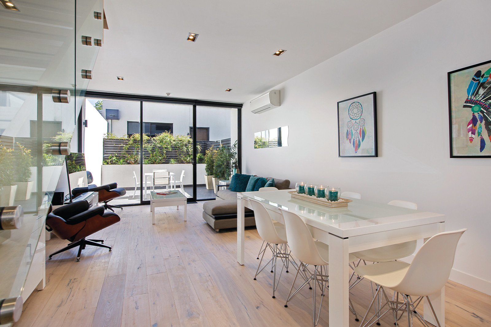 The living spaces extend out to an entirely private and peaceful northwest courtyard. Two double bedrooms with built in robes, powder-room with Euro-laundry and a stylish bathroom are on the floor above. A stunning main bedroom complete with private northwest balcony, built in robes and an opulently scaled designer en-suite with skylight is on its own level above.