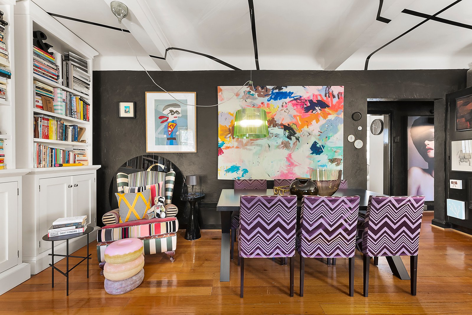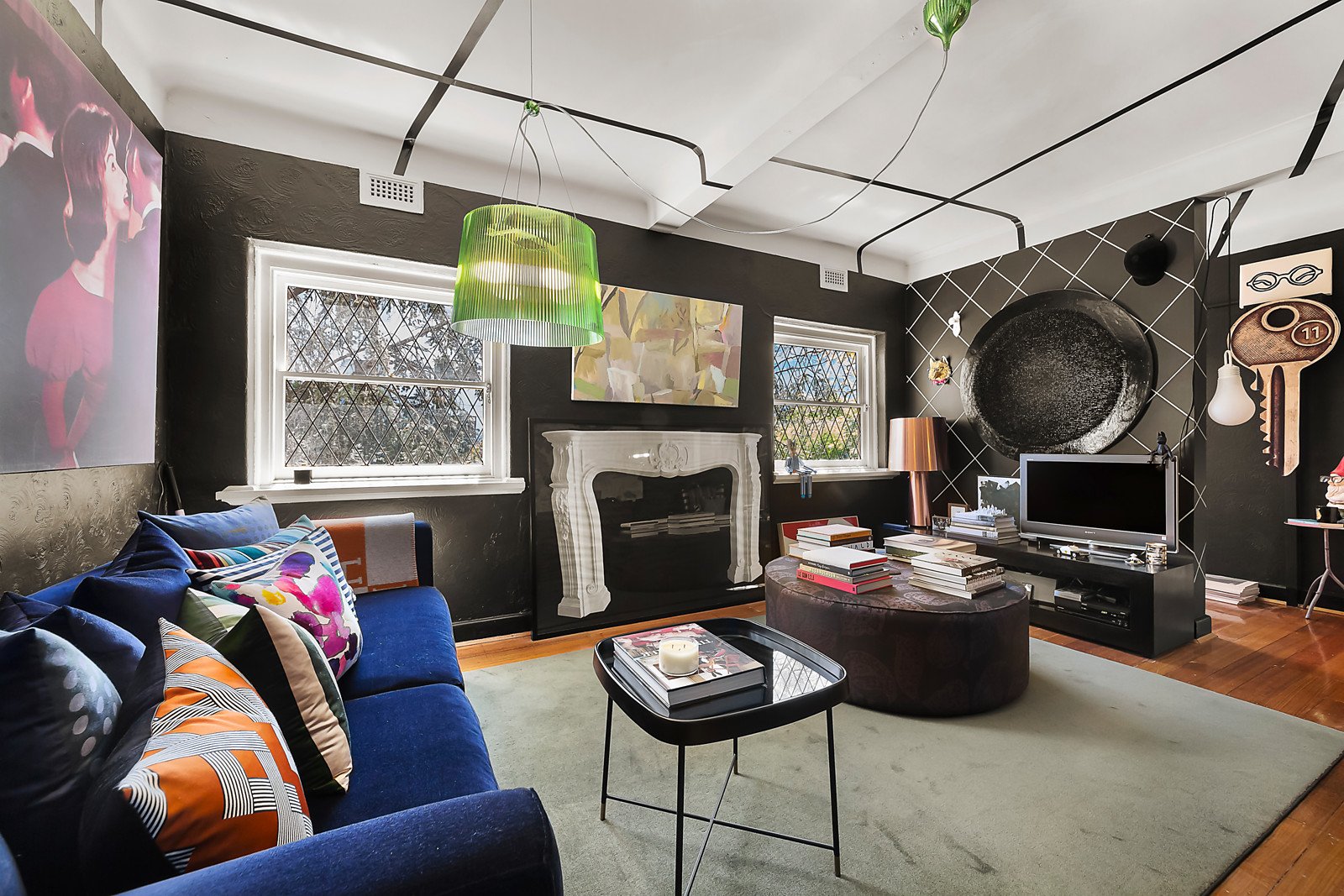 Brilliantly conceived and perfectly executed, the home's lounge / dining room is an impressive and unforgettable room, rendered in black and highlighting original north-facing windows that frame leafy first floor outlooks, whilst the master bedroom is a huge space - large enough for a desk and filled with more northerly light. Accessed securely via intercom entry, the home also offers the rare treat of two secure undercover parking spaces, as well as a broad kitchen and a central bathroom with laundry facilities.