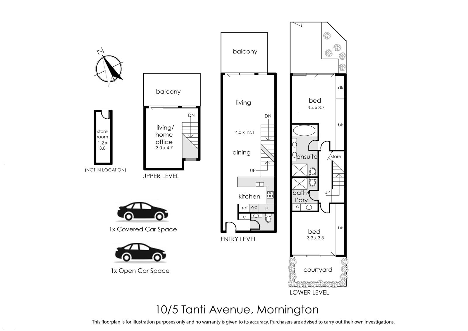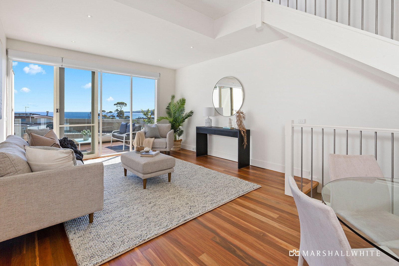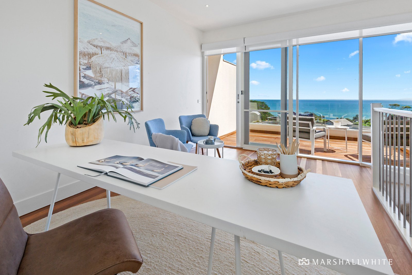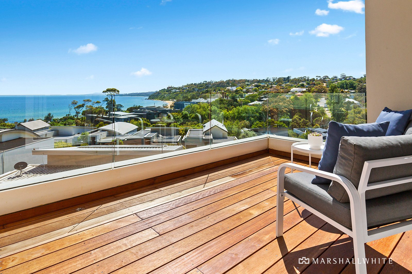 The top level contains a secondary living area with potential also as a home office or third bedroom, all leading onto a large merbau deck again offering uninterrupted views across Port Phillip Bay and Melbourne's CBD.