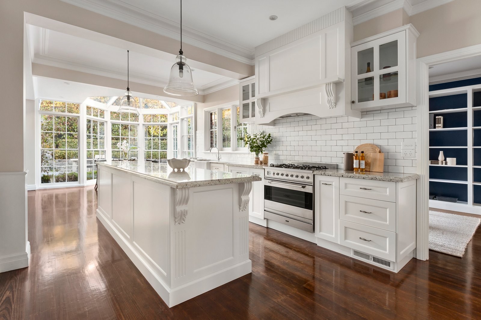 Double doors reveal a wide entrance hall, gracious sitting room with an ornate marble fireplace, an executive study/library and an elegant formal dining room all featuring richly hued timber floors. The sublime gourmet kitchen appointed with stone benches and a 90cm Ilve oven serves the inviting conservatory style casual dining alcove and the expansive living room with a feature stone wall and gas log fire. The living spaces open out to a large west facing entertaining deck and terrace and private gardens surrounded entirely by Magnolias. A versatile TV room or guest bedroom with adjacent stylish bathroom is on the ground level while sky lit stairs lead up to the opulent main bedroom with built in/walk in robes, lavish marble en suite with spa bath and a retreat enjoying wonderful park views. There are also three additional bedrooms with robes, a designer bathroom and 4th toilet.