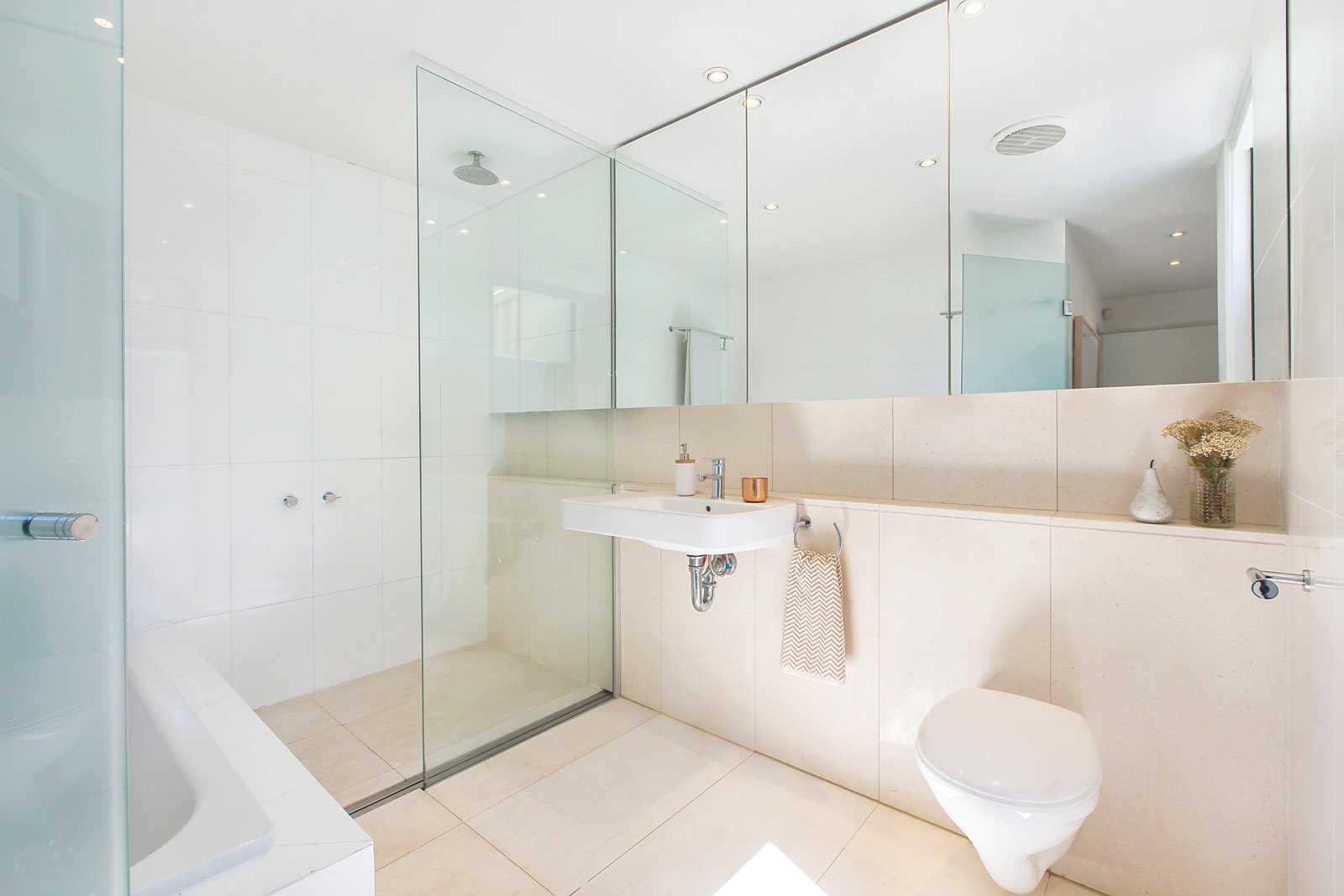 Sleek whitewashed polished concrete floors add to the sun-drenched ambience of the streamlined and spacious living and dining room with a gas log fireplace and superbly appointed gourmet marble kitchen. The living area opens out to an entirely private north-facing garden oasis with elevated entertaining deck. A generous main bedroom with walk in robe, north balcony and designer en-suite is accompanied by two additional double bedrooms with built in robes and a stylish bathroom.