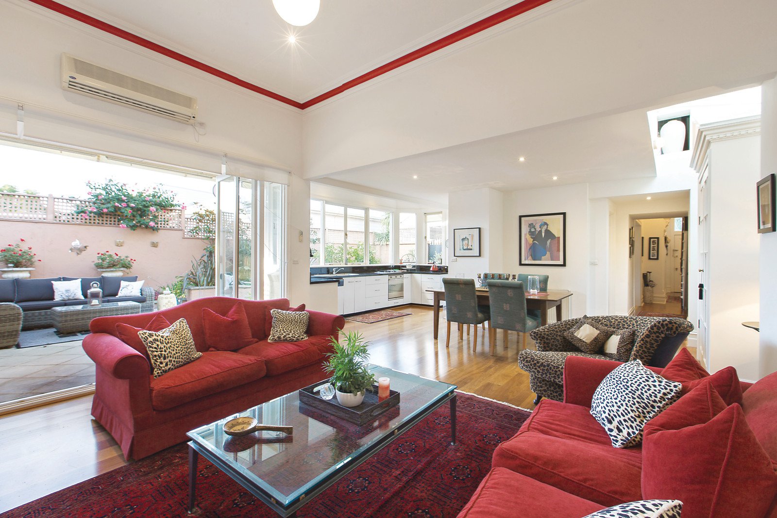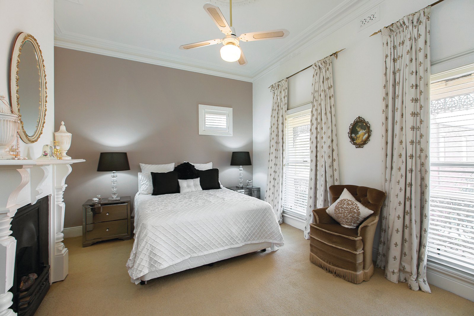 An inviting arched hallway introduces a gorgeous sitting room and refined formal dining room both featuring high ceilings and open fireplaces. Timber floors flow through the spacious north-oriented living and dining room and gourmet Smeg kitchen boasting granite benches. Bi-fold doors open the living out to a landscaped private paved north-facing garden, a lovely oasis for al fresco dining. The main bedroom with open fireplace and full width balcony is accompanied by two additional bedrooms, a stylish bathroom and powder-room.