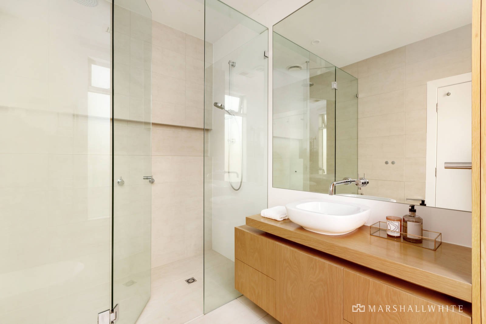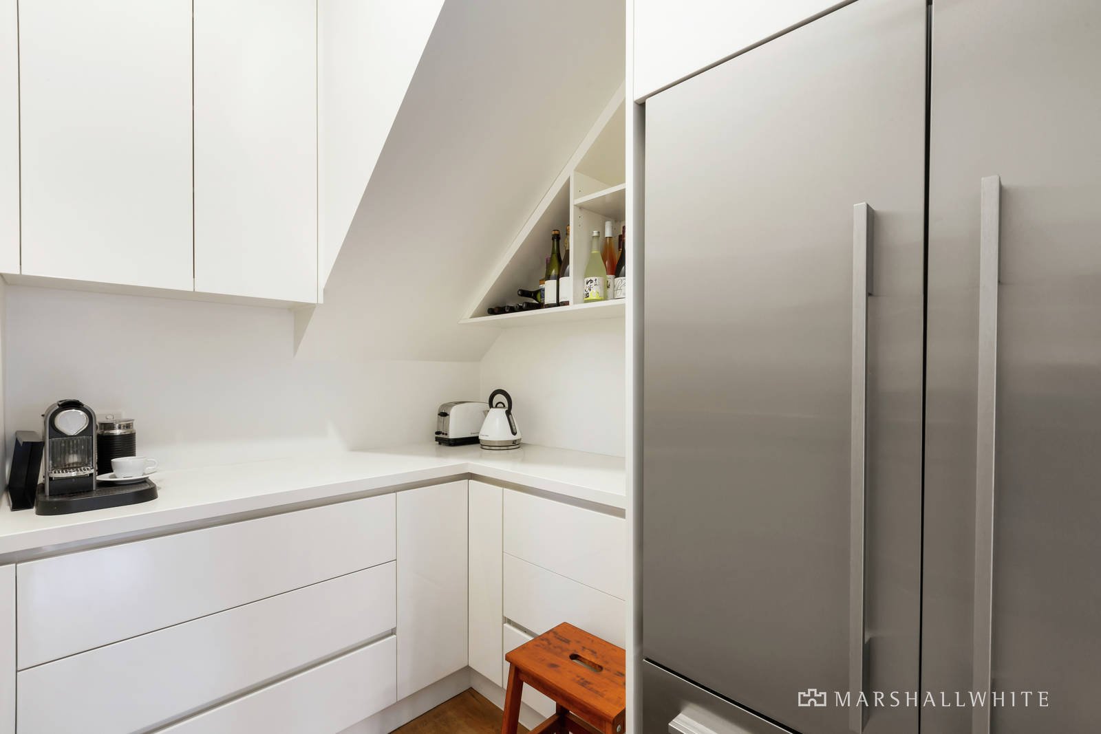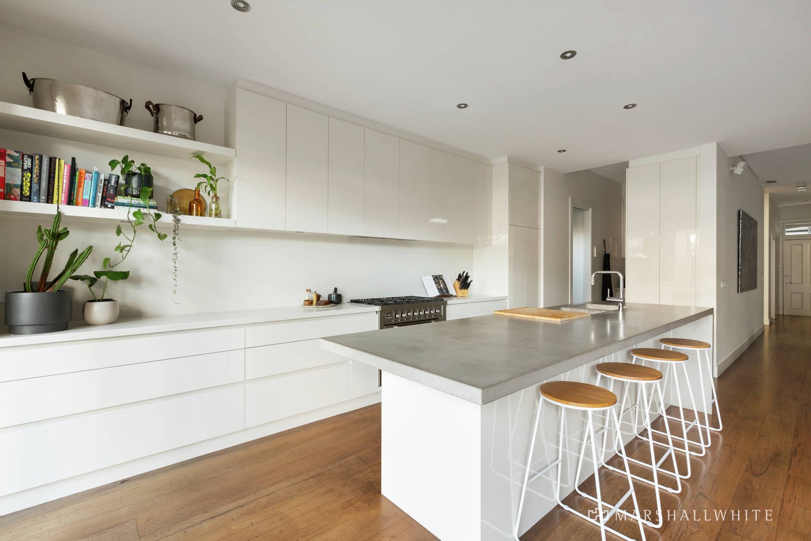 Behind a high walled landscaped garden designed by Rick Eckersley, the central entrance hall introduces an exceptionally spacious open plan living and dining room featuring high ceilings, timber floors and a gas fireplace. The stunning kitchen boasts concrete and stone benches, a 90cm Ilve oven and butler's pantry. Bi-fold doors open completely to the glorious, lush northeast facing garden with a large entertaining deck, BBQ and an additional car-space. A double bedroom with built in robe, a second spacious bedroom opening to the deck and a stylish bathroom are downstairs while on the level above, the main bedroom with designer en suite and walk in robe is accompanied by a fourth bedroom or home office with built in robe.