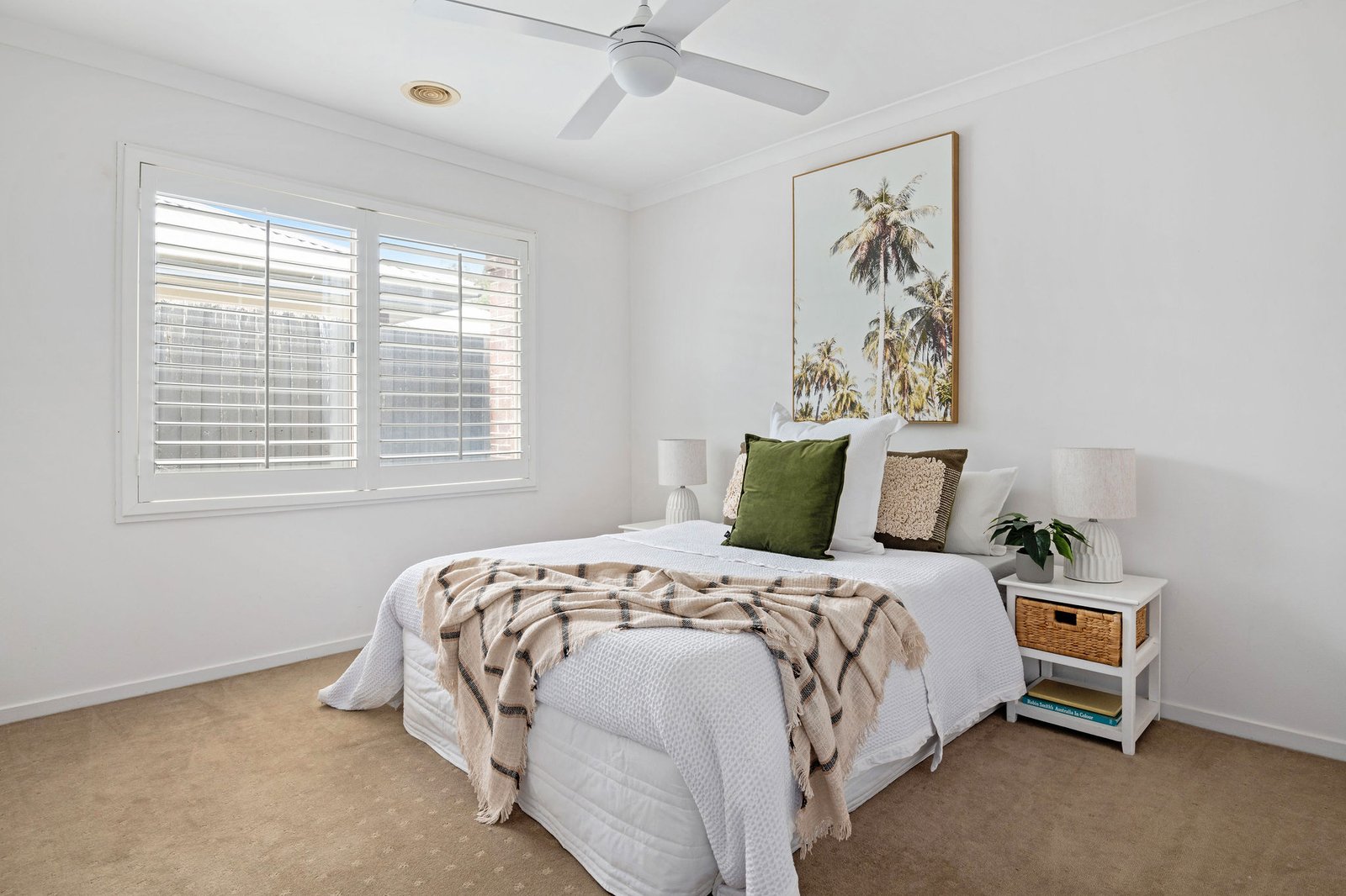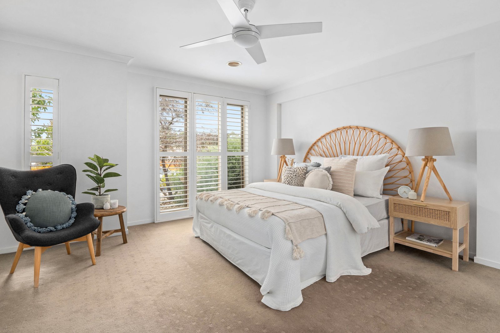 Harmonious zoning accommodates the rhythms of daily life, with the children's bedroom wing comprising three robed bedrooms serviced by a central bathroom and a separate WC. The main bedroom offers a peaceful retreat for parents, with views to the front garden, a walk-in robe, and a double-vanity ensuite, adding privacy and comfort.