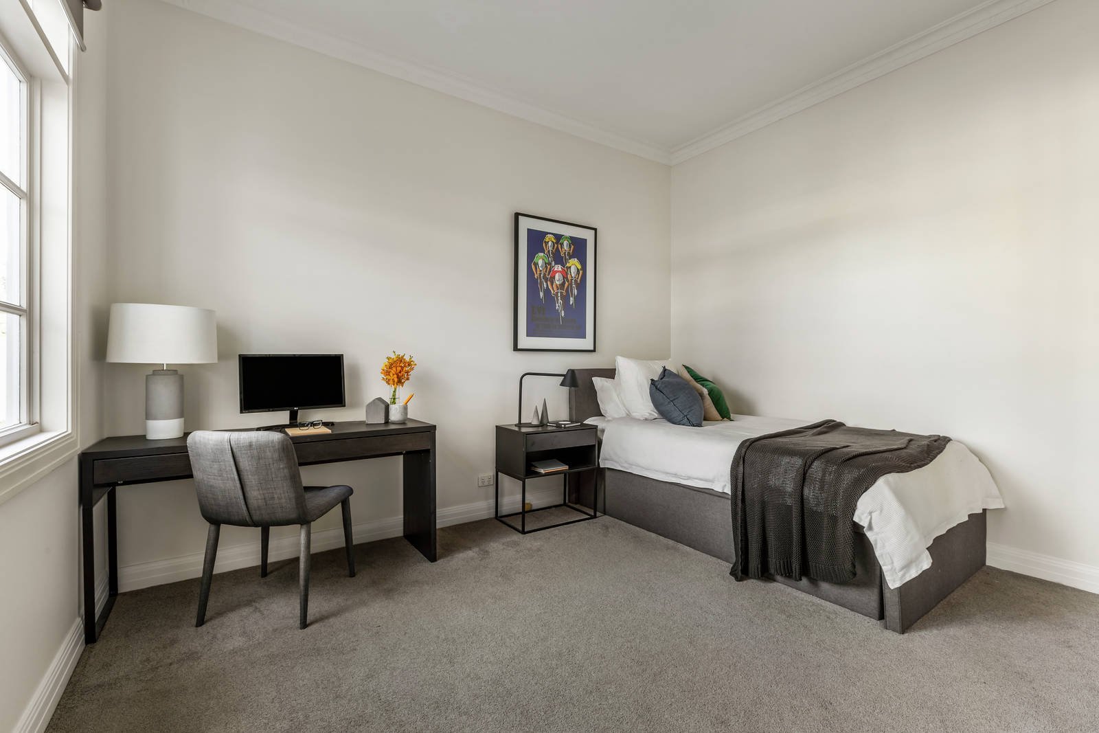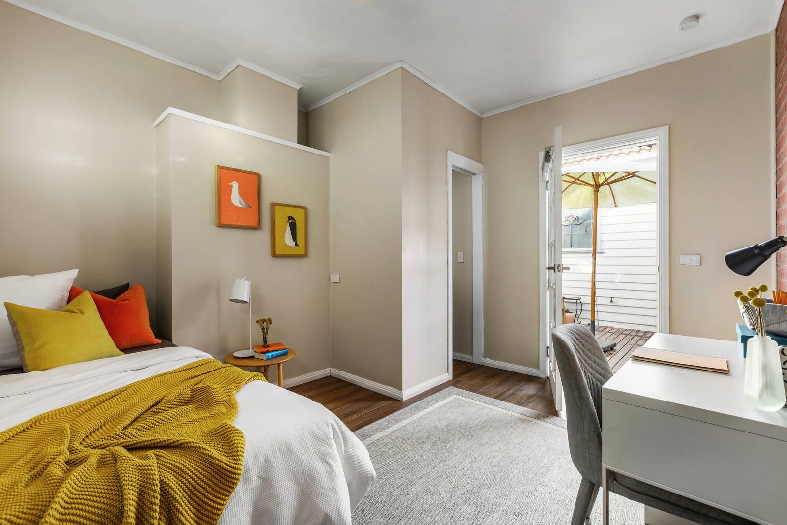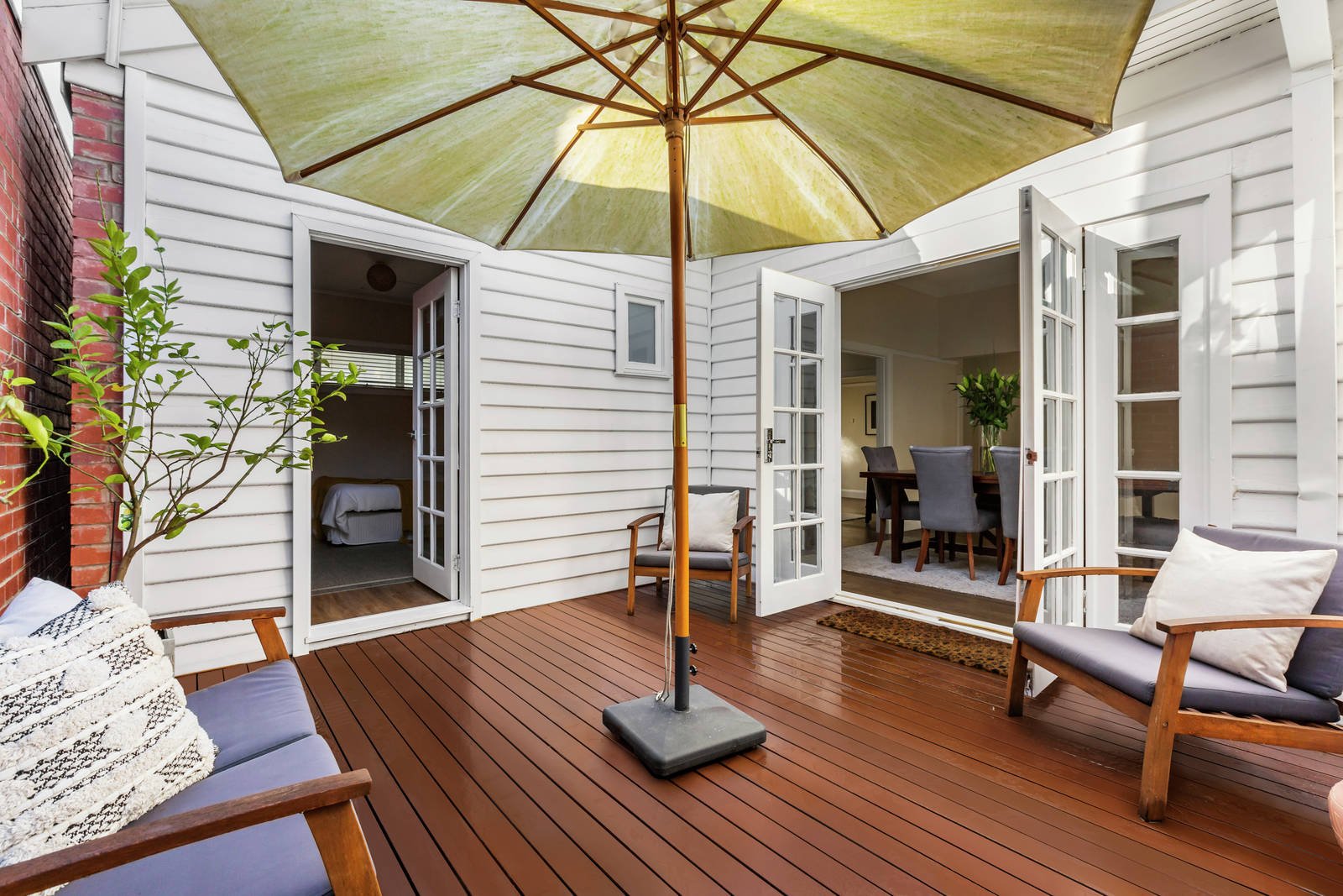 A more traditional lounge is arranged around a fireplace, also with plantation shutters that frame delightful leafy outlooks, plus there is a formal dining area with French doors that open to the north-facing privacy of a second outdoor living area. Meanwhile, each of the bedrooms and even the study are thoughtfully appointed with built-in storage, whilst both of the bathrooms are fully tiled showpieces with frameless-screened showers, floating wall-mounted vanities and one with a luxurious deep soak bath. Adding to the allure is the third bedroom, which presents an ideal teen or guest room, complete with its own powder room.