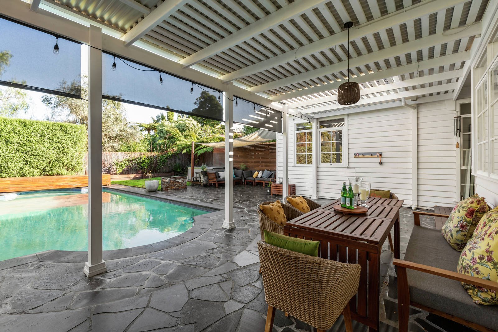 Open, airy and warmly welcoming, the home's heart is an open-plan rear that encompasses a stone-topped kitchen, a breakfast counter and built-in bench-seating in the dining/living area, all seamlessly connected to outdoor living. Partially undercover and fully paved with a built-in BBQ, a six-person jacuzzi and solar-heated in-ground swimming pool, the promise here is of private, sun-drenched entertaining within the sheltering surrounds of an established landscaped garden.