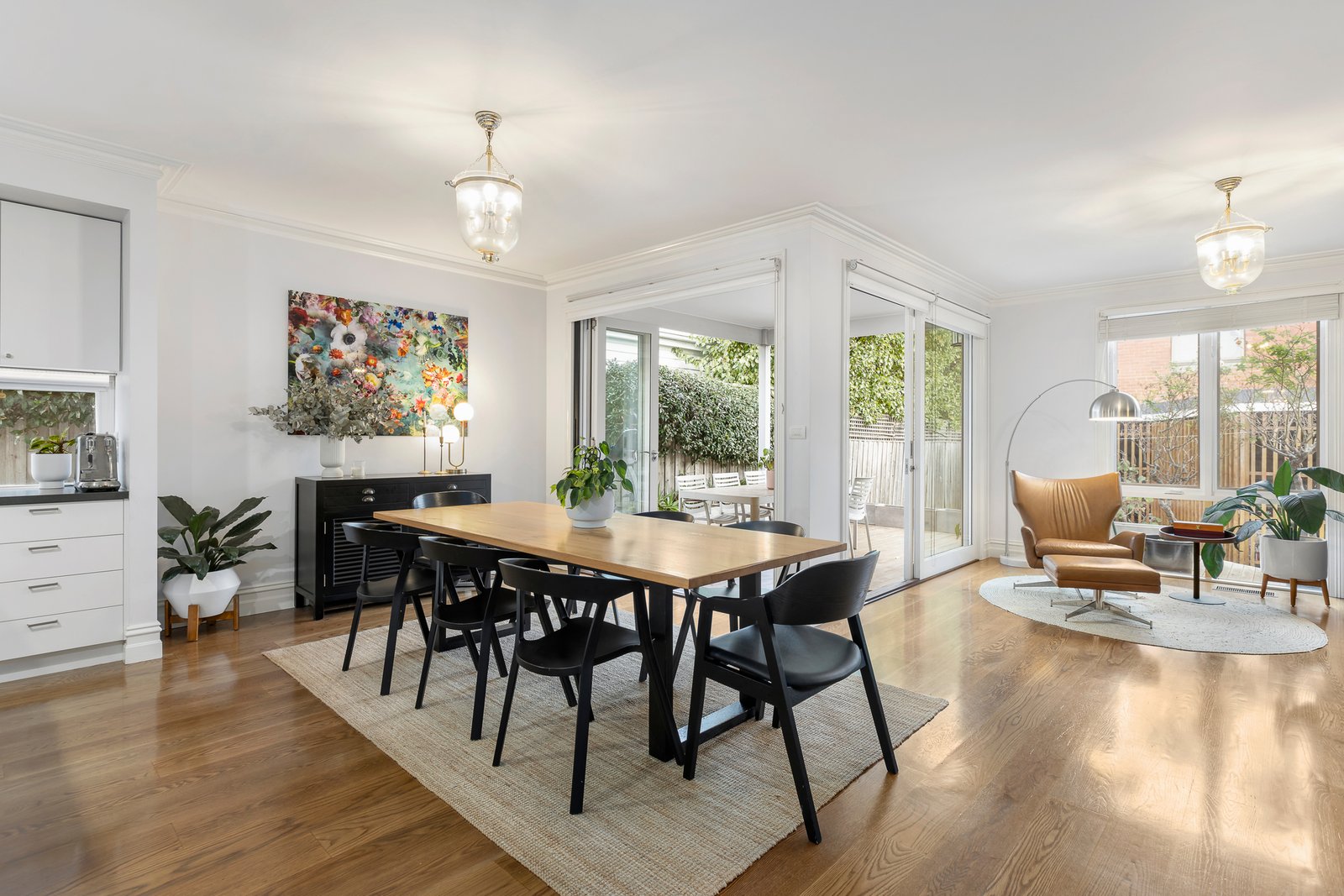 The arched central hall featuring oak floors and high ceilings flows through to an elegant sitting room with open fire, the gourmet kitchen appointed with stone benches and Miele/Smeg appliances and the expansive open plan living and dining room. Bi-fold doors and sliders open the living spaces to a large undercover deck and the private garden with large double garage accessed from the rear lane. The main bedroom with walk in robe and designer en suite, a second robed bedroom and stylish bathroom with bath are matched upstairs by two additional double bedrooms and a 3rd modern bathroom with bath.