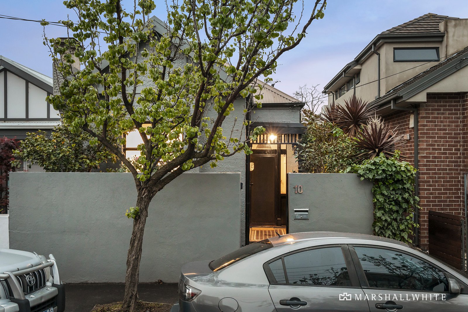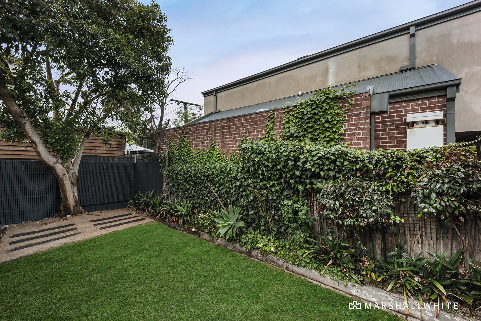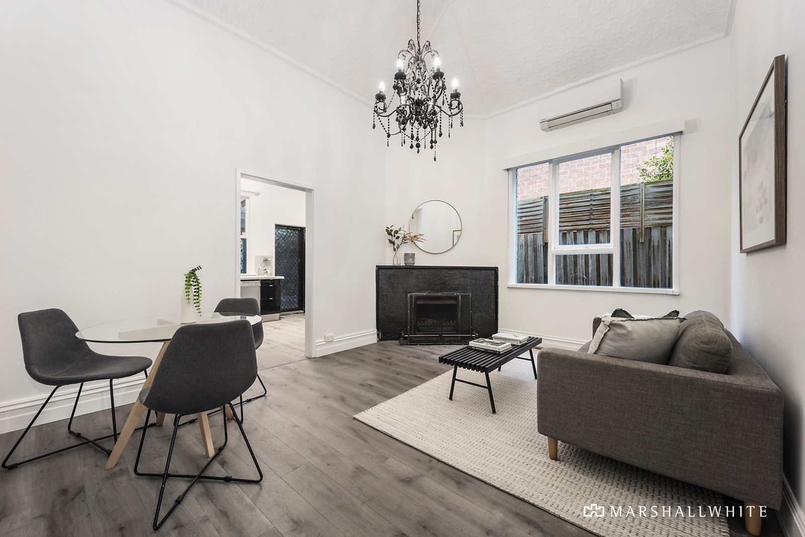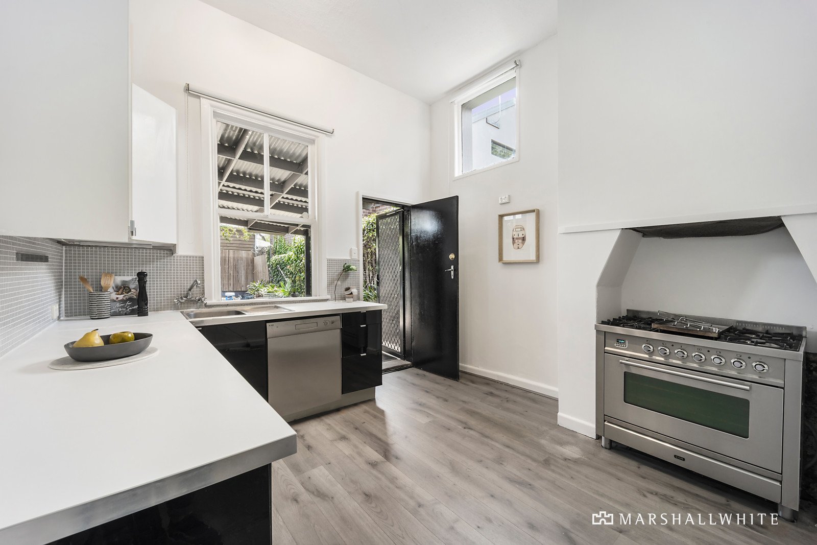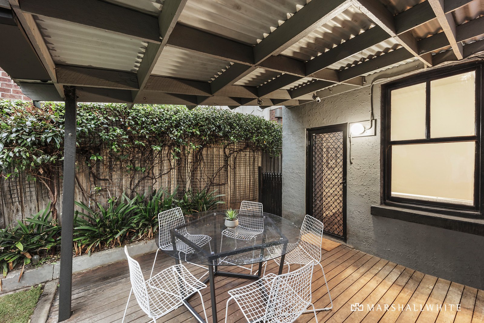 Behind a high walled garden, smokey oak floors flow through the L-shaped hall to a generous sitting room or 3rd bedroom, two additional double bedrooms with built in robes and a bright bathroom. A stunning vaulted pressed metal ceiling and fireplace distinguish the gracious living/dining room with an adjacent well-appointed kitchen boasting a 90cm Ilve oven. The covered deck overlooks the private north-facing leafy garden with a carport accessed from the rear lane.