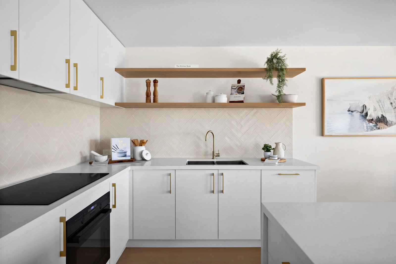 The living and dining area opens naturally here, giving you a clear sense of how day-to-day life would feel, alongside the gourmet kitchen, fitted with stone surfaces in soft, off-white tones, herringbone tiling, and premium German appliances, including induction cooking and an integrated dishwasher. All three bedrooms are generous in size, each with built-in robes, loop-pile carpet and green aspects, supported by a designer central bathroom detailed in full-height matte tiling, travertine detailing, brushed-gold tapware and a freestanding bath.