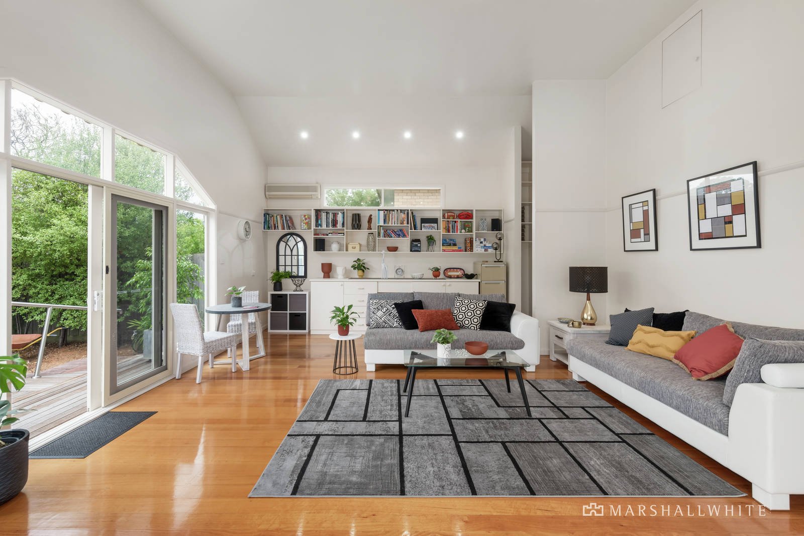 Polished timber floors flow through the wide hall to a generous living room boasting a fireplace and a unique Art Deco light. A similar Deco light presides over the separate informal meals area served by a large well-equipped kitchen with breakfast bar. A soaring vaulted ceiling adds to the scale of the exceptionally spacious and light-filled family room opening to the private leafy garden. Two double bedrooms plus study/3rd bedroom are accompanied by a pristine bathroom with separate toilet.