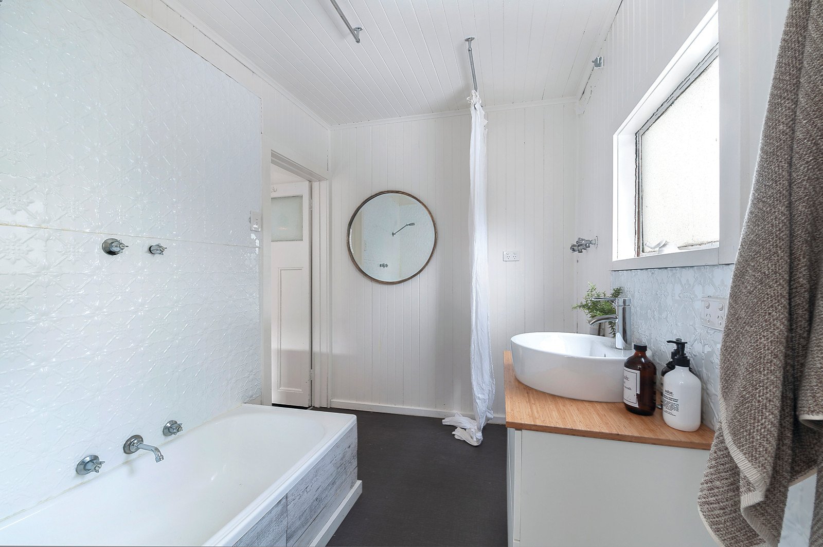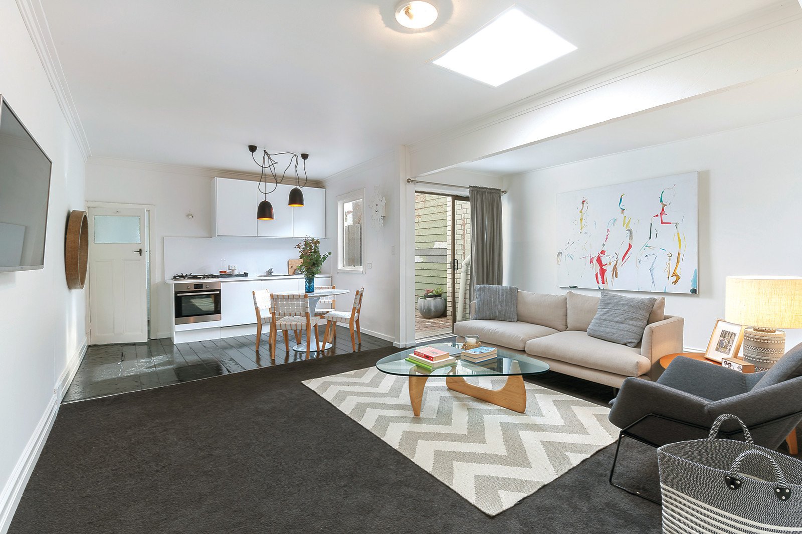A classic arched hall with high ceilings leads to a bright double bedroom with built in robe and French doors to the verandah, a second double bedroom and updated bathroom. The open plan living and dining room with a sleek kitchen opens to a private leafy garden with potential off street parking via rear right of way.