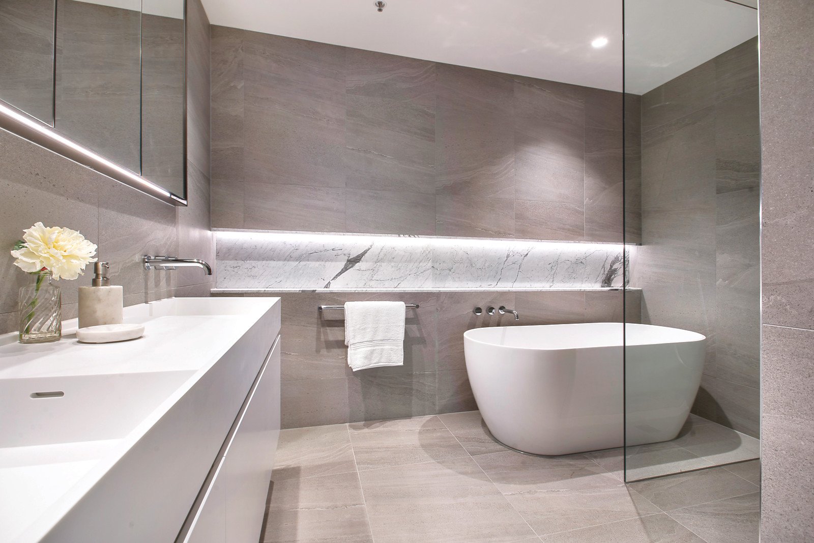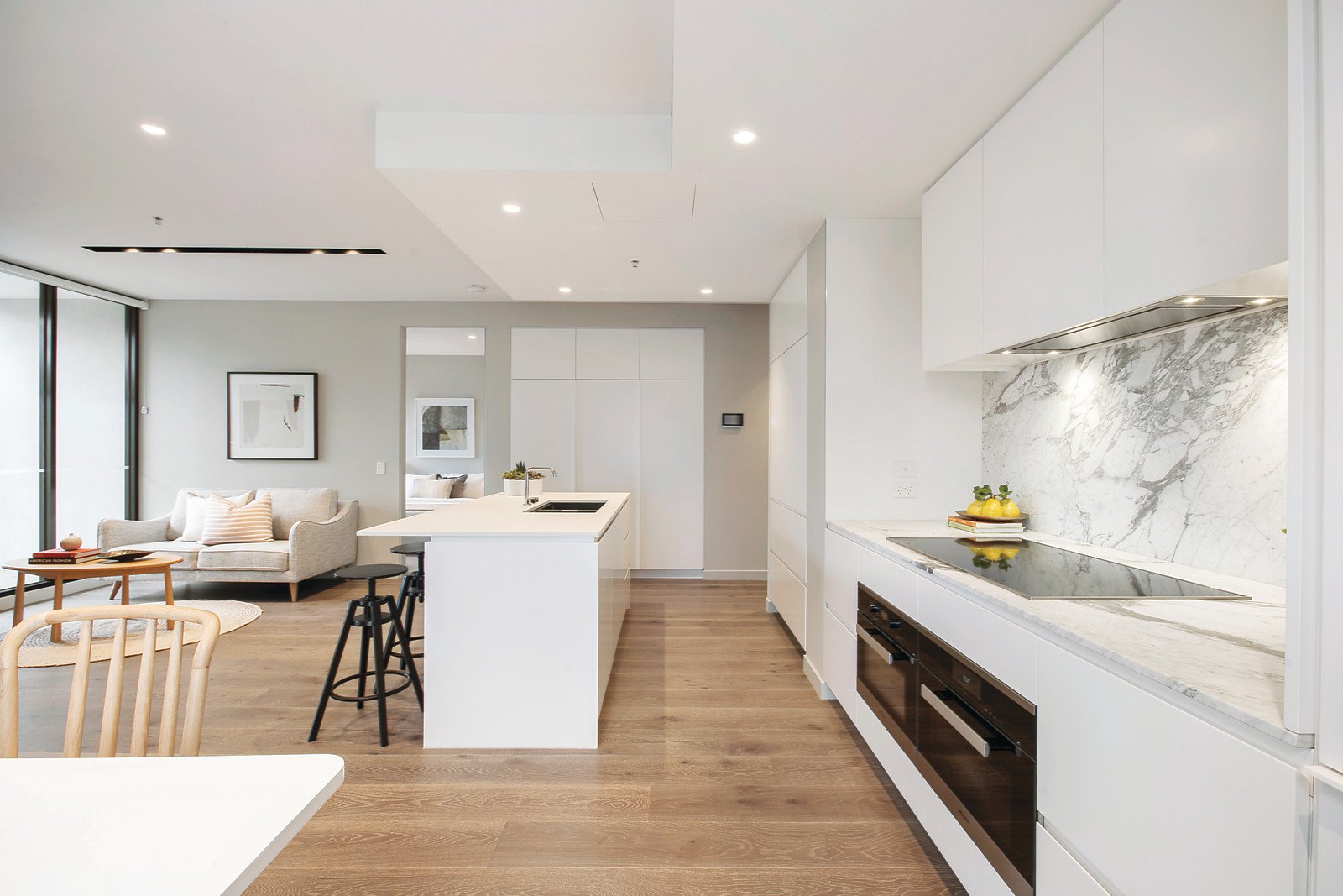 Wide oak floors flow through the hallway to a state of the art gourmet kitchen boasting marble and stone benches, premium Miele appliances and an integrated Sub Zero fridge/freezer and wine fridge and the inviting living and dining room. Bi-fold doors extend the living out to a large covered north-facing al fresco dining terrace. The main bedroom with north balcony, walk in robe and stunning en-suite with freestanding bath enjoys its own space while two additional double bedrooms with built in robes share a lavish bathroom also with a freestanding bath.