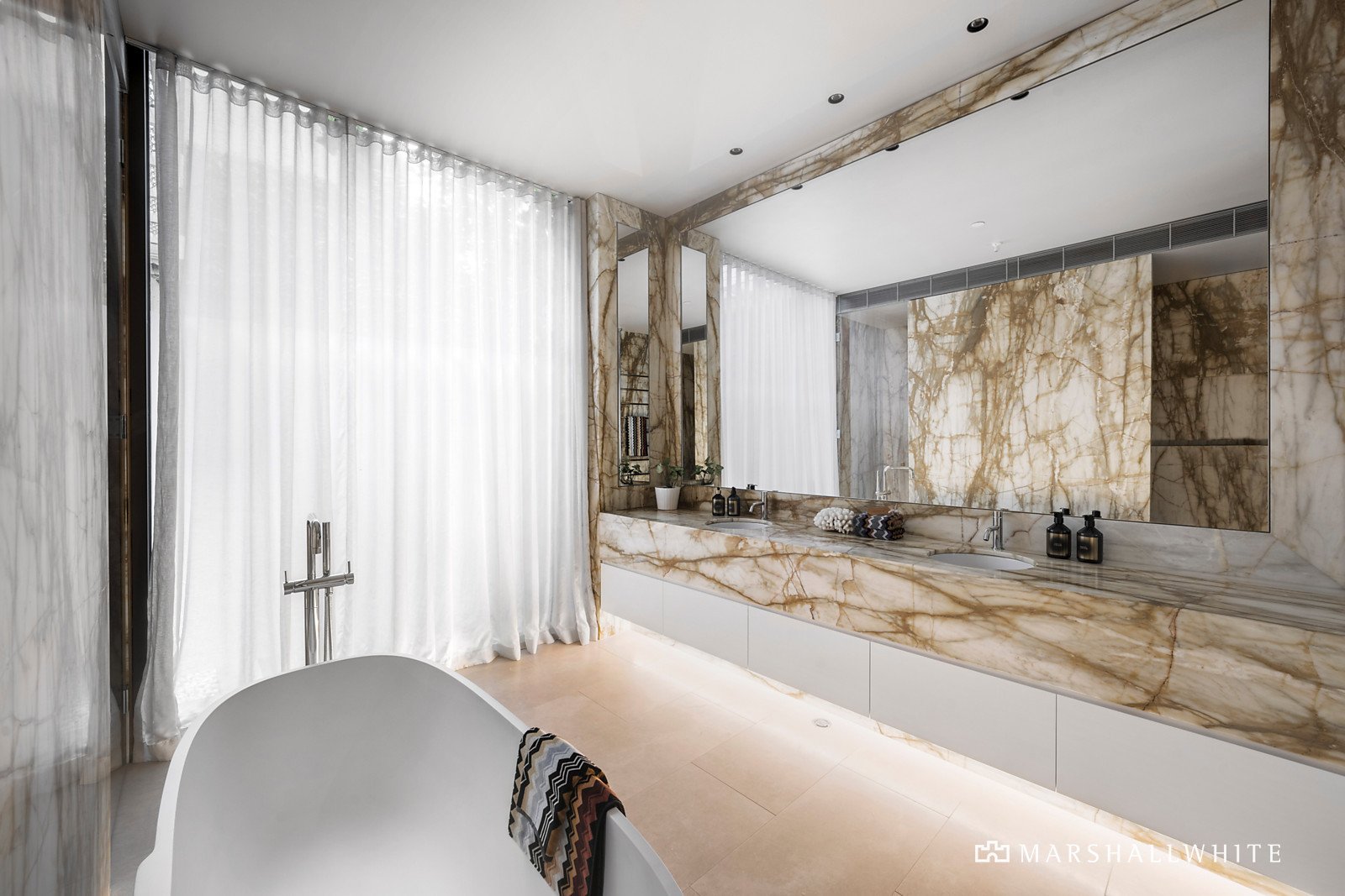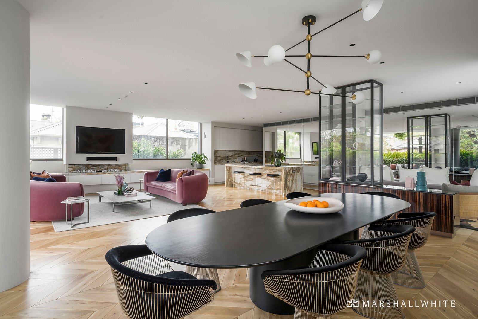 Direct lift entry reveals a light filled central gallery, swathed in rich marble and flowing through to an expansive sitting room with a gas pebble fire and north-facing terrace. Oak parquetry floors and high ceilings define the palatial open plan living, dining and entertaining spaces and the sublime marble kitchen appointed with a full complement of Miele appliances including integrated fridge/freezer and a butler's pantry. The living area extends out to a large covered west-facing Travertine terrace with built in BBQ, ideal for al fresco entertaining. The opulent main bedroom with deluxe marble en suite, dressing room and north-facing balcony sets a benchmark for luxury that is matched by two additional bedrooms with lavish en suites and walk in robes.