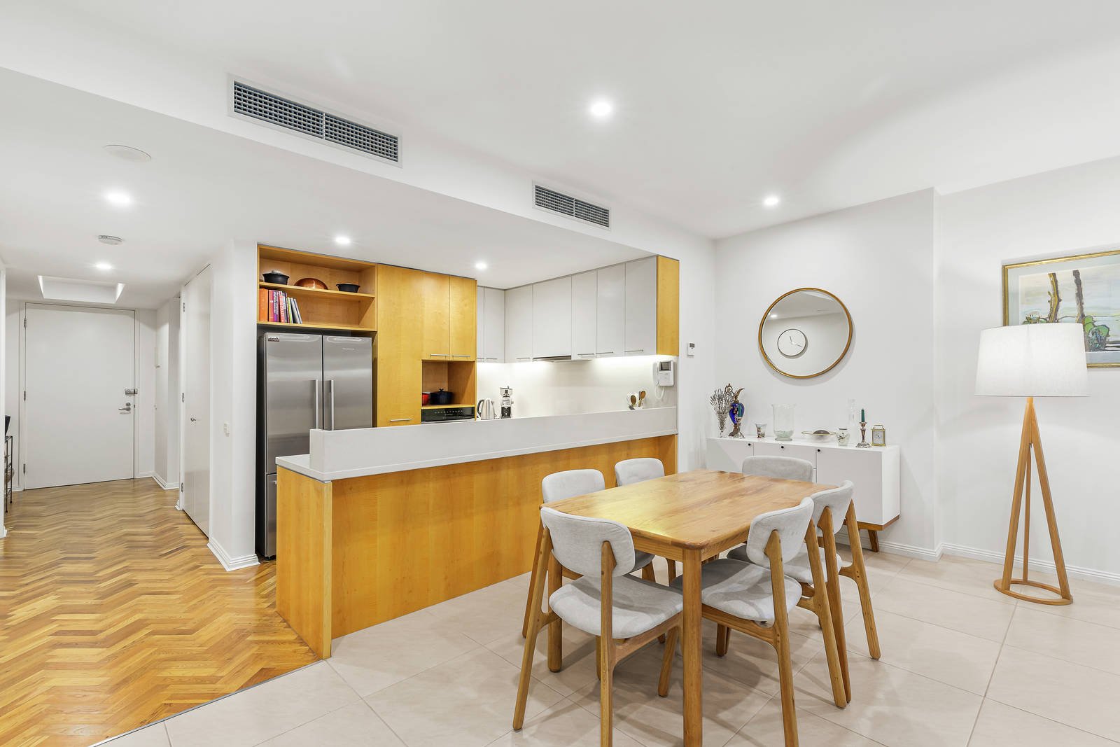 The luxurious interior features herringbone European Oak parquetry floors through the hallway leading to two bedrooms or one plus a study, the main has a WIR and ensuite plus there is a separate laundry and sparkling bathroom. A generous open-plan living and dining room includes a stylishly appointed kitchen equipped with stone bench-tops and premium Miele appliances flowing to a north-east facing walled courtyard with ample room for alfresco dining and entertaining. Other features of this superb home include video intercom entry, ducted heating and cooling, high quality fixtures and fittings throughout, internal lift to a secure basement car space and storage cage.