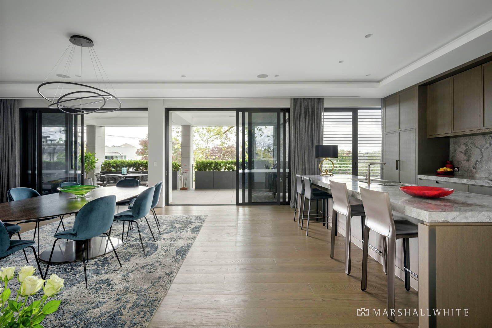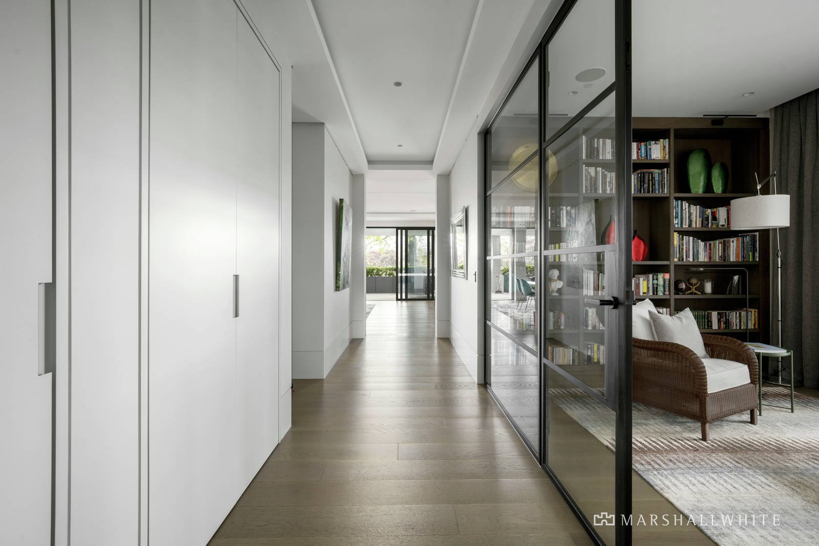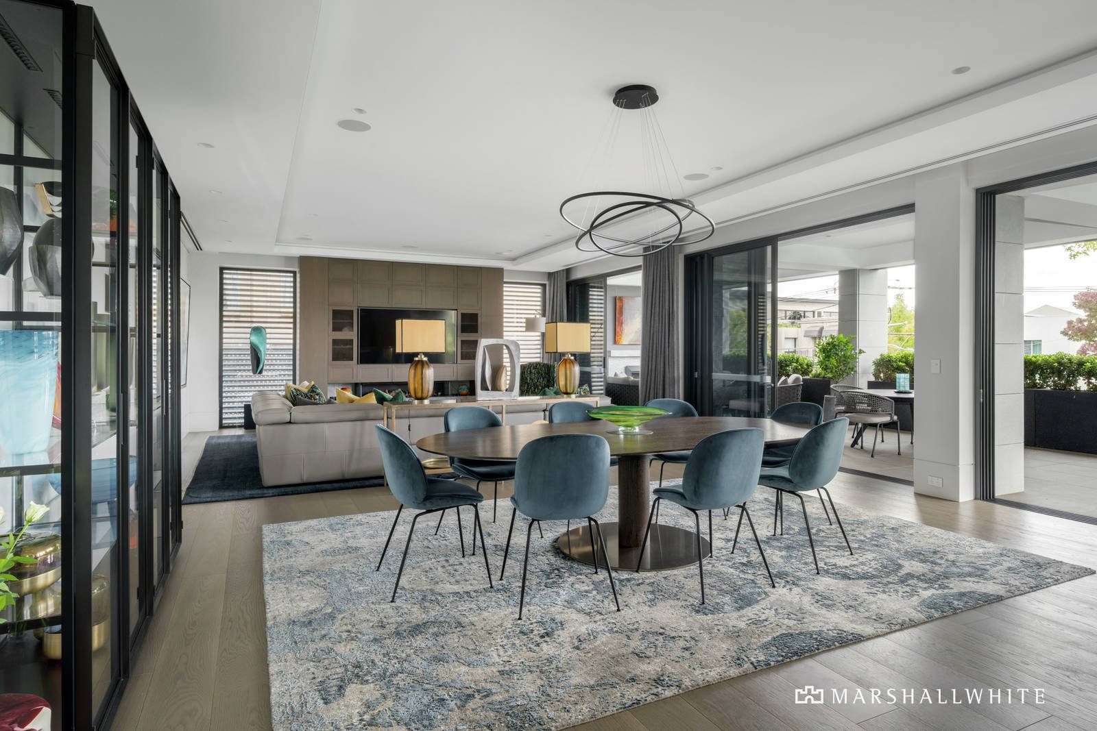 Occupying the northern half of the first level, the beautiful interiors are defined by high ceilings with recessed lighting, wide oak floors, black/bronze steel framed glass, lashings of marble and bespoke joinery. The reception hall featuring a gallery hanging system introduces a refined library or home office, the opulent main bedroom with a deluxe dressing room and designer en suite and two additional double bedrooms with walk in robes and stylish en suites. Nothing short of palatial, the open plan living and dining room with a gas log fire and customised joinery is served by a state of the art premium kitchen appointed with marble benches, Miele appliances, integrated Liebherr fridge/freezer and a full butler's pantry with Vintec wine fridge. Stacking glass sliders extend the living out to a full width north-facing undercover terrace with gas fireplace, an idyllic setting for al fresco dining all year round.