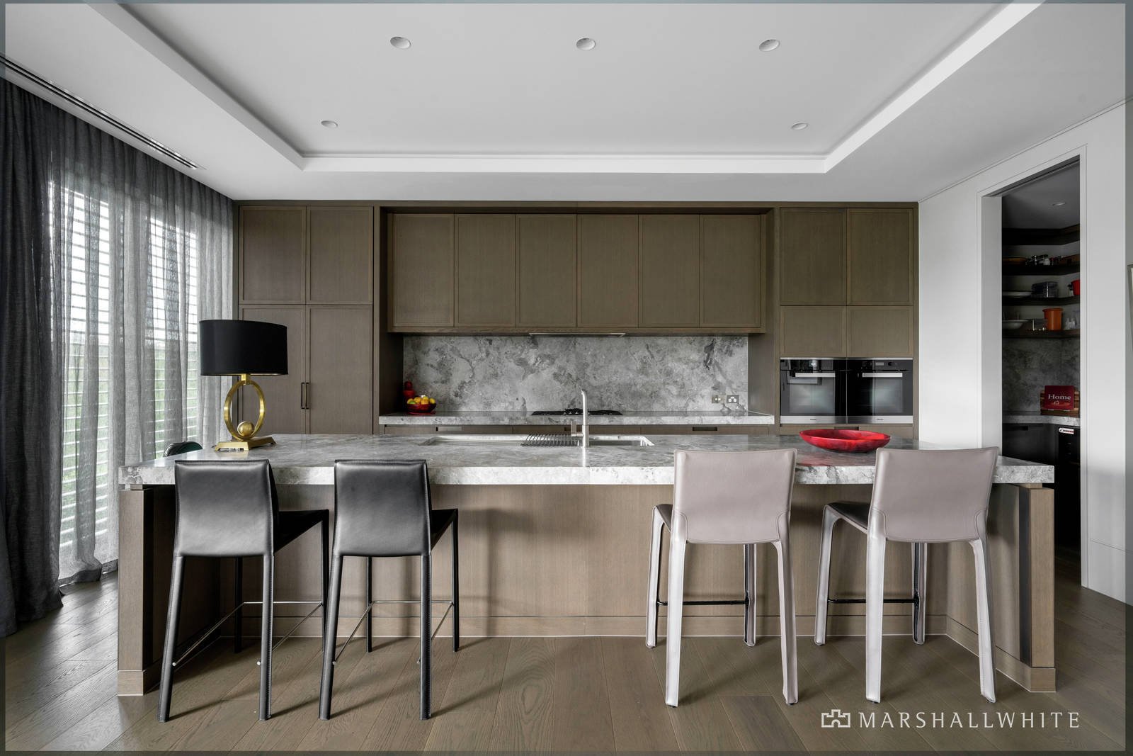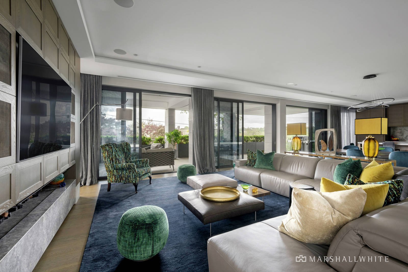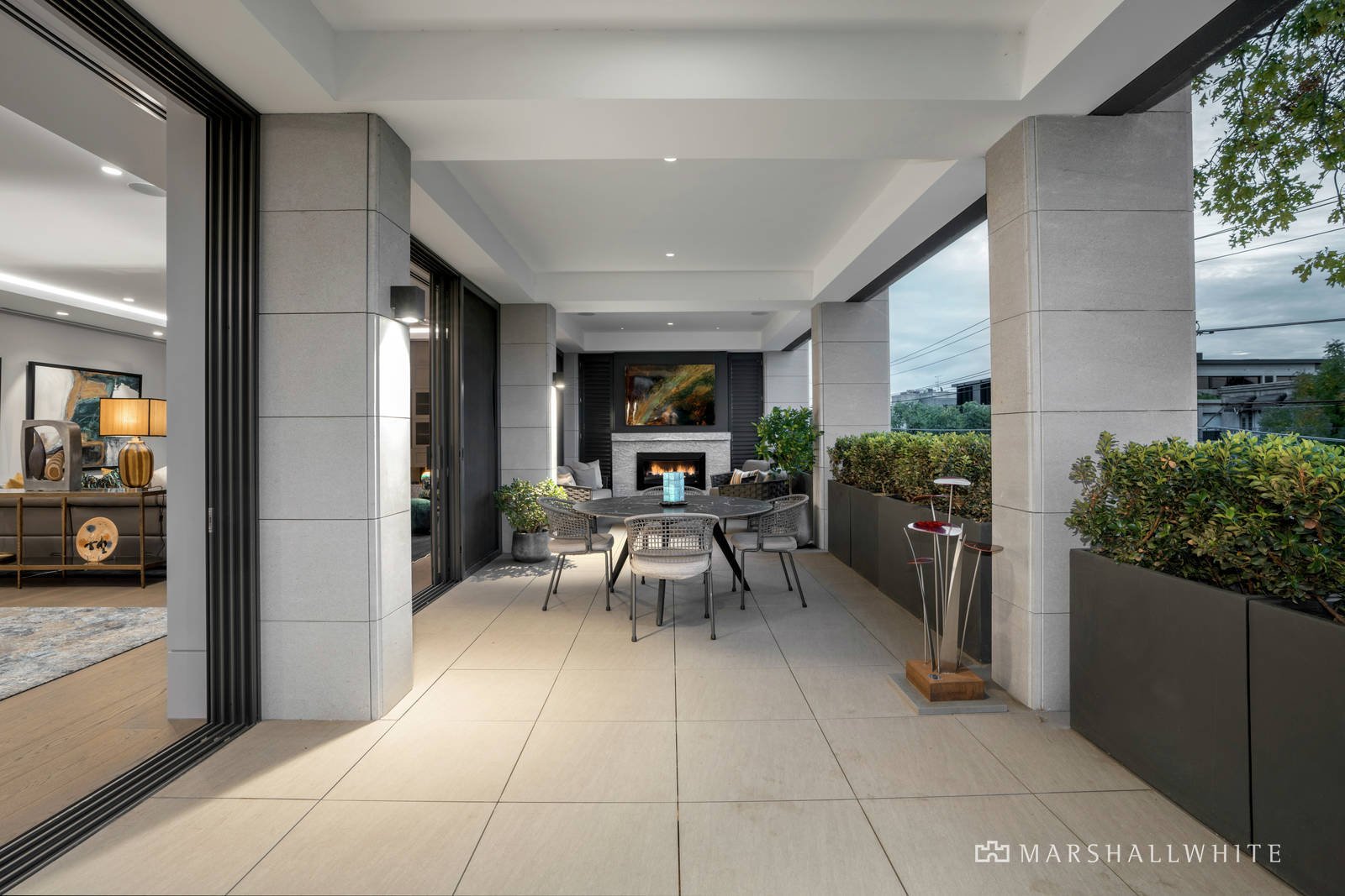 Occupying the northern half of the first level, the beautiful interiors are defined by high ceilings with recessed lighting, wide oak floors, black/bronze steel framed glass, lashings of marble and bespoke joinery. The reception hall featuring a gallery hanging system introduces a refined library or home office, the opulent main bedroom with a deluxe dressing room and designer en suite and two additional double bedrooms with walk in robes and stylish en suites. Nothing short of palatial, the open plan living and dining room with a gas log fire and customised joinery is served by a state of the art premium kitchen appointed with marble benches, Miele appliances, integrated Liebherr fridge/freezer and a full butler's pantry with Vintec wine fridge. Stacking glass sliders extend the living out to a full width north-facing undercover terrace with gas fireplace, an idyllic setting for al fresco dining all year round.
