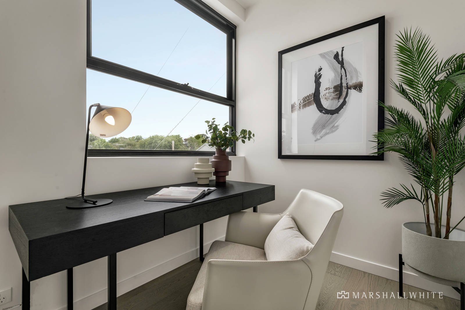 Smokey oak floors and high ceilings add to the contemporary refinement while the floor-plan intelligently separates the accommodation wing from the living spaces. Bathed in northern light, the expansive open plan living and dining room served by a sleek gourmet kitchen boasting white stone benches, Miele appliances and an integrated fridge/freezer opens to a large covered balcony offering sweeping views and a fabulous venue for year round outdoor dining. The serene main bedroom with fitted walk in robes and a lavish en suite with bath complements two additional bedrooms with robes, a stylish bathroom and a study or home office.