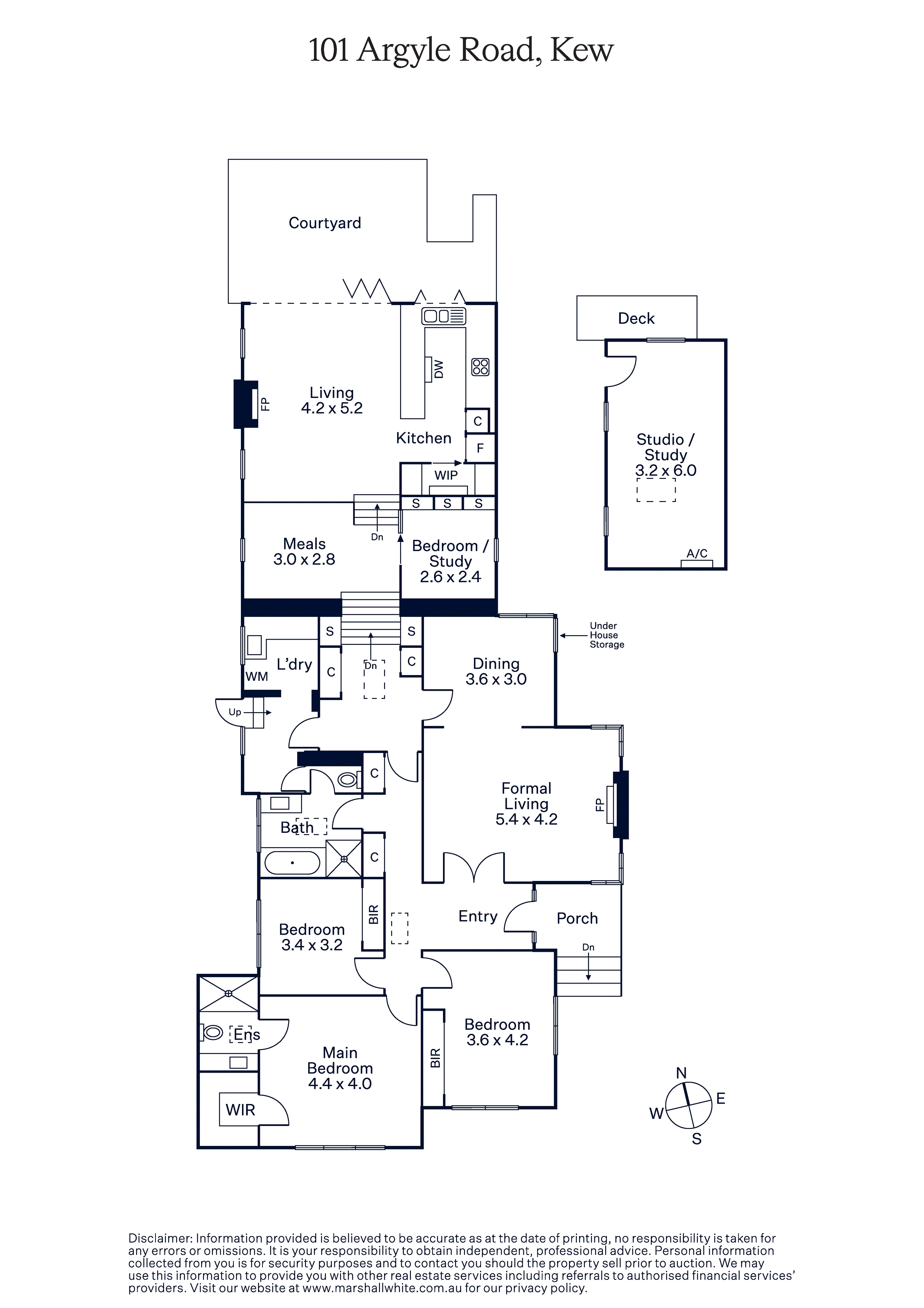 Introduced by terraced, hedge-lined gardens the immaculately presented interior features glossy timber floors and entrance hall opening to a formal sitting room and adjacent dining, three bedrooms, main with fully tiled ensuite and WIR, two with built-in robes plus a sky lit family bathroom and laundry. Flowing to a lower level study, informal dining and generous living incorporating a gourmet kitchen equipped with a F & P 2-drawer dishwasher, Goldstein chef’s stainless steel stove and a walk-in pantry. A servery window and bi-fold doors open to an outdoor dining area with tranquil water feature, gently shaded by Gleditsia trees and overlooking a heated in-ground pool; plus a studio, retreat, home office or fourth bedroom. Other features include alarm, plantation shutters, ducted heating and cooling, OFP, R/C air conditioner (studio), cellar storage, front tandem off-street parking and rear lane access if desired.