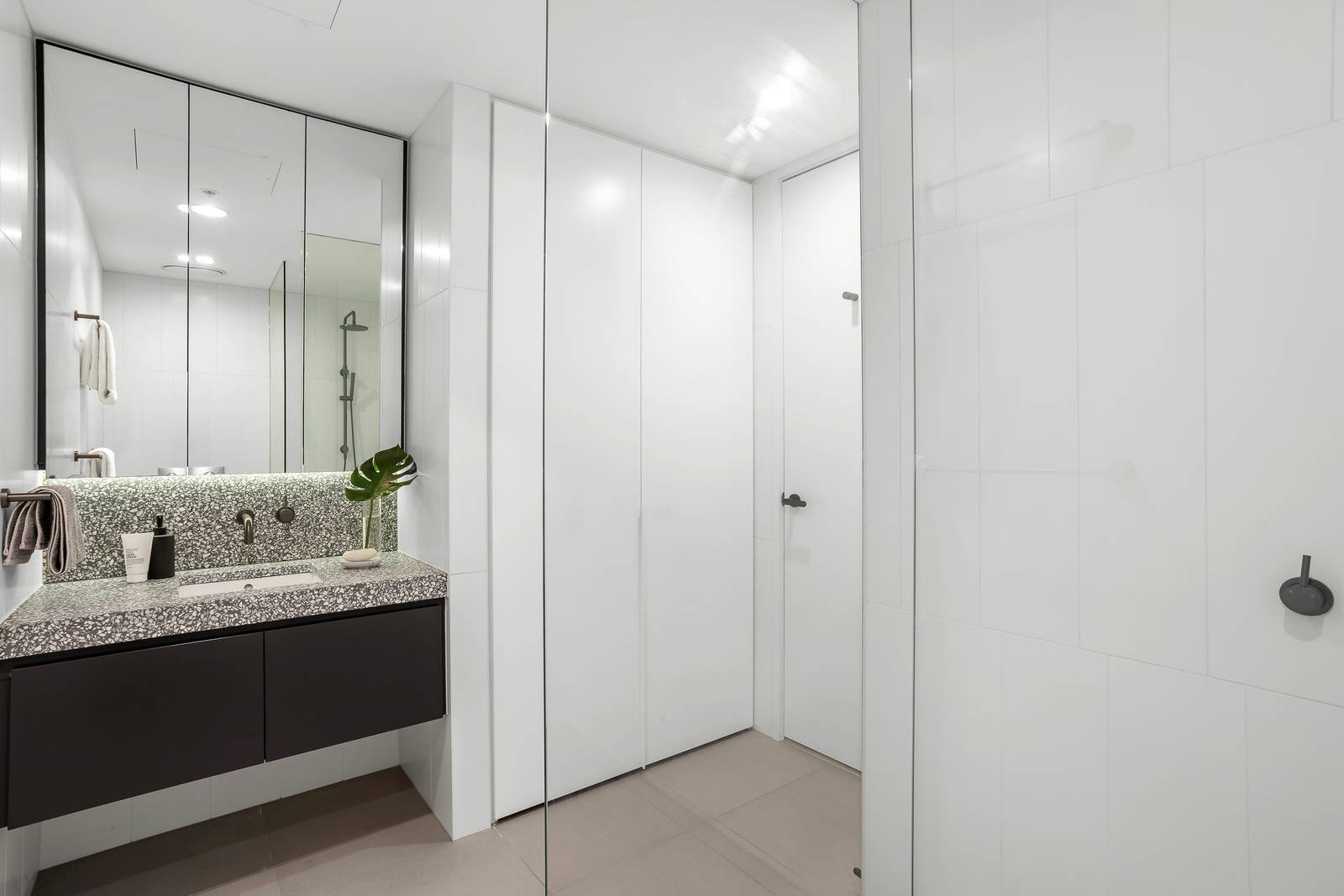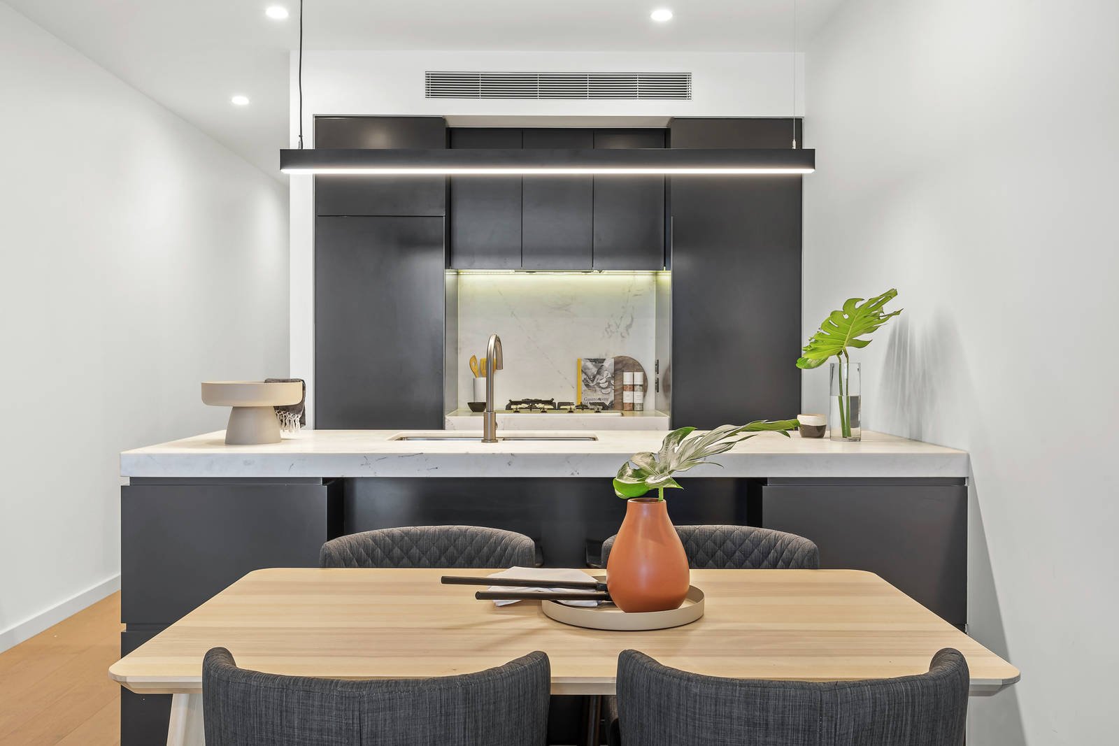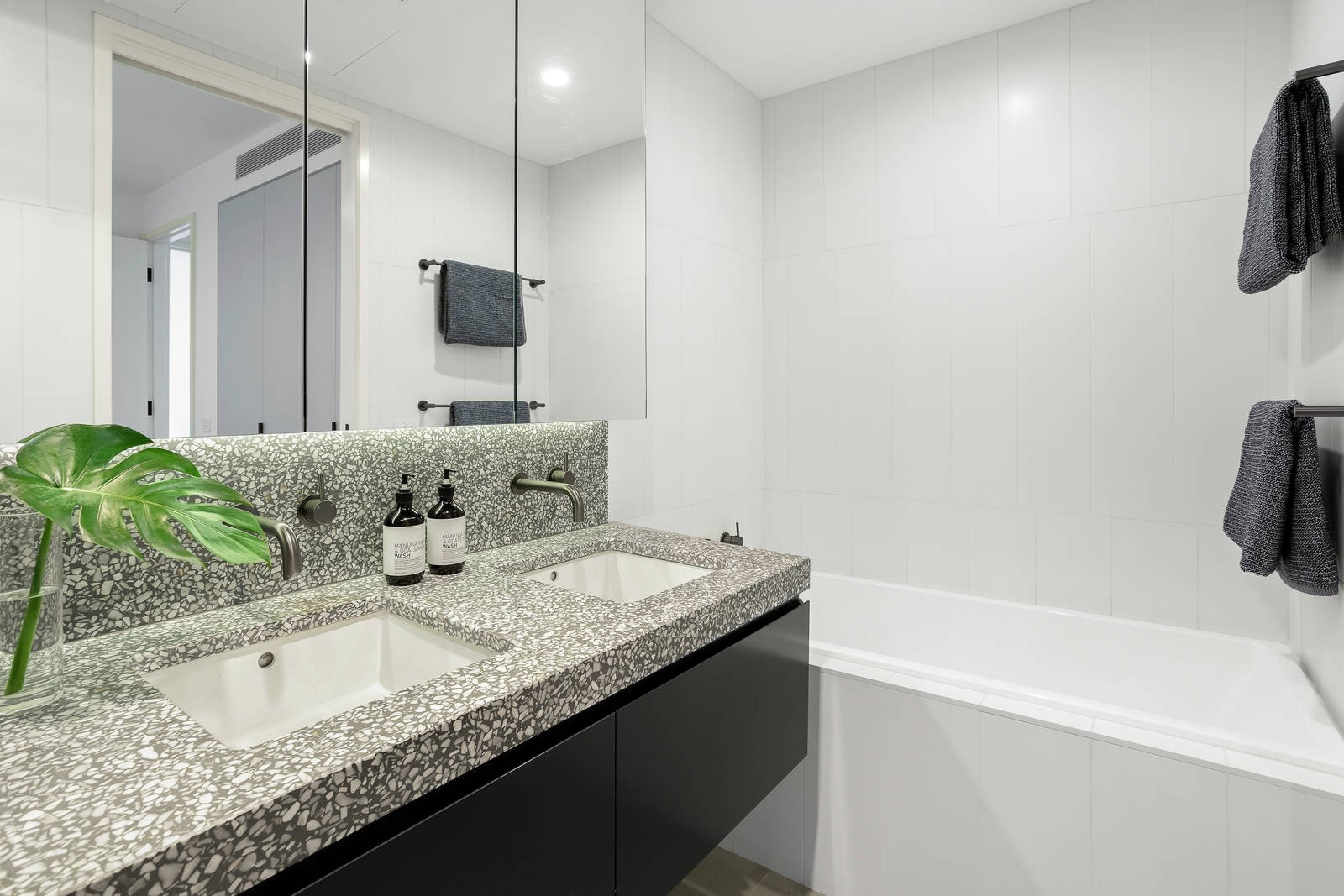 Arranged around a striking stone-topped island bench, with superior Miele appliances and an integrated refrigerator, the open-plan kitchen / dining / living is a wonderful place to gather with friends, whilst large glass sliding doors provide an easy flow to a private balcony that is largely undercover. The master bedroom is large with a terrazzo stone-topped ensuite that is themed to the main bathroom, plus there is an alcove study nook and generous built-in robes. Accessed securely via video entry, the home also features two basement parking spaces, storage, elevator access, robes in the second bedroom, European Oak flooring and central heating as well as air conditioning.