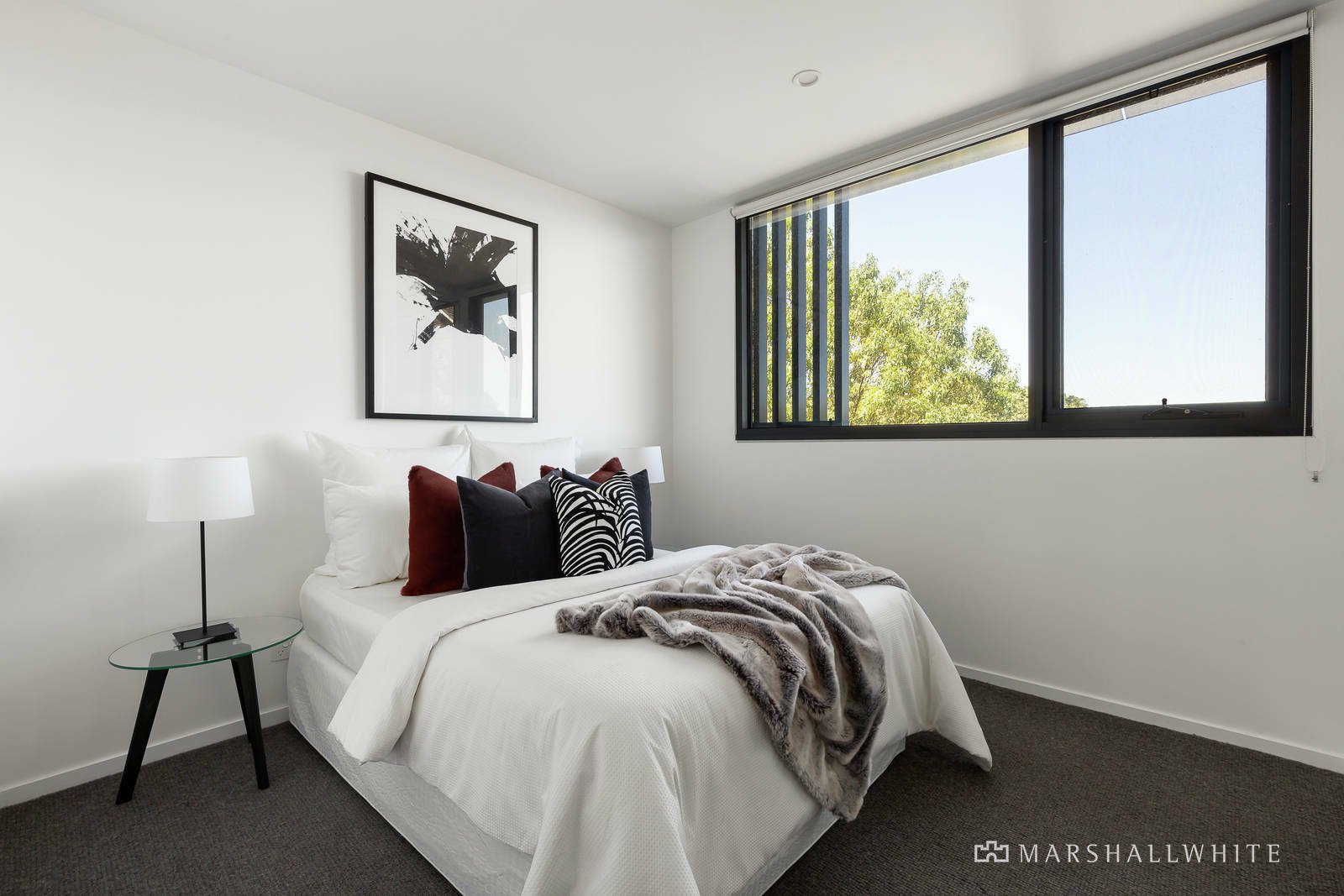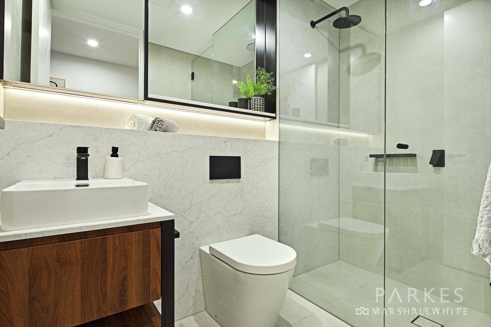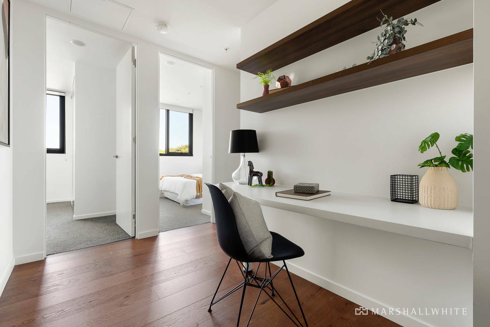 Both bedrooms feature well-appointed built-in robes, while a custom study nook with built-in desk provides the ideal work-from-home solution. The bathrooms exude luxury, with floor-to-ceiling stone tiling, polished steel tapware, and indulgent rain showers.