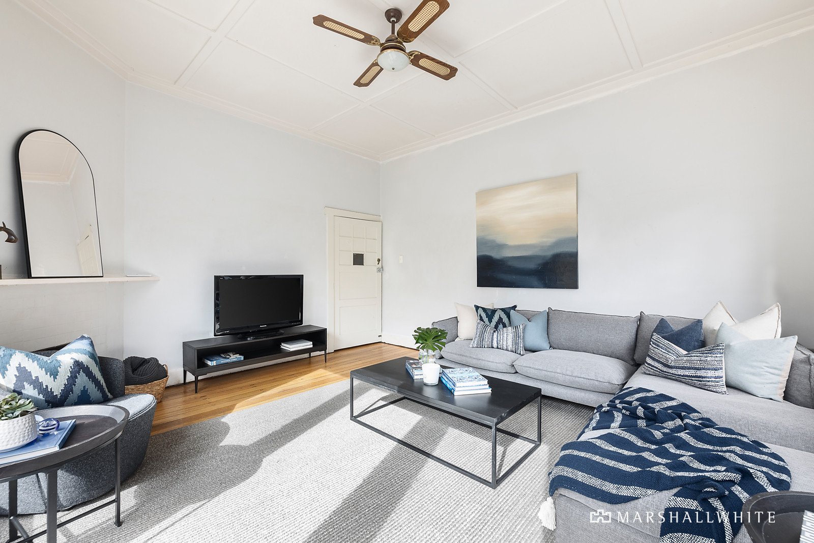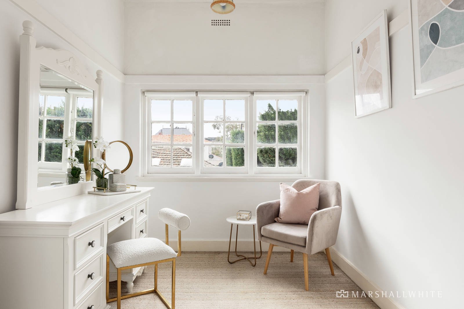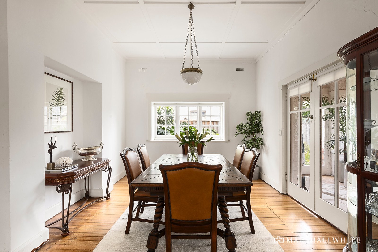 Polished timber floors and original ceilings distinguish the gracious sitting room and adjacent dining room served by a gourmet kitchen appointed with granite benches and Miele oven. The family living room with an open fire opens to the deep north-facing private garden and double garage. An abundance of versatile accommodation comprises a downstairs bedroom with fireplace and marble bathroom, while upstairs there are four additional spacious bedrooms, two studies, a dressing room and bathroom.