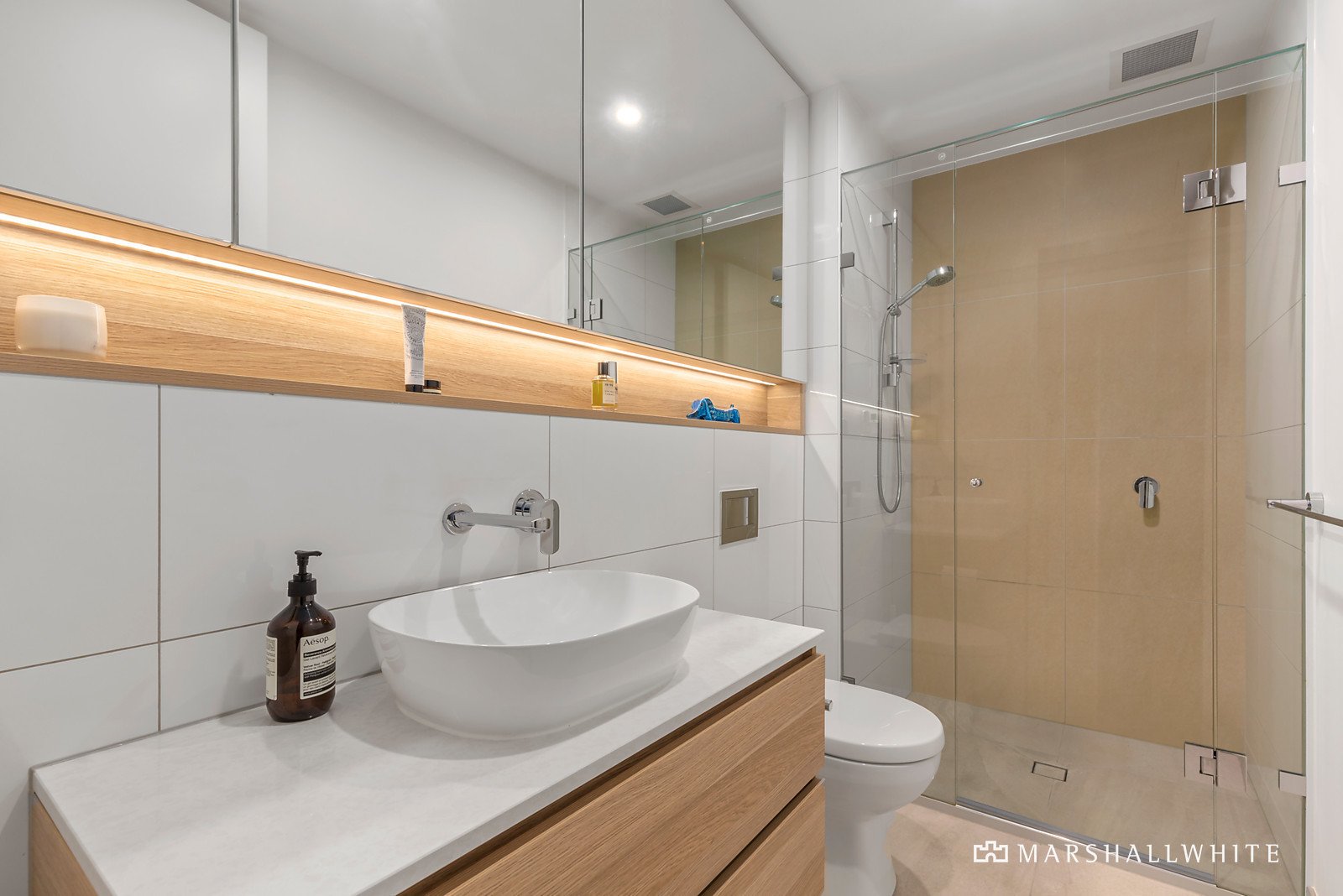 High quality fixtures and fittings run throughout. The contemporary kitchen includes a full suite of Miele appliances (including an integrated refrigerator and dishwasher), with striking stone benches and smoky glass splashbacks. It opens to the bright, northerly-facing meals and living zone, flowing effortlessly through floor-to-ceiling, double-glazed sliding doors to a balcony ideal for alfresco dining.