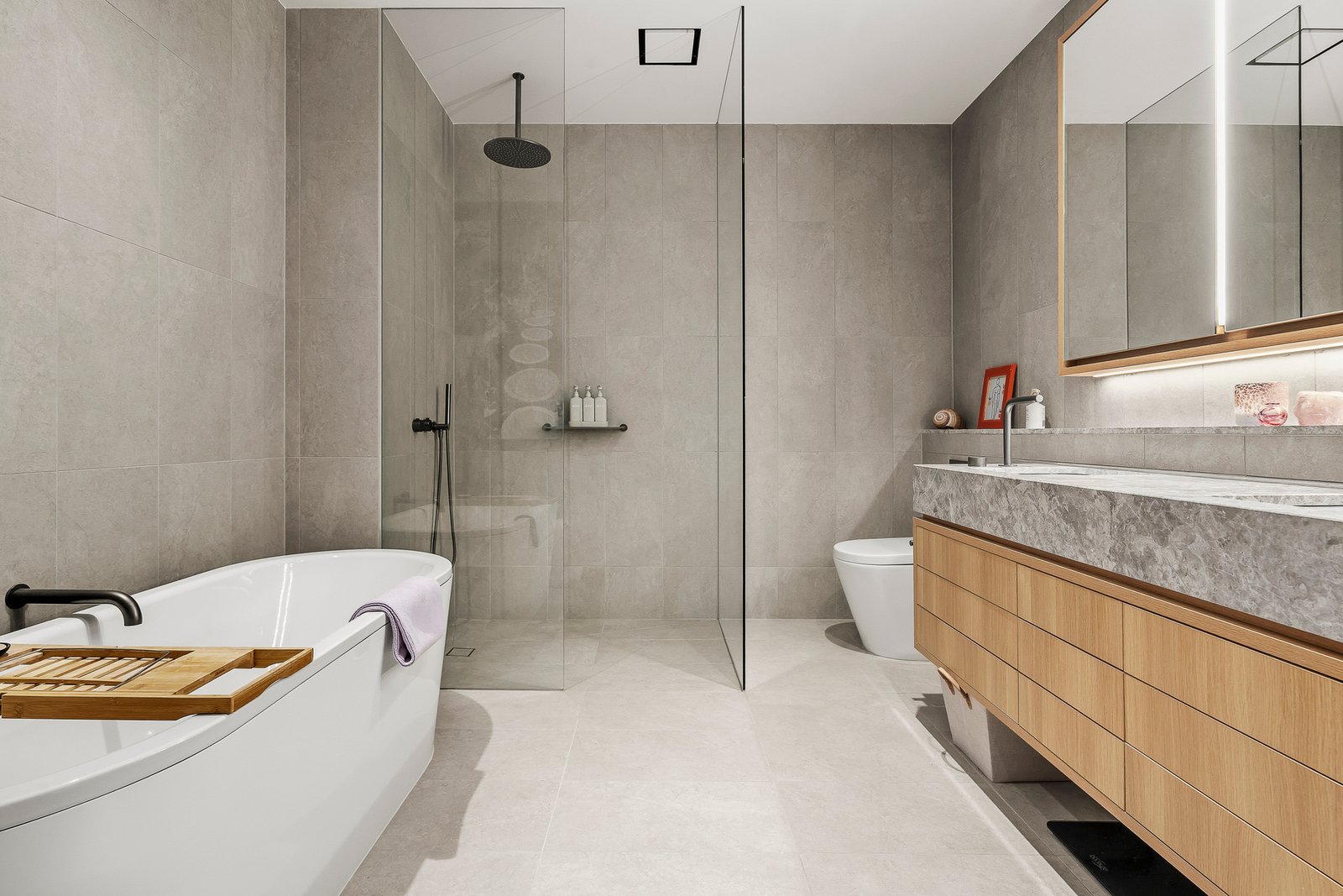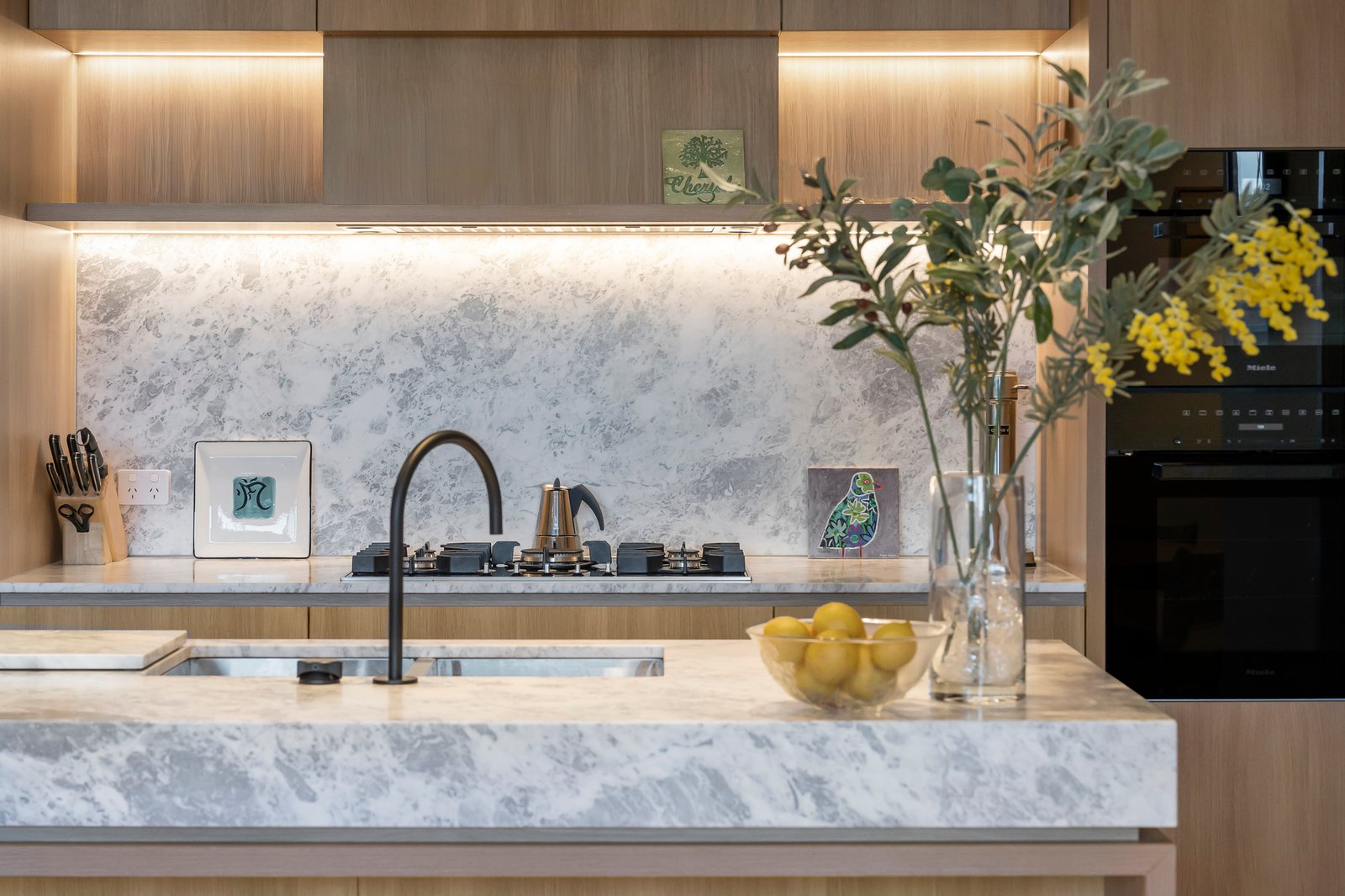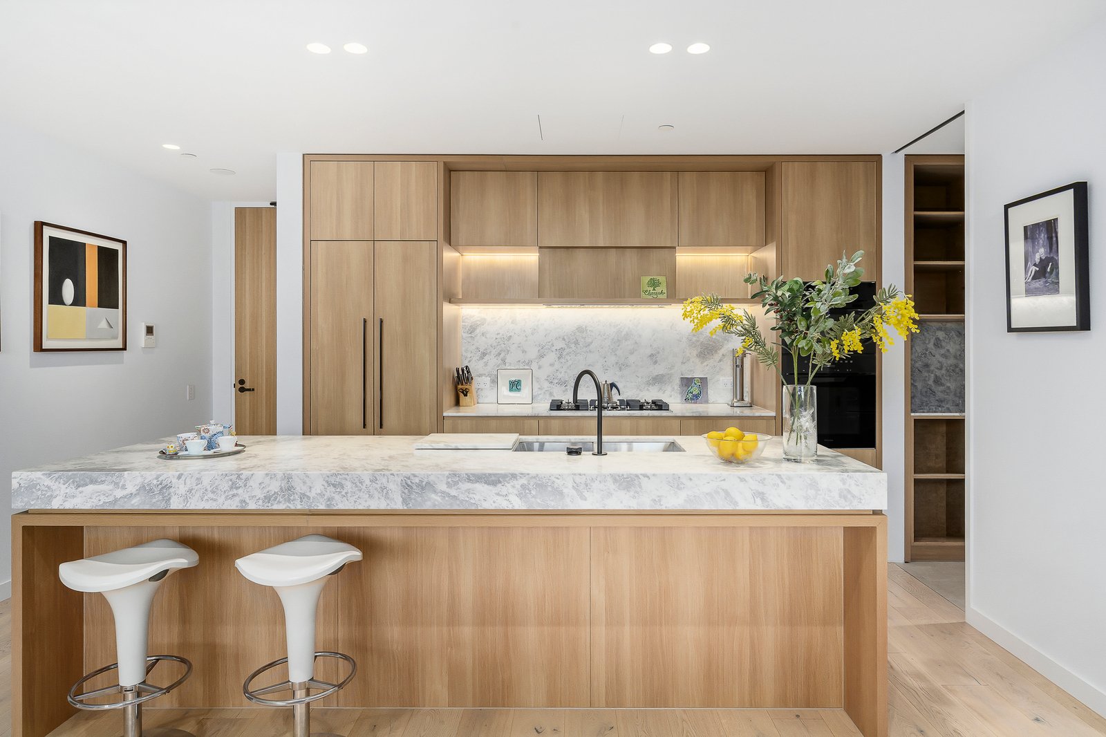 Designed by Fender Katsalidis architects, the north-facing open plan layout, incorporating a wide garden-edged balcony, is complemented by a harmoniously curated materials palette of engineered oak, natural stone, and bespoke timber joinery. A marble island/breakfast bar defines the culinary space, equipped with two multi-function Miele ovens, a gas cooktop, integrated dishwasher and an integrated Fisher & Paykel fridge/freezer, while an adjoining butler’s pantry/laundry adds to the home’s functionality and entertaining amenity. With sumptuous pure wool carpet underfoot, the light-filled main bedroom has verdant treetop outlooks across the balcony, a fitted walk-through robe and a five-star ensuite with a freestanding bath, walk-in shower and twin marble vanities. The second bedroom features a custom fit-out, built-in robes and is adjacent to the second bathroom with walk-in shower.