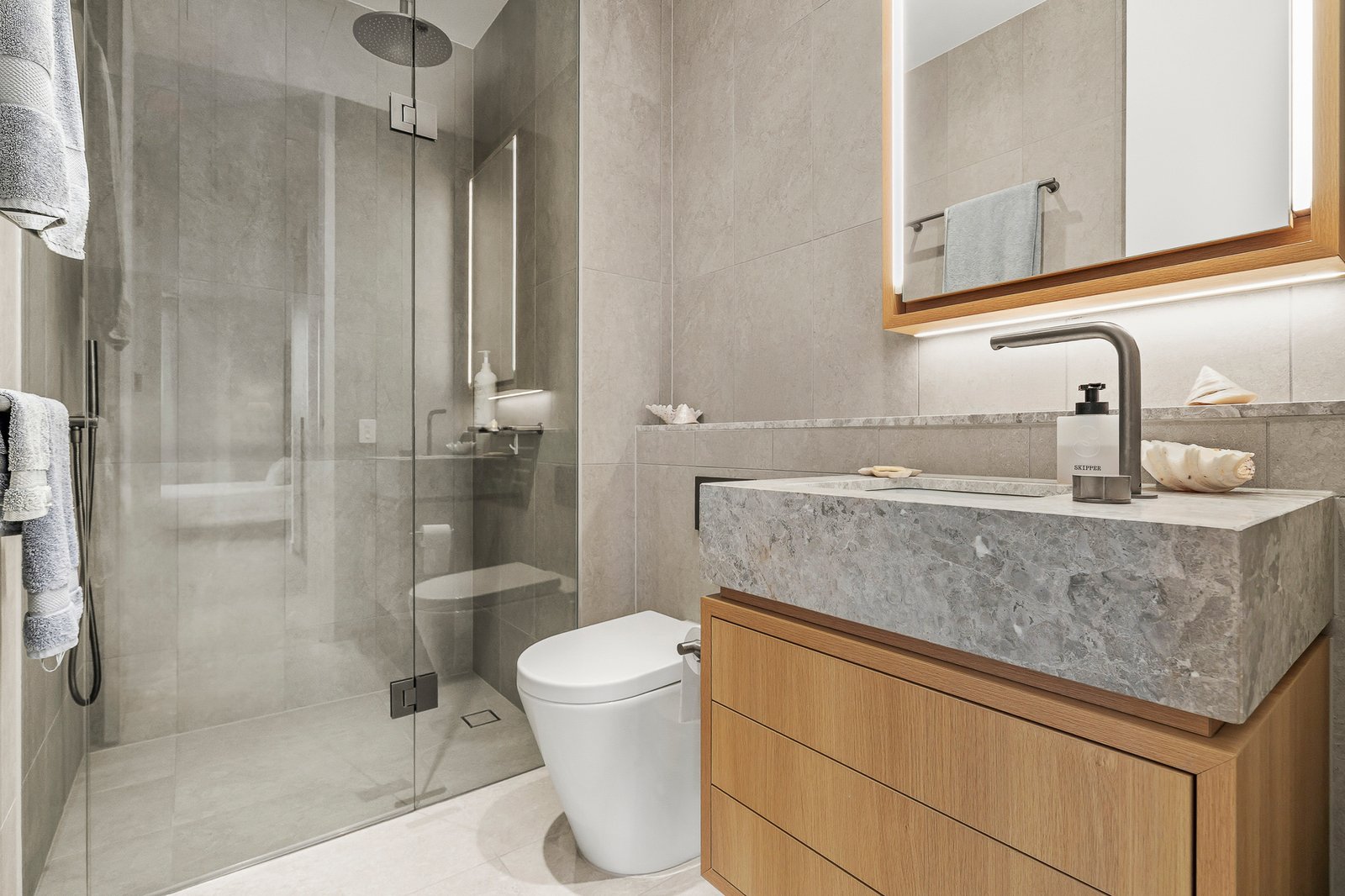 Additional features include individually zoned central reverse cycle heating/cooling, double glazing, video intercom, keyless entry, and lift access to two basement parking spaces, and storage cages. Residents’ communal facilities in the basement include a dog-wash, a car wash, and bike storage and workshop area with compressed air.