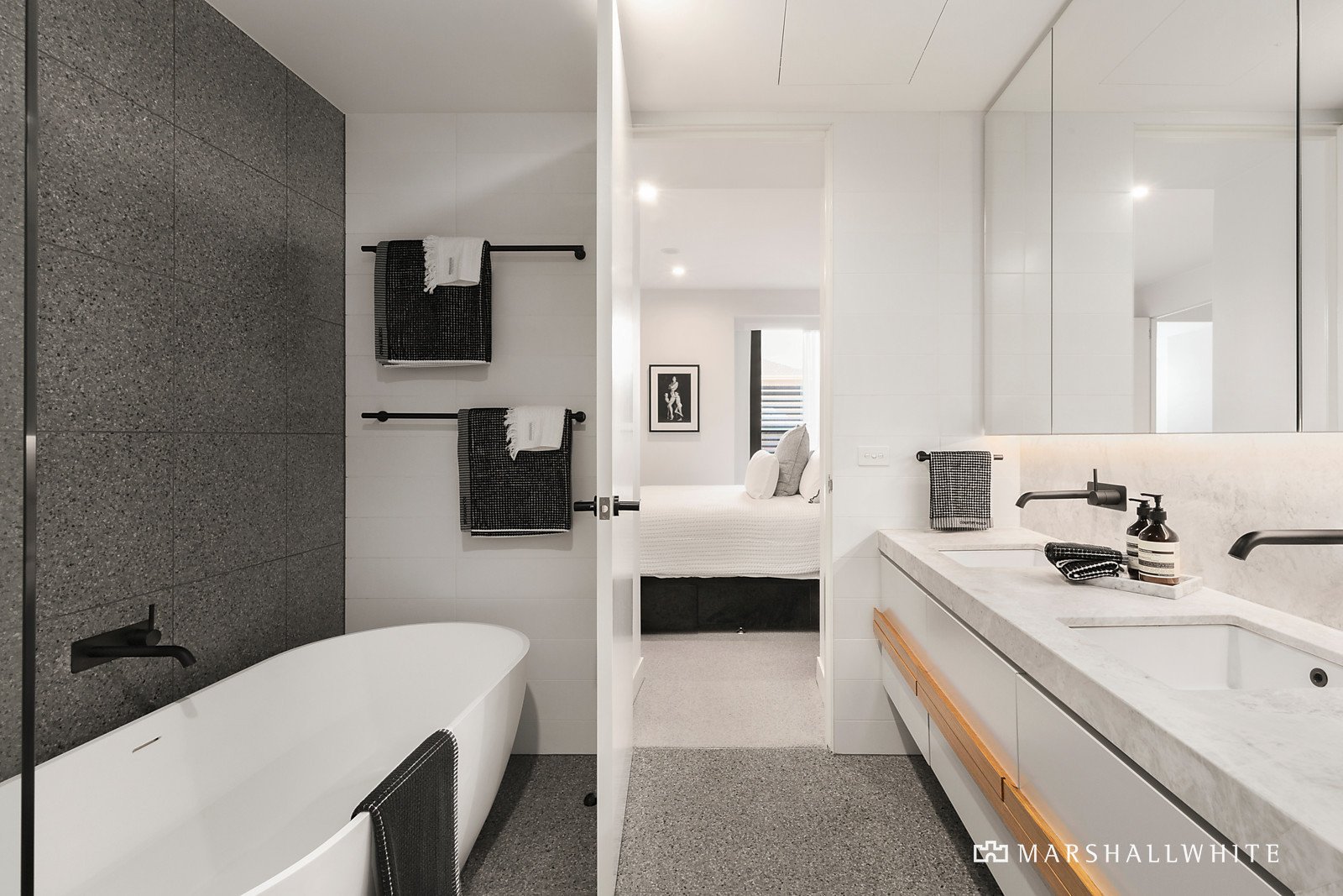 Organised around a striking, over-sized marble bench, the Miele-equipped kitchen / dining / living invites proud entertaining with a built-in marble bar, a bar fridge and a seamless extension through double glazed sliding doors to an undercover alfresco dining area that creates the reality of an outdoor room. Both the main bathroom and the main bedroom’s ensuite – with a double basin vanity, bathtub and independent shower - are exceptionally large, fully-tiled pamper zones, where the use of marble continues to the tops of sleek, wall-mounted vanities.