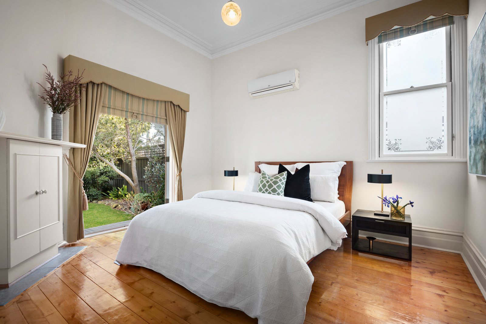 Reclaimed Baltic Pine floorboards continue the traditional theme in the upper-level extension designed for contemporary self-contained living with optimum light and sea views. There is a spacious living area with French door access to a private balcony, a sea-facing study space, a built-in kitchenette or wet-bar, two bedrooms with built-in robes, and a luxe marble bathroom with a two-person spa bath. The home also features three reverse cycle heating/cooling units, two Nobo electric heating wall panels, and gas ducted heating.