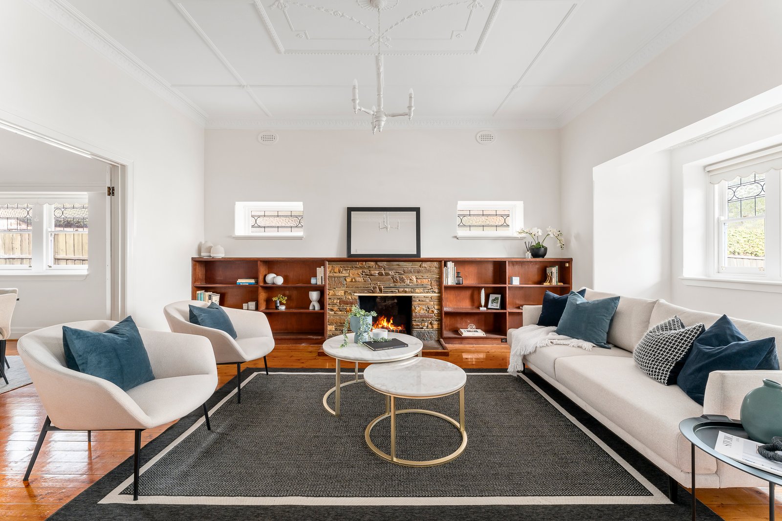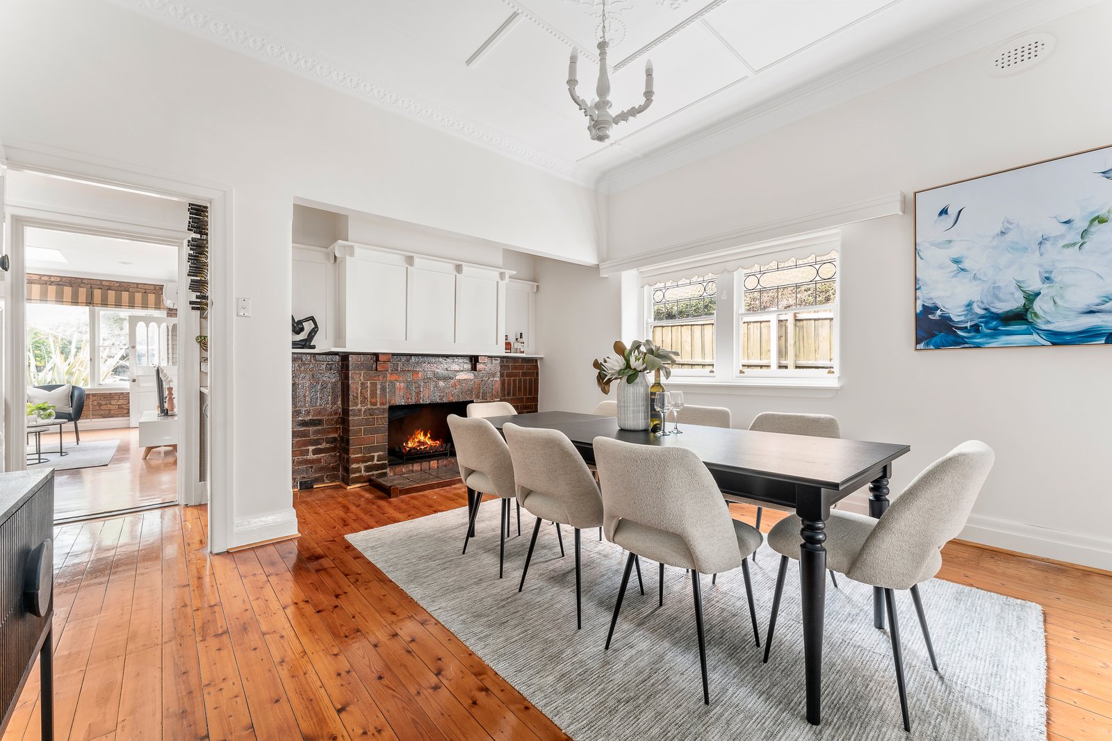Set well back from the street behind a broad verandah, the double width entrance hall flows through to a gracious sitting room and an elegant formal dining room, both featuring fireplaces, ornate ceilings, leadlight windows and timber floors. The well-equipped skylit kitchen is adjacent to a generous family room opening to the private leafy north-facing garden. The beautiful main bedroom with window seat and built in robe is accompanied by three additional bedrooms, a home office and two pristine bathrooms.