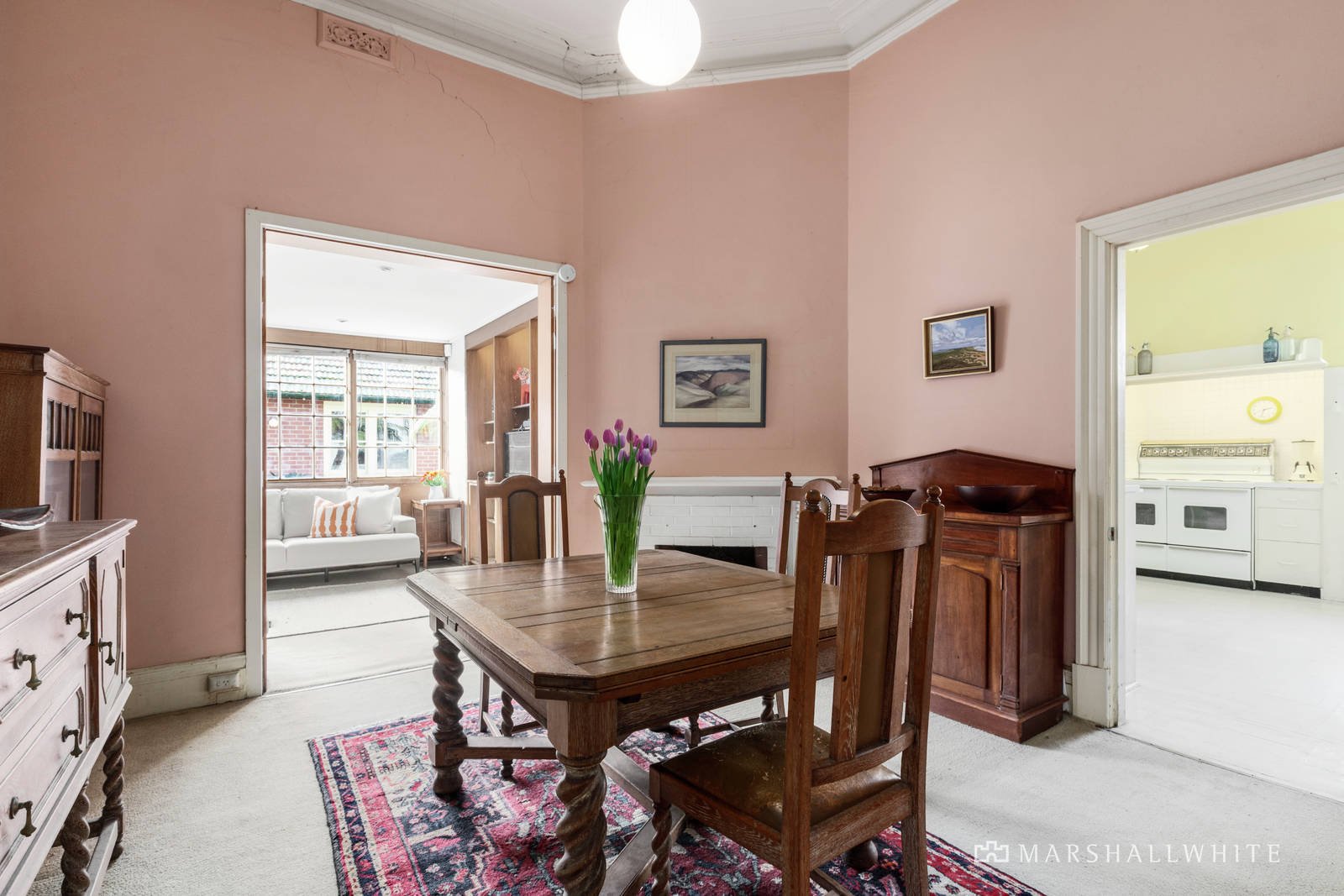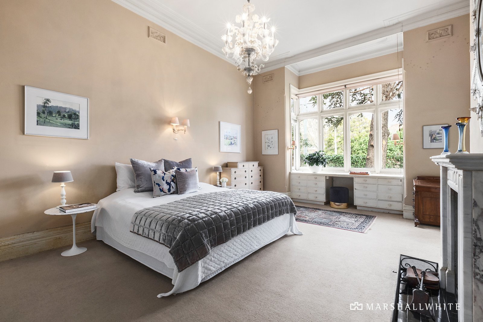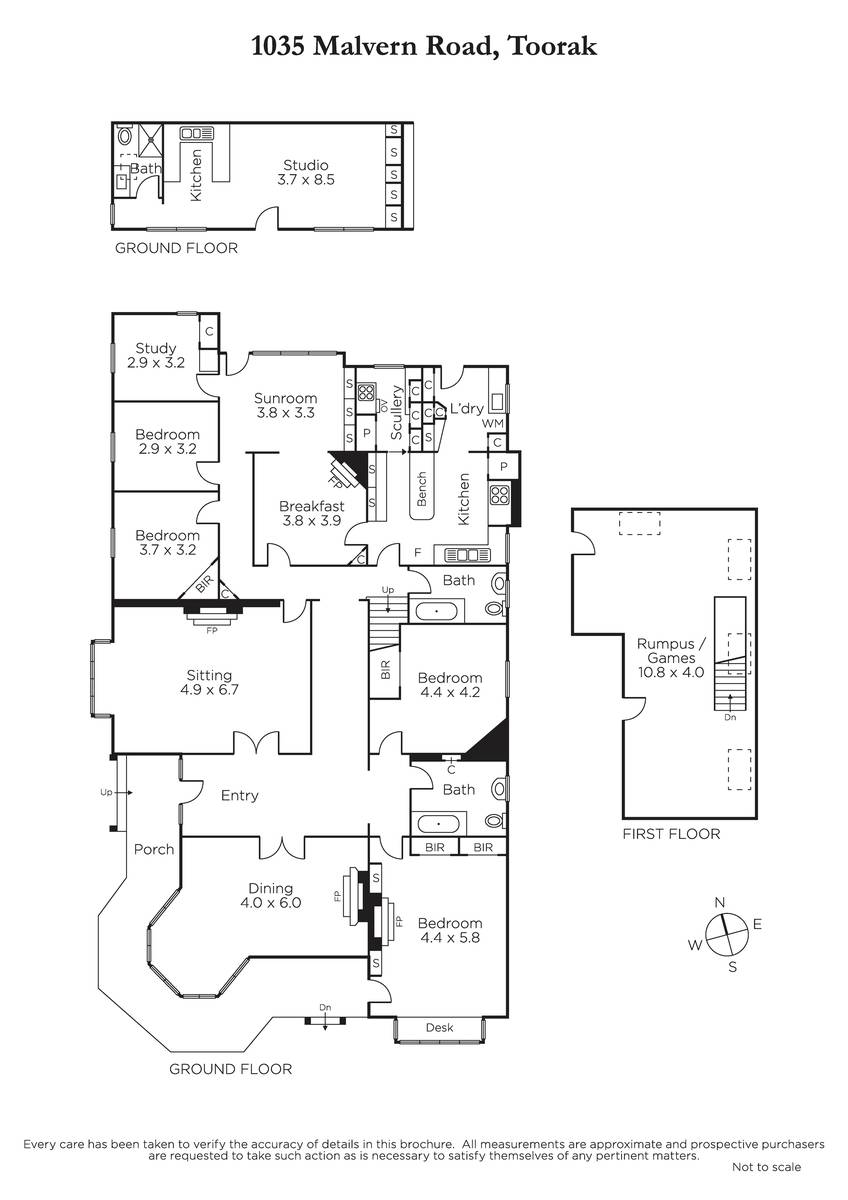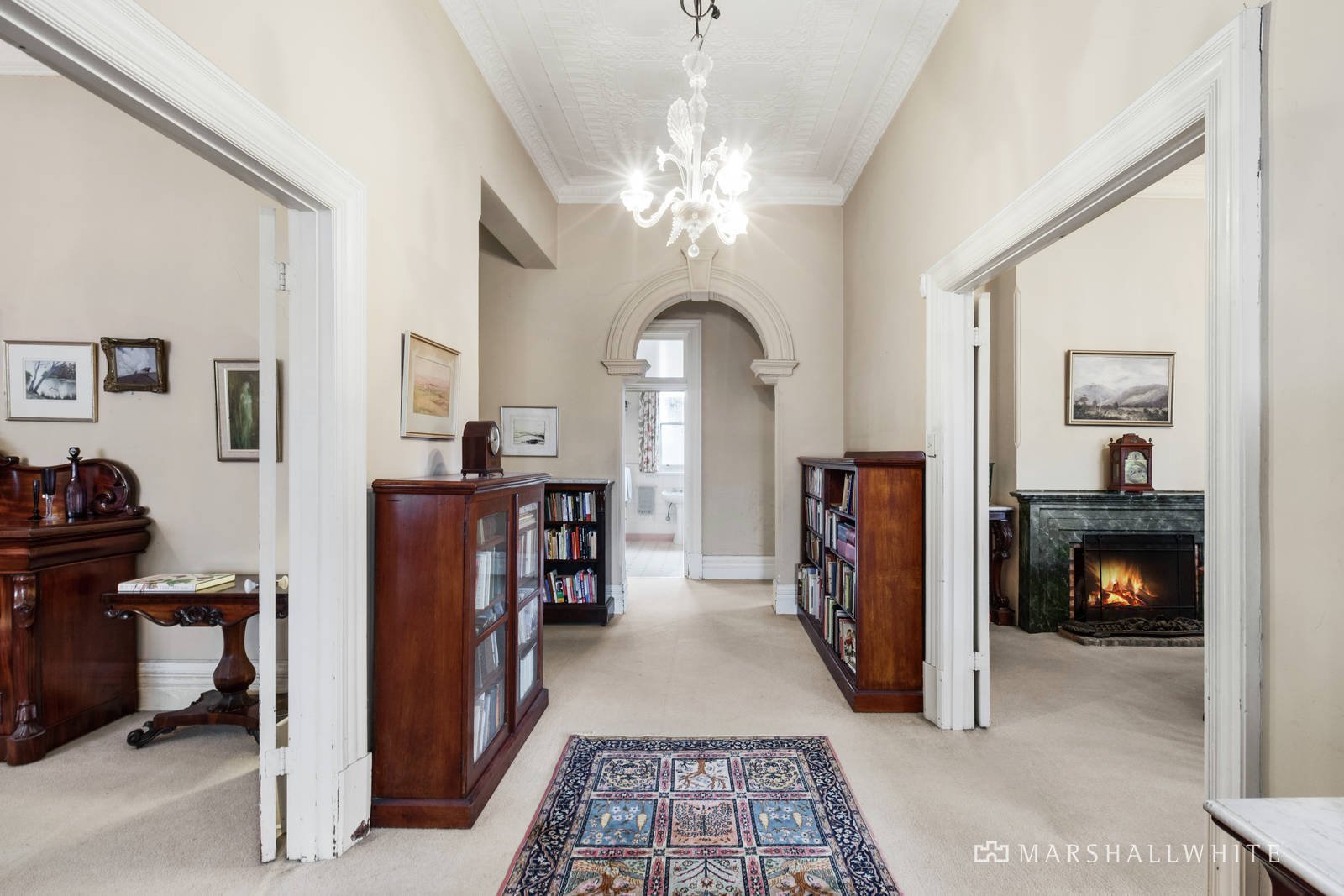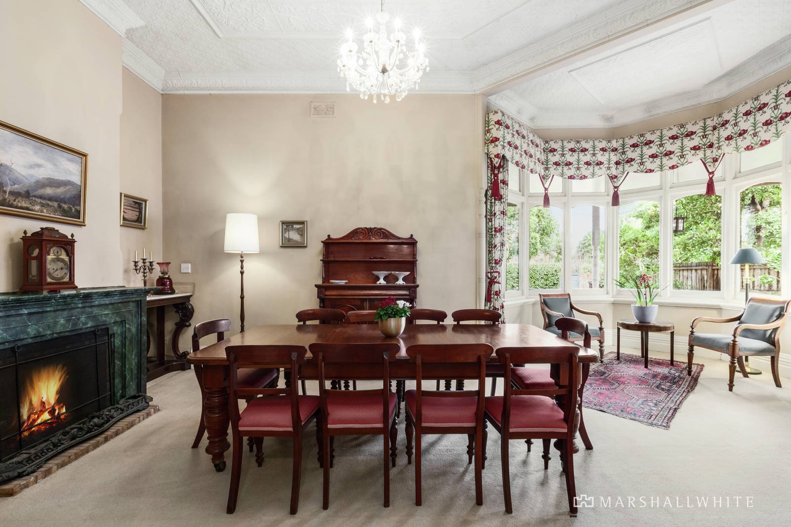 Beyond an impressive verandah, a broad entrance hall with soaring ornate ceilings and decorative archway flows to a pair of formal rooms, each featuring a bay window and marble fireplaces. A main bedroom offers a spectacular chandelier, marble fireplace, window desk and BIRs, while a generous family bathroom sits adjacent to a second double bedroom with BIRs. Accessing rooms in every direction, a central casual dining room leads to a further two bedrooms, study, a delightful north-facing sunroom and a sizeable kitchen with classic cooktop, ovens, and scullery with built-in cabinetry. A second family bathroom and separate laundry with external access complete the downstairs interior. Upstairs leads to a fabulous retreat area with charming loft ceilings comprising vast space for a variety of uses, be it a teenage retreat or additional storage space.
